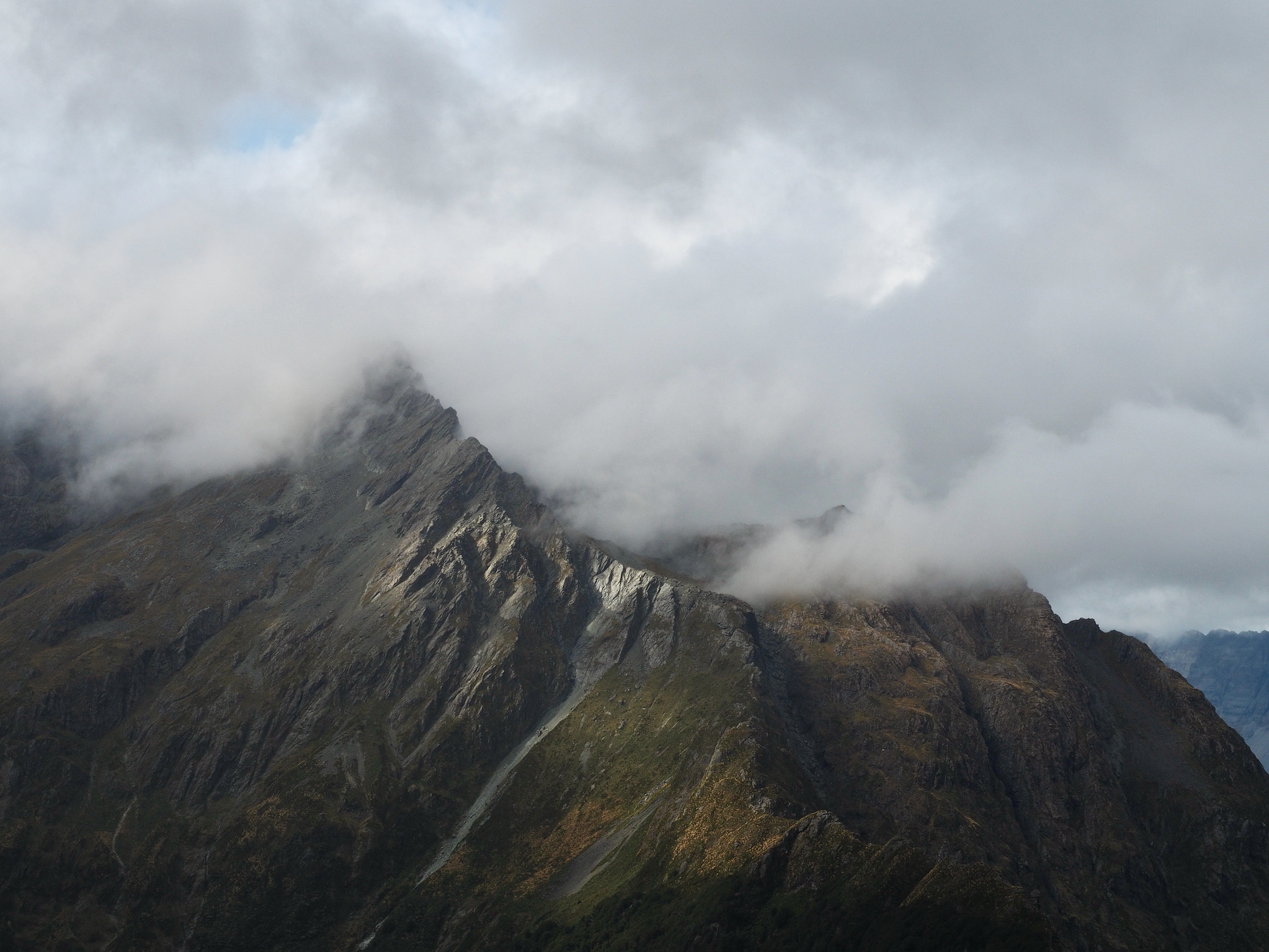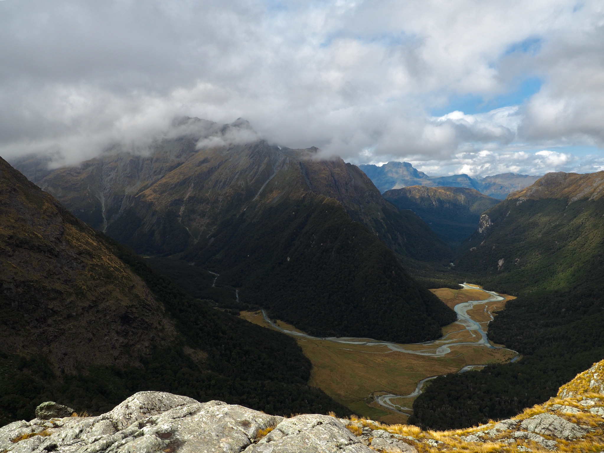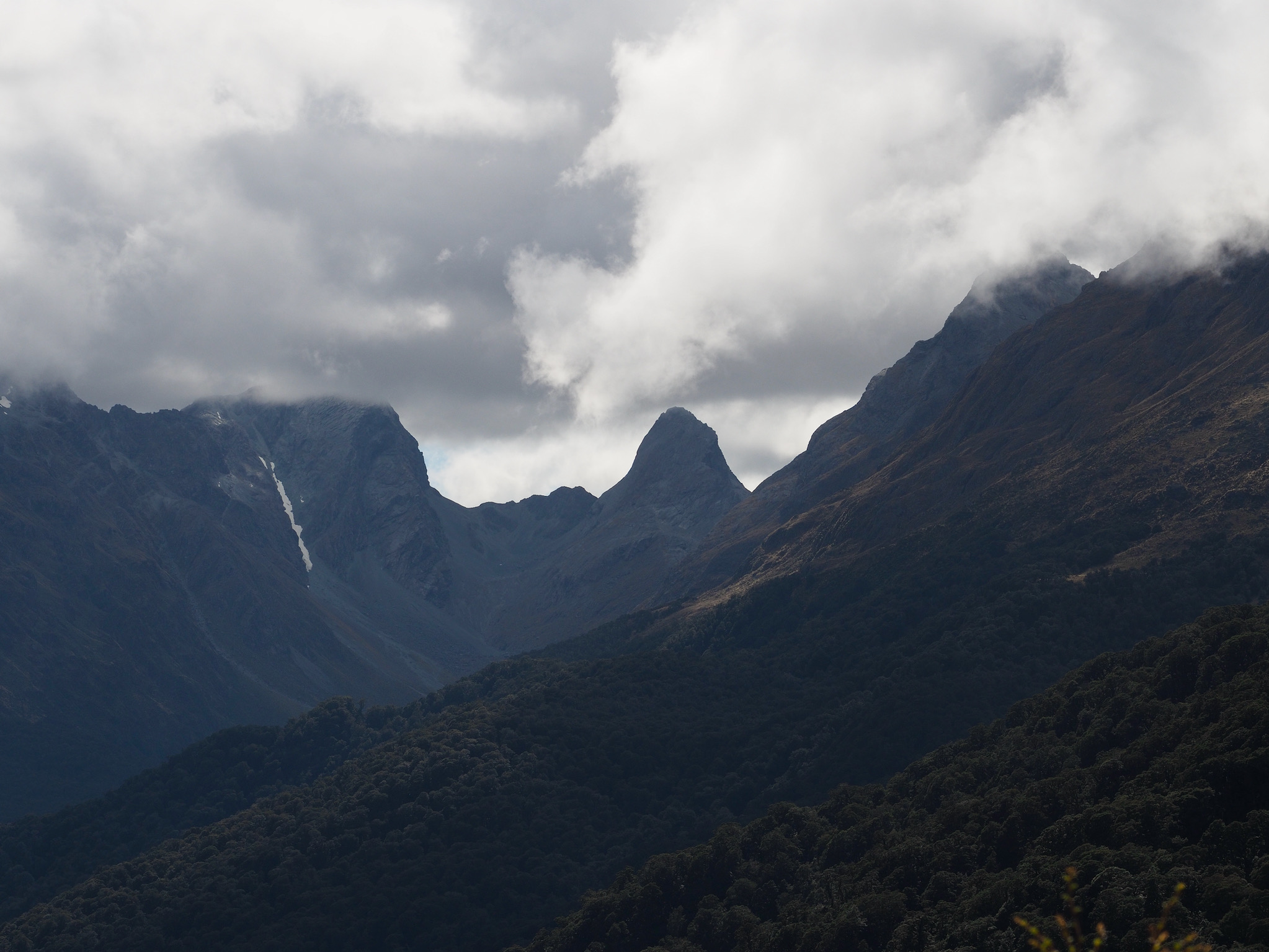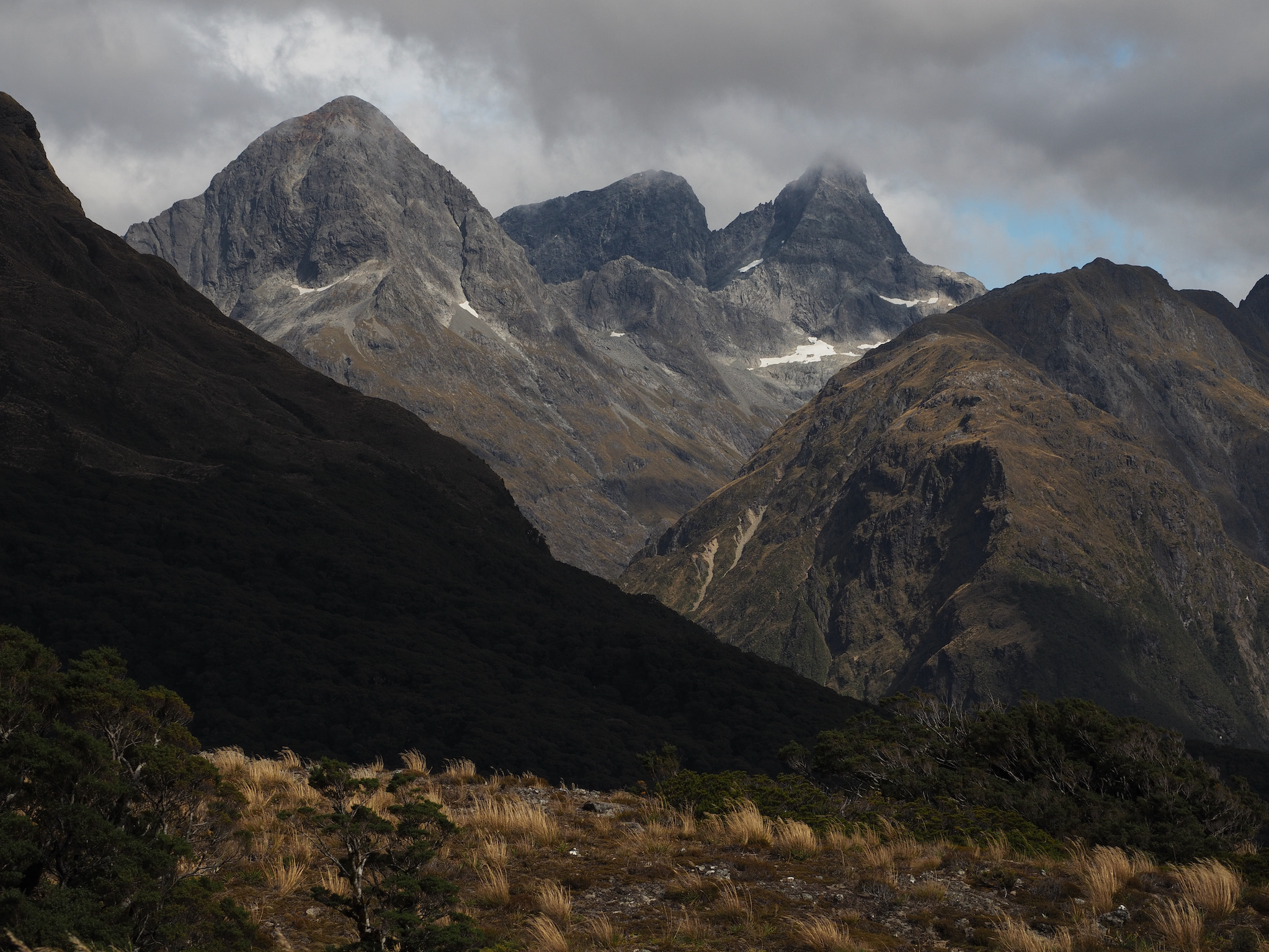 After we warmed up, we started to see patches of blue sky. We did not want to let this opportunity go to waste, and so we hiked back up the valley, retracing some of our steps from earlier in the day. After climbing a bit, we could see that the clearing did not extend back to Harris Saddle or Harris Lake–they were still clouded in–and so we instead set about finding a vantage point back down the Route Burn valley.