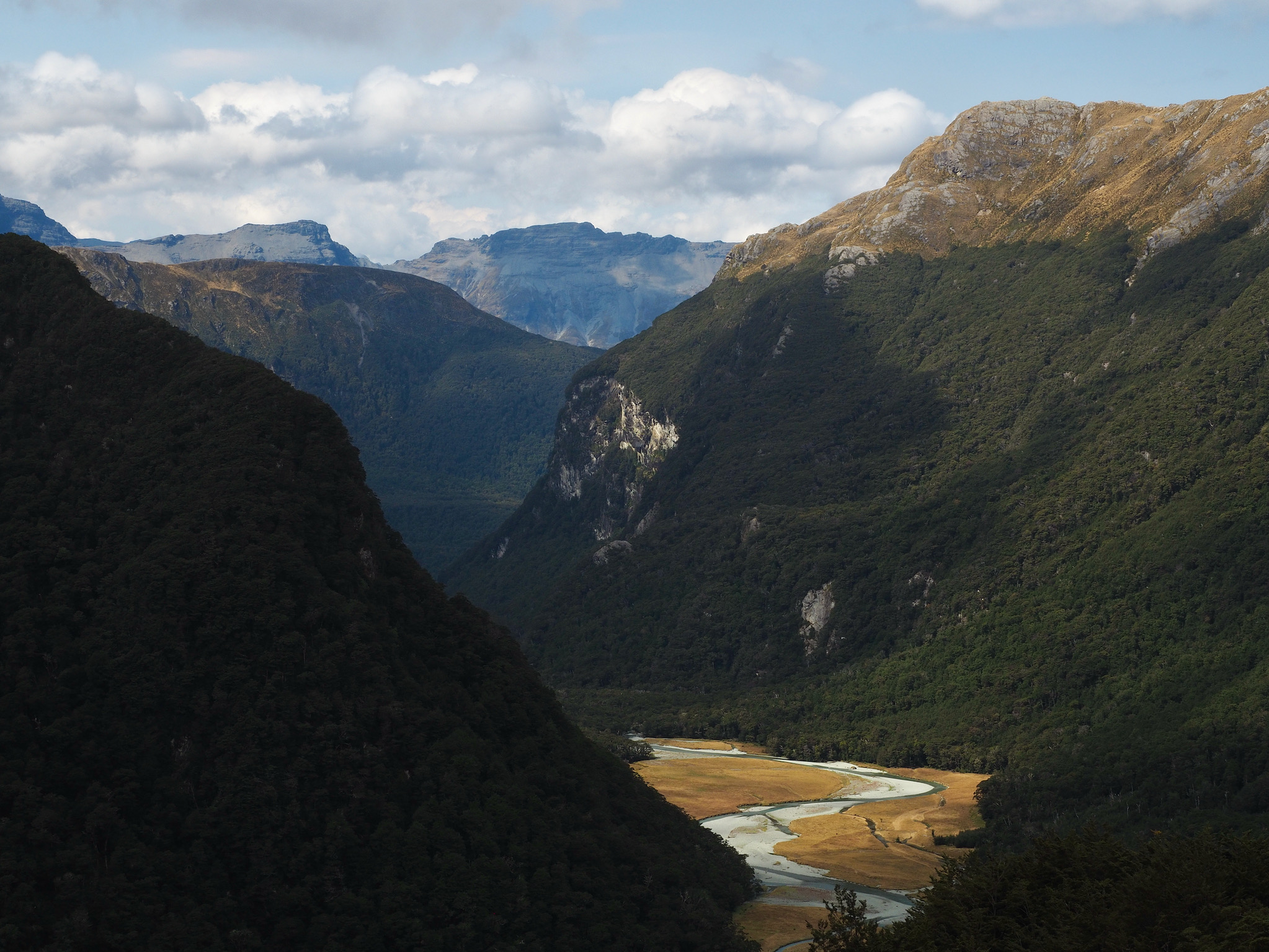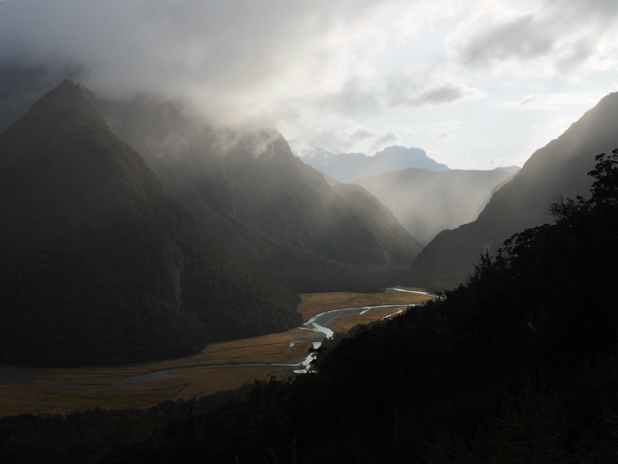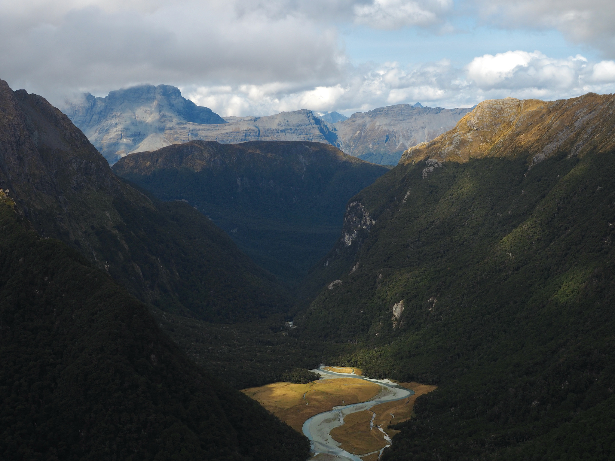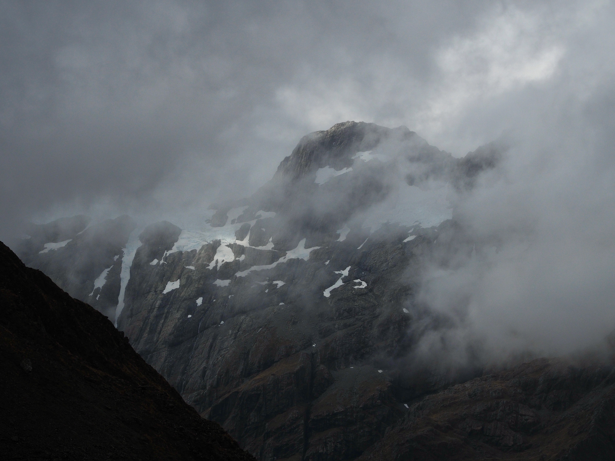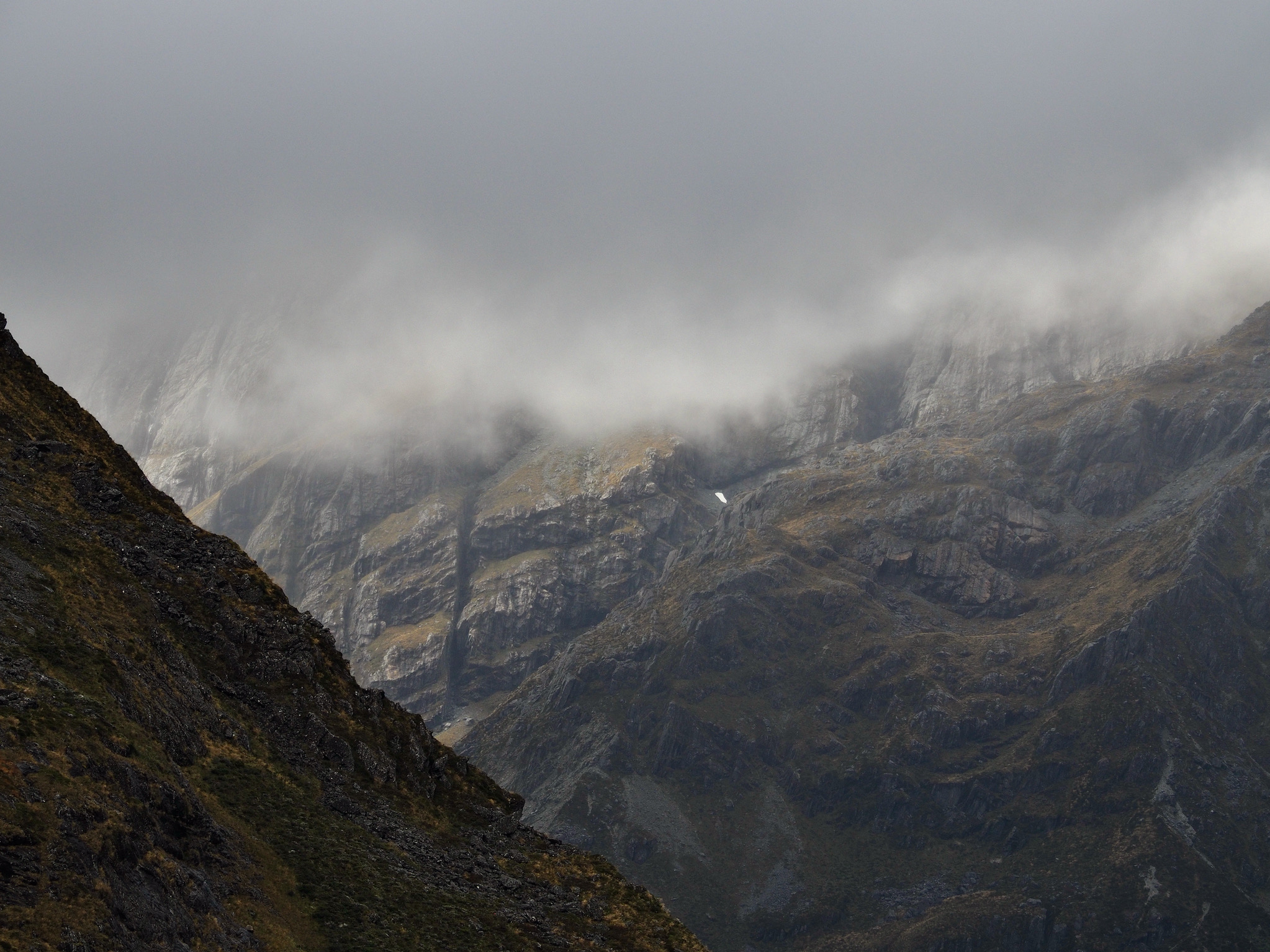 After we warmed up, we started to see patches of blue sky. We did not want to let this opportunity go to waste, and so we hiked back up the valley, retracing some of our steps from earlier in the day. After climbing a bit, we could see that the clearing did not extend back to Harris Saddle or Harris Lake–they were still clouded in–and so we instead set about finding a vantage point back down the Route Burn valley.