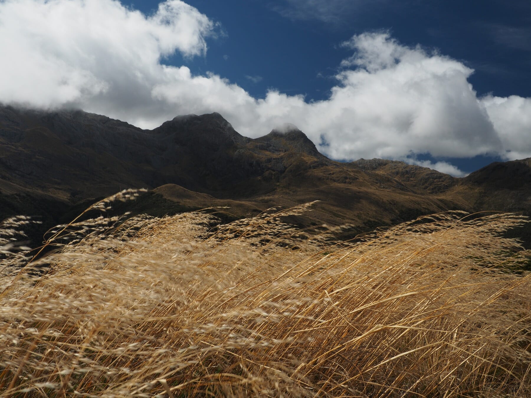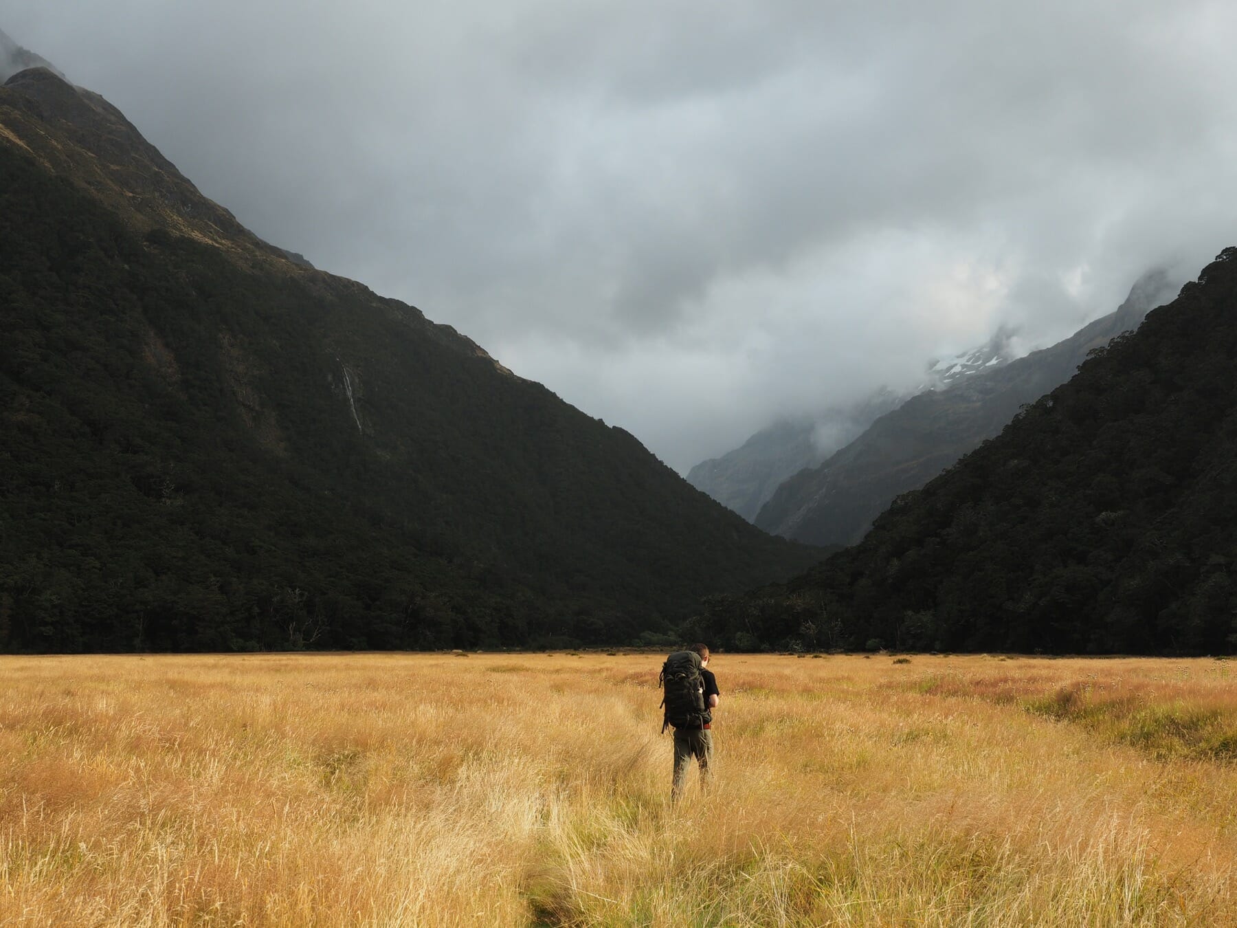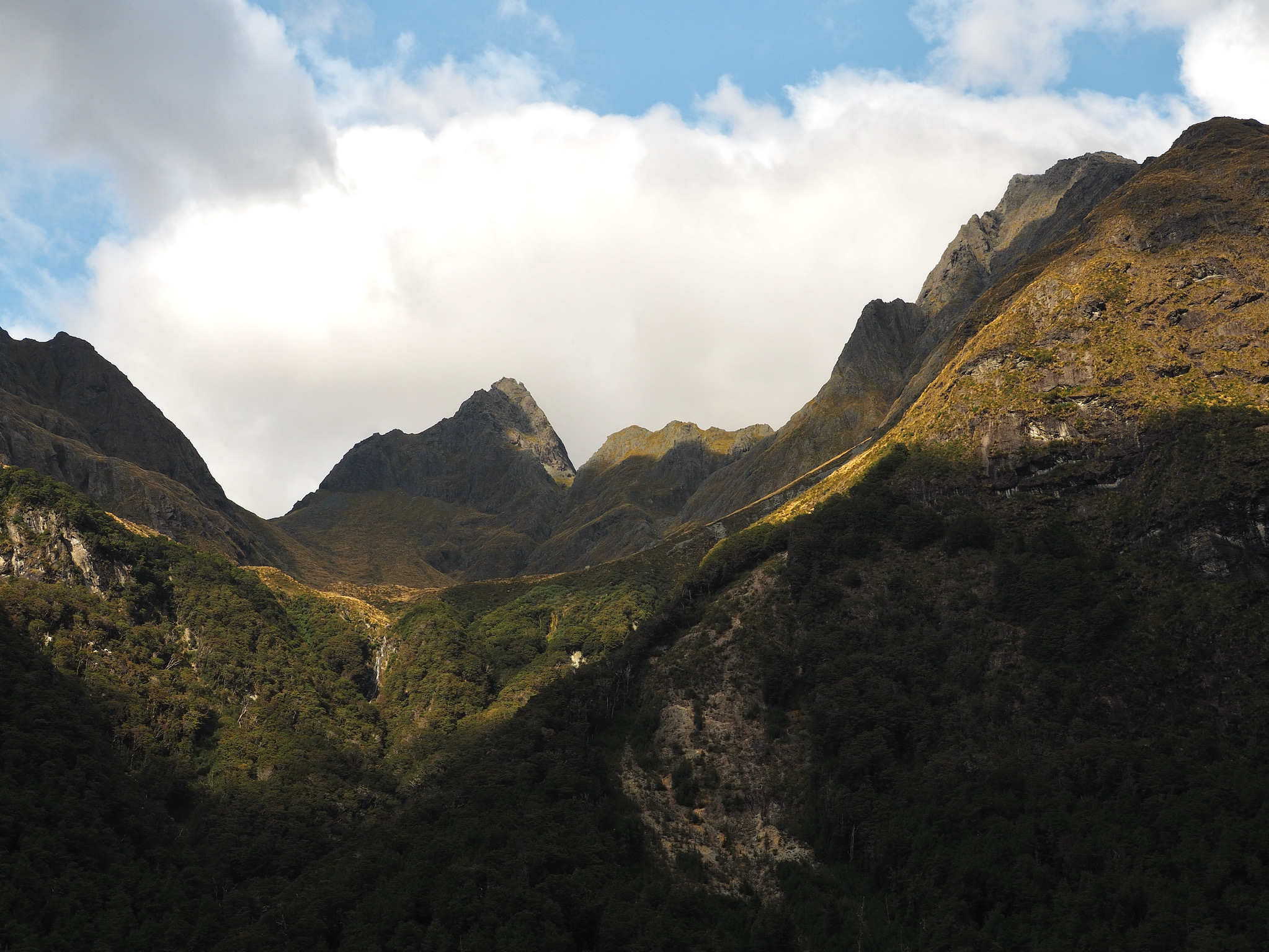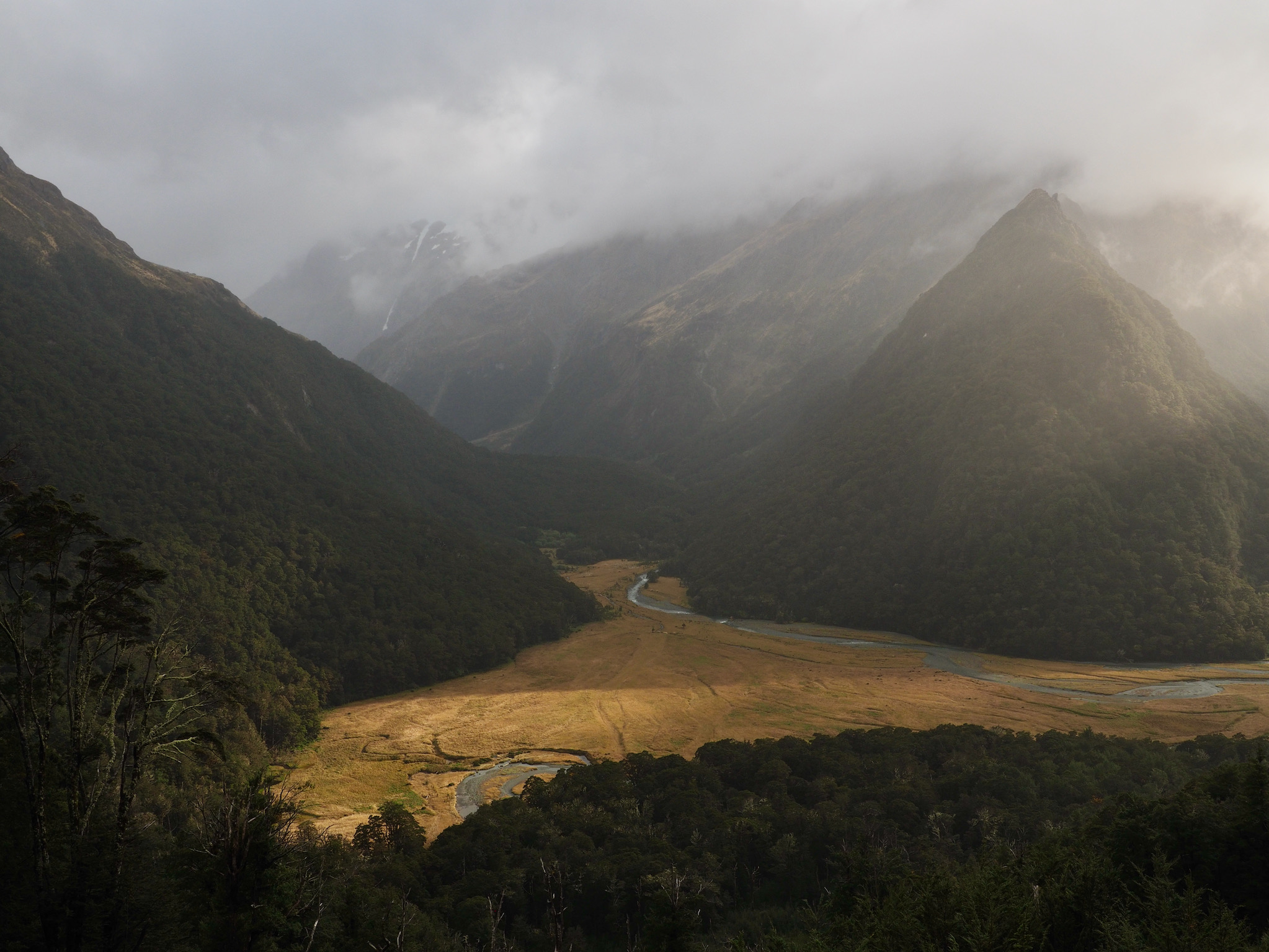 After we warmed up, we started to see patches of blue sky. We did not want to let this opportunity go to waste, and so we hiked back up the valley, retracing some of our steps from earlier in the day. After climbing a bit, we could see that the clearing did not extend back to Harris Saddle or Harris Lake–they were still clouded in–and so we instead set about finding a vantage point back down the Route Burn valley.