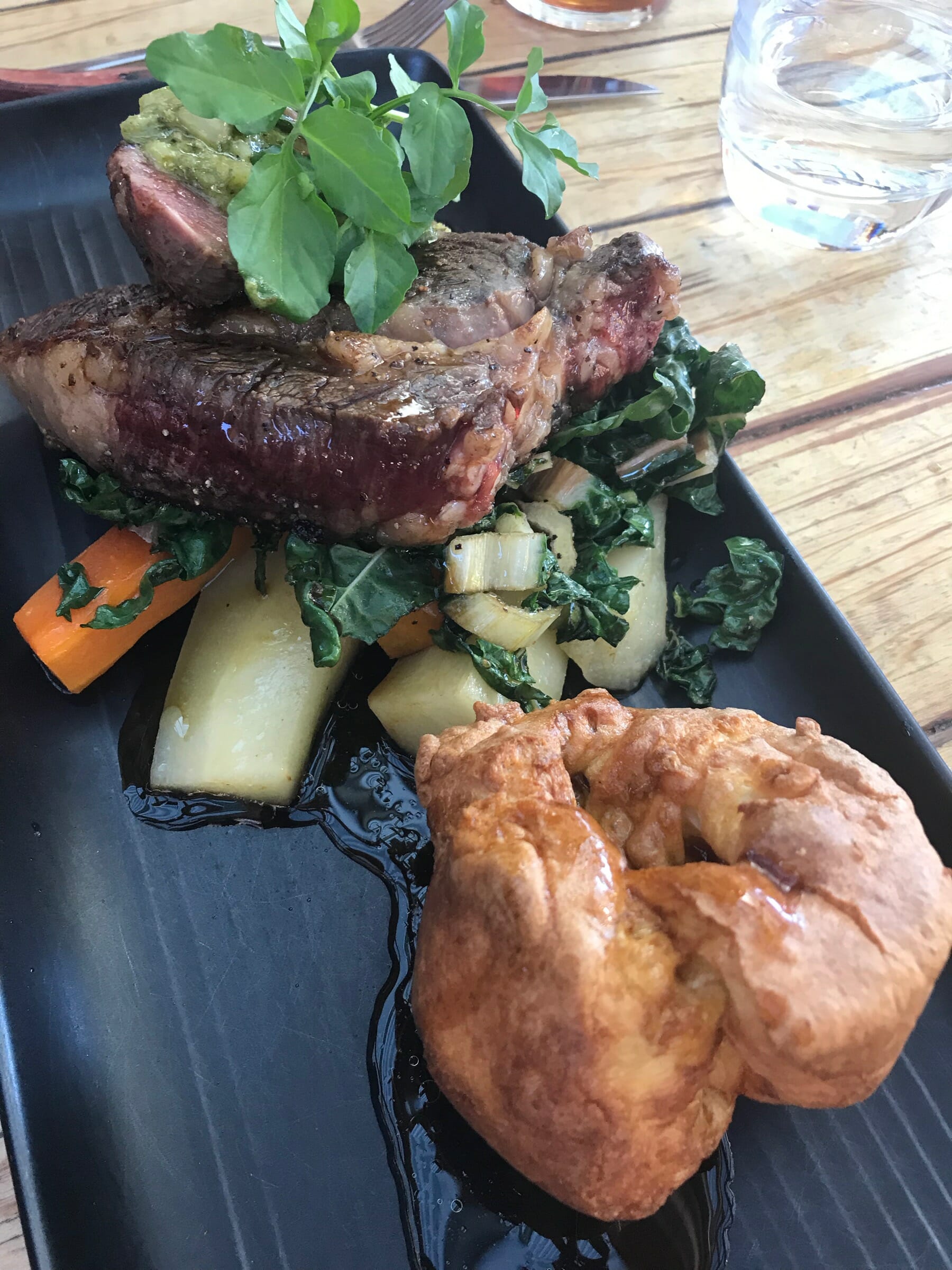 Once seated on their back deck, the staff kept service moving, for which we were grateful. We shared venison-hazelnut-chocolate lollipops and pork belly, scallops, and cauliflower purée as appetizers. I had a delicious steak, but Kyle’s dinner–duck confit with a blue cheese soufflé–was even more excellent. For dessert, we shared a deconstructed lemon meringue pie and a chocolate brownie with berries, ice cream, and mousse. We very much enjoyed this dinner.