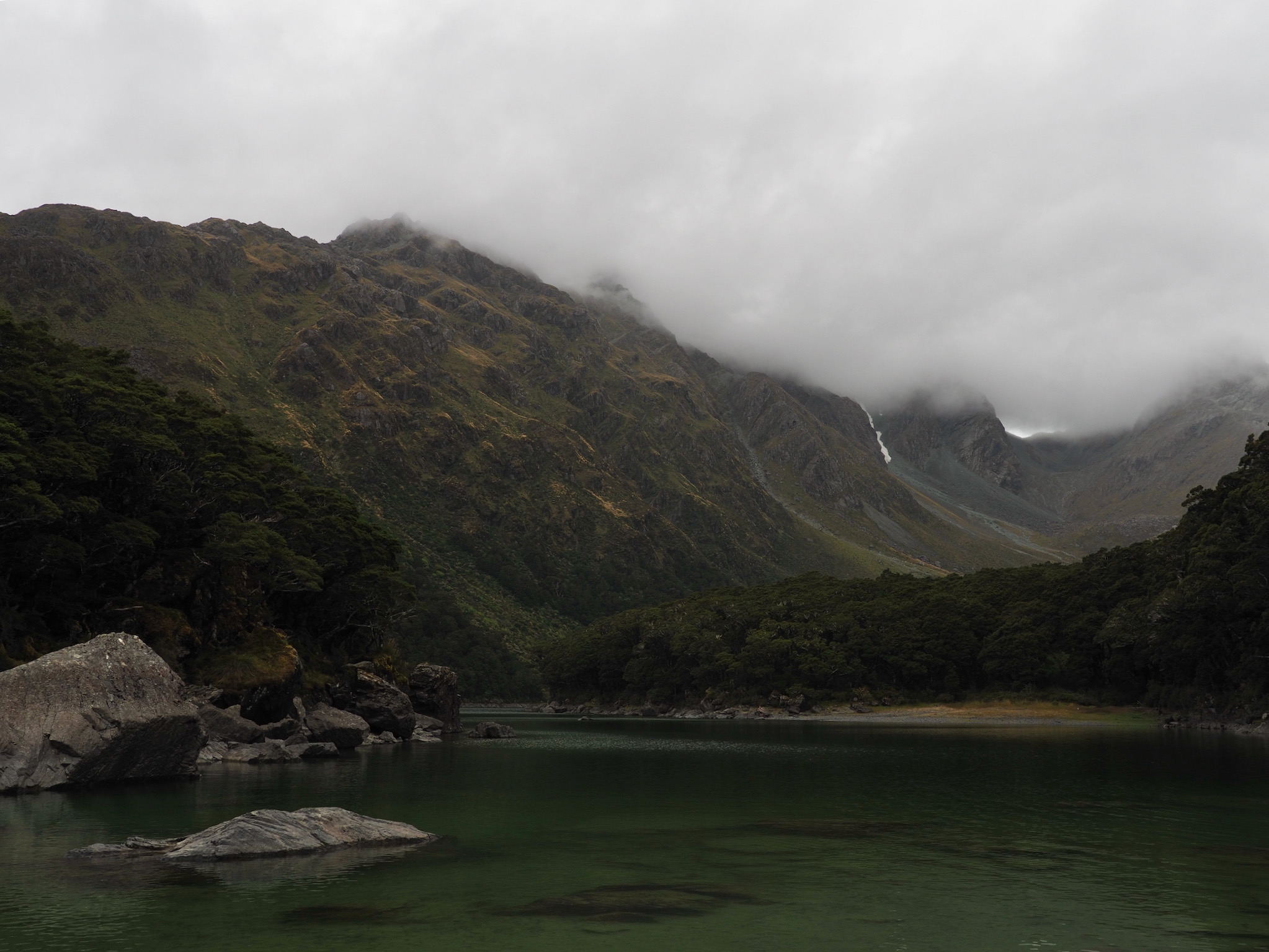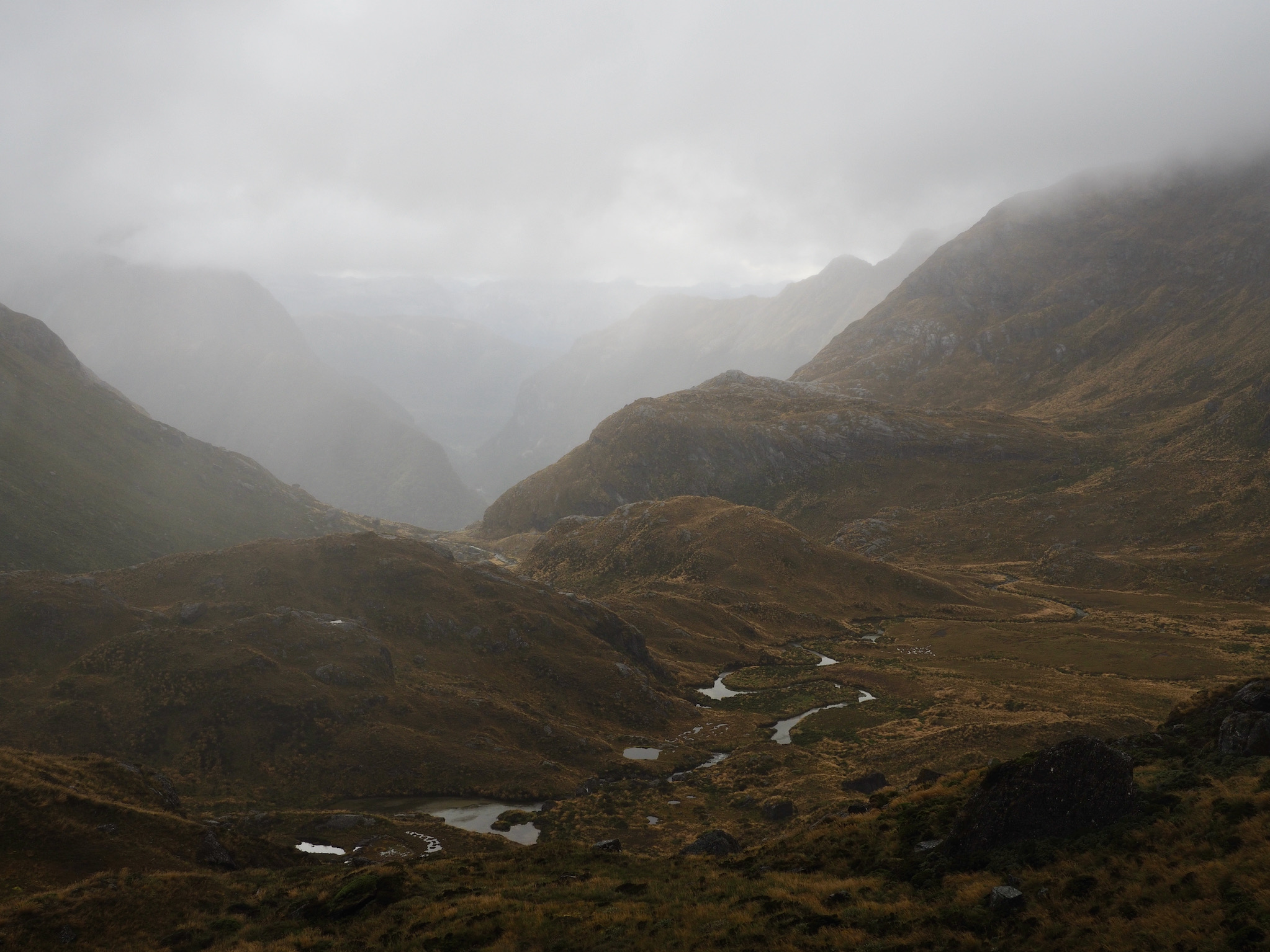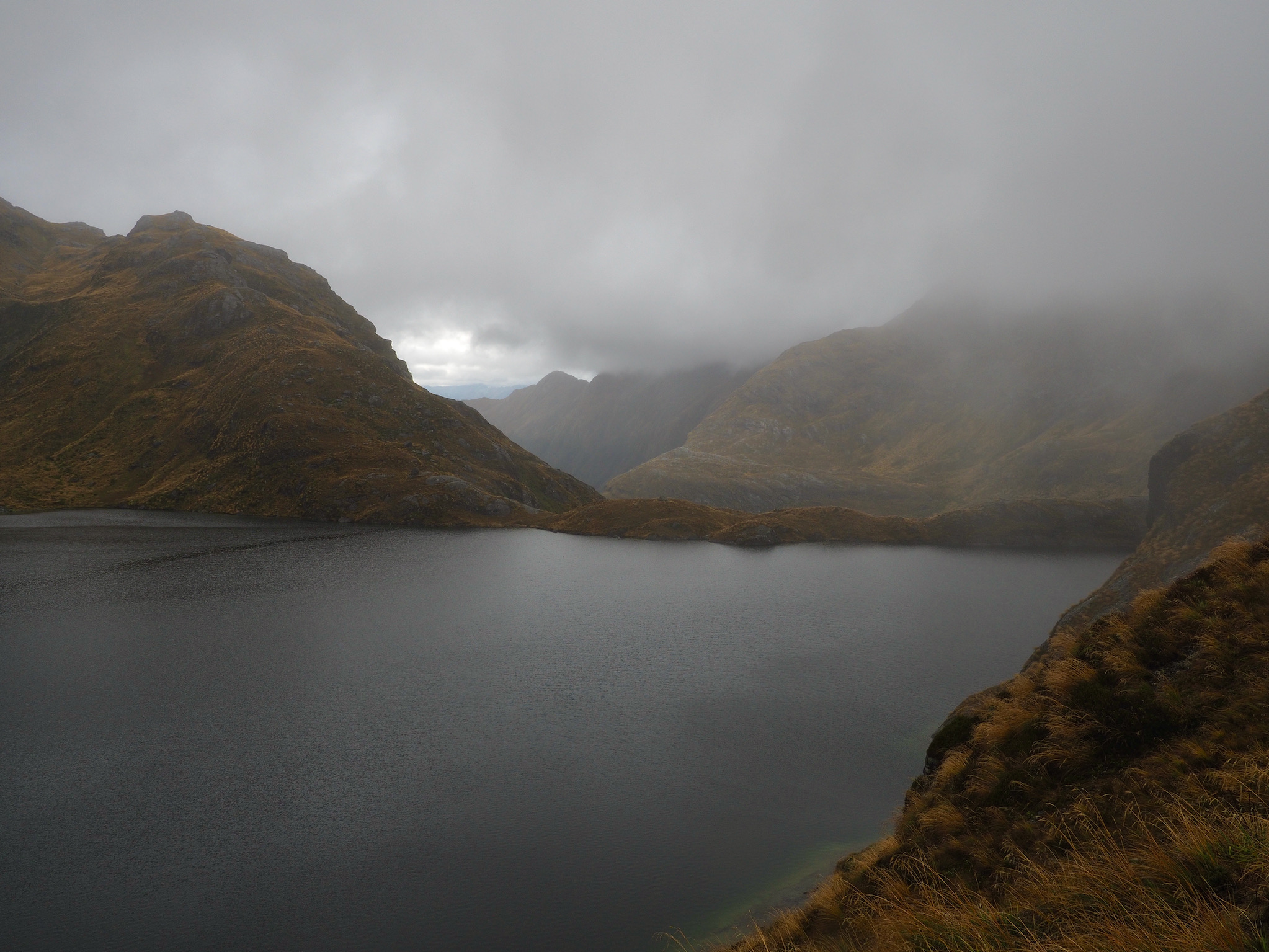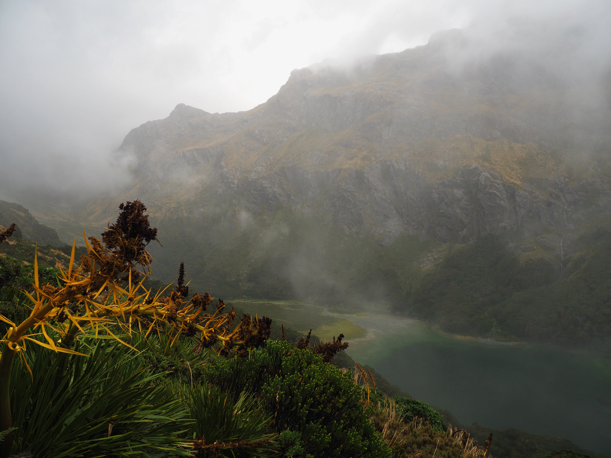 We had breakfast and then set out. The morning was grey and wet, with no signs of of clearing. While we had nice views back down to Lake MacKenzie, the weather limited our views as we hiked toward Harris Saddle. We could see the saddle, but nothing further, nor could we see cross the valley to the west.