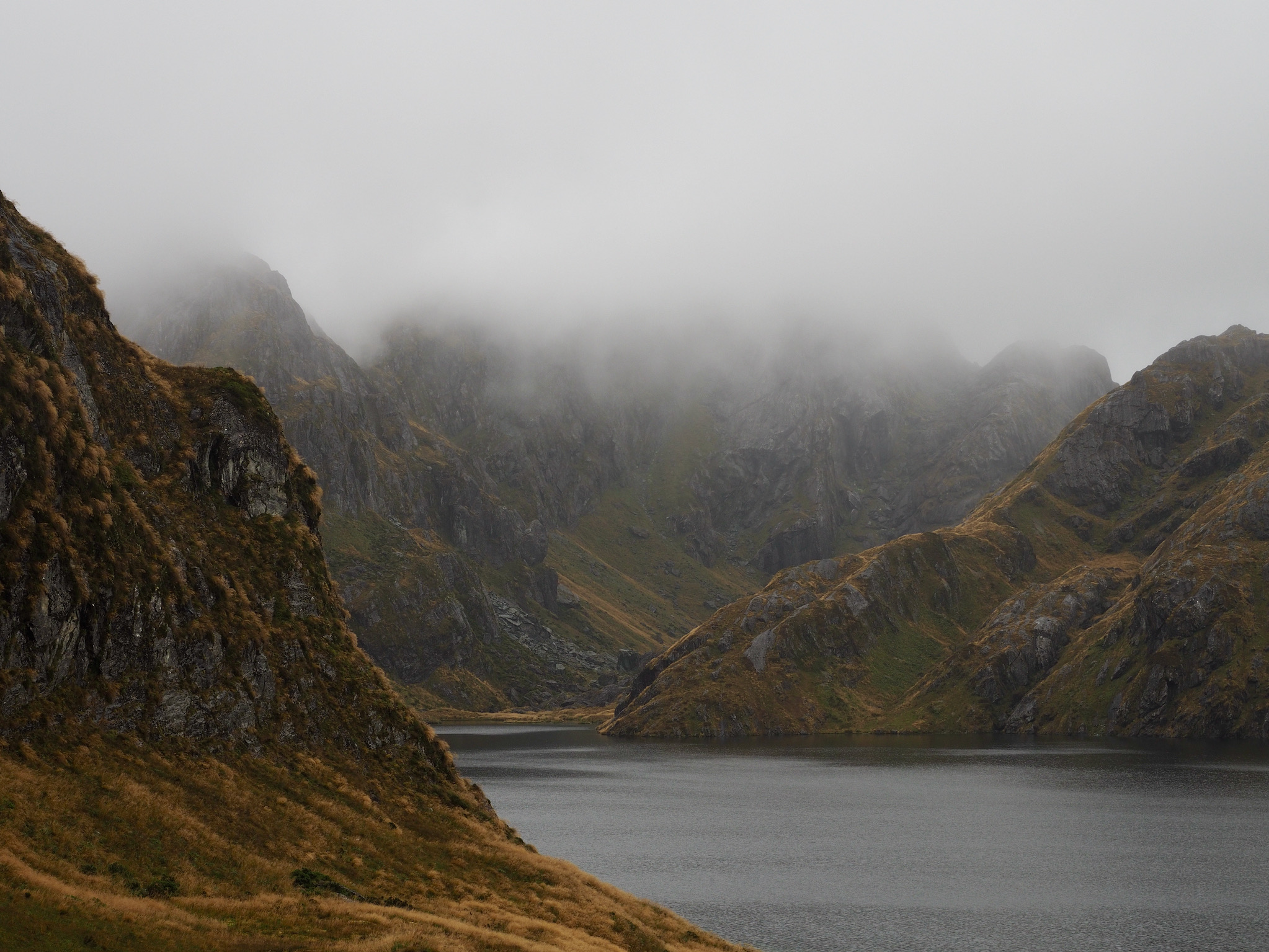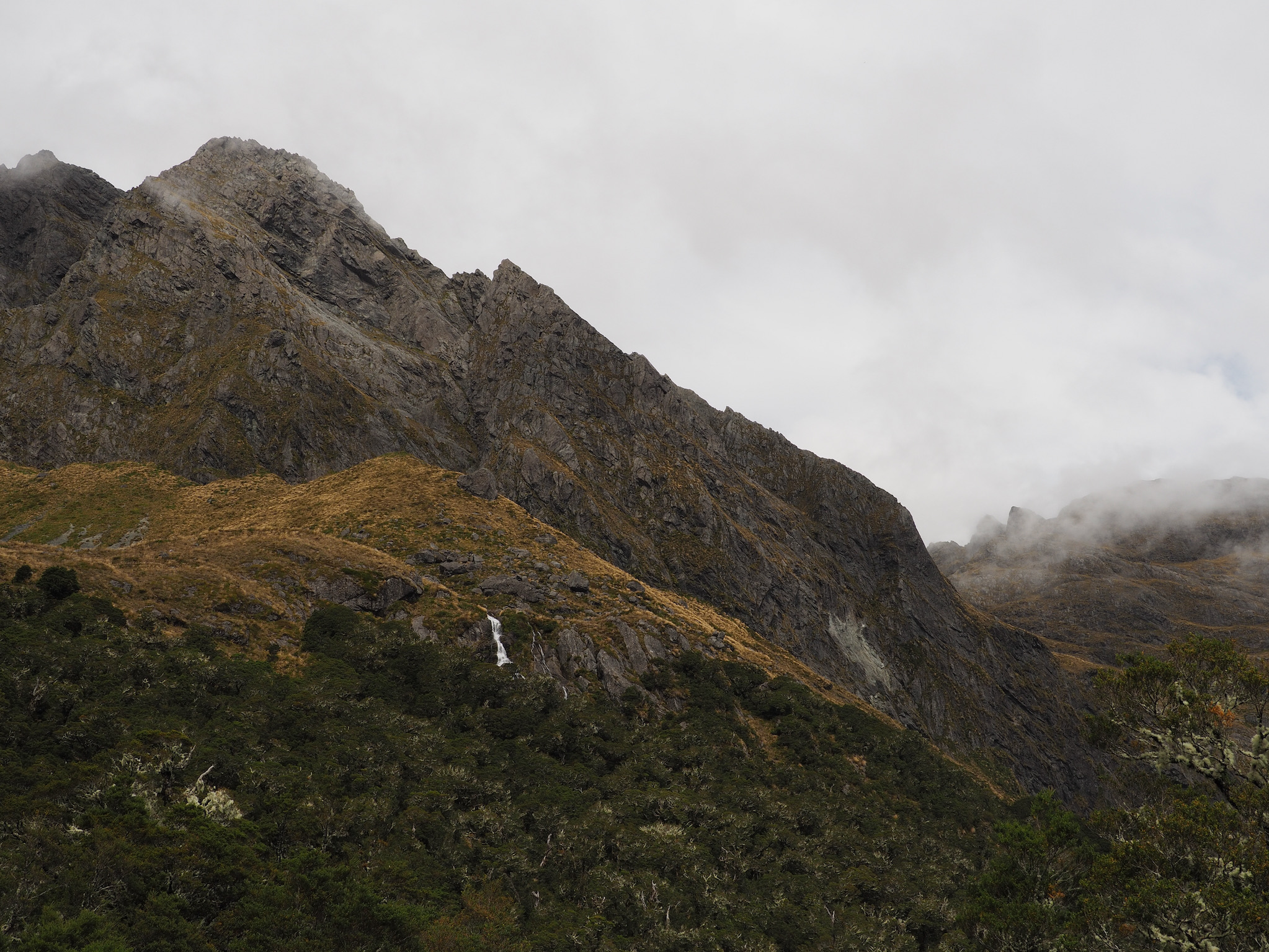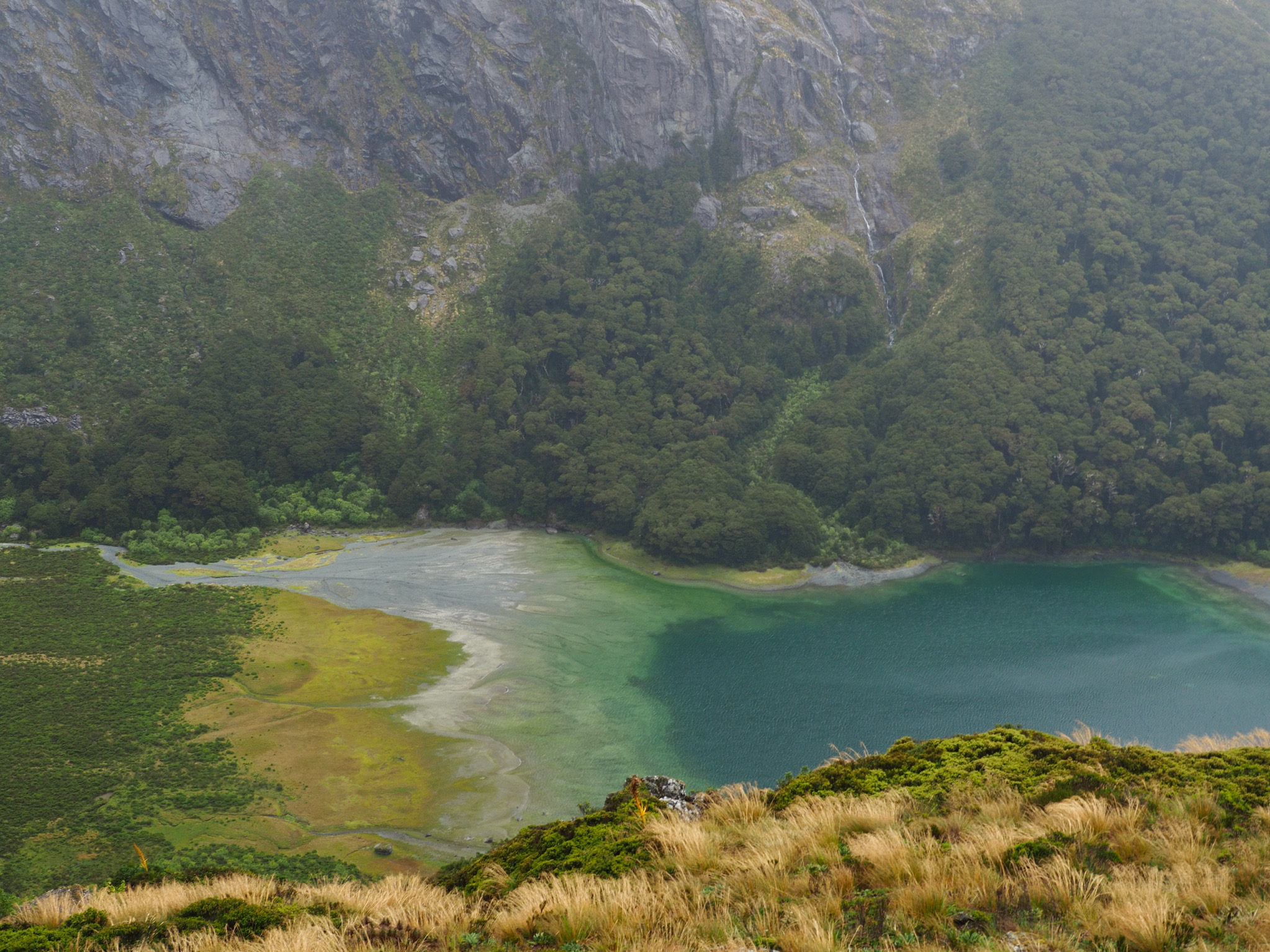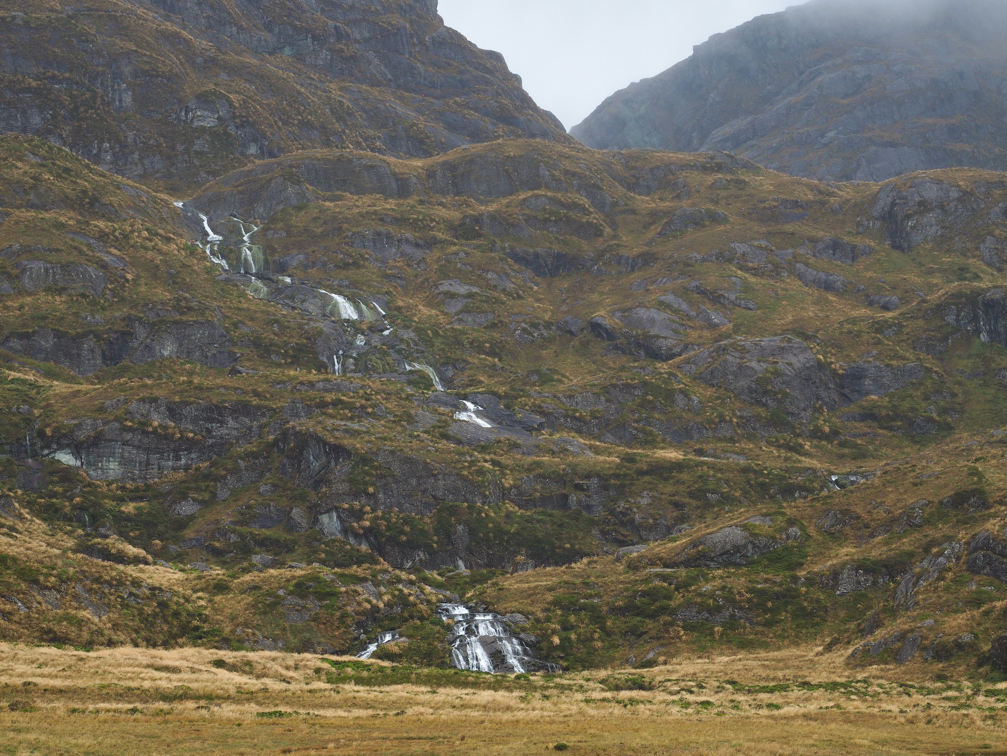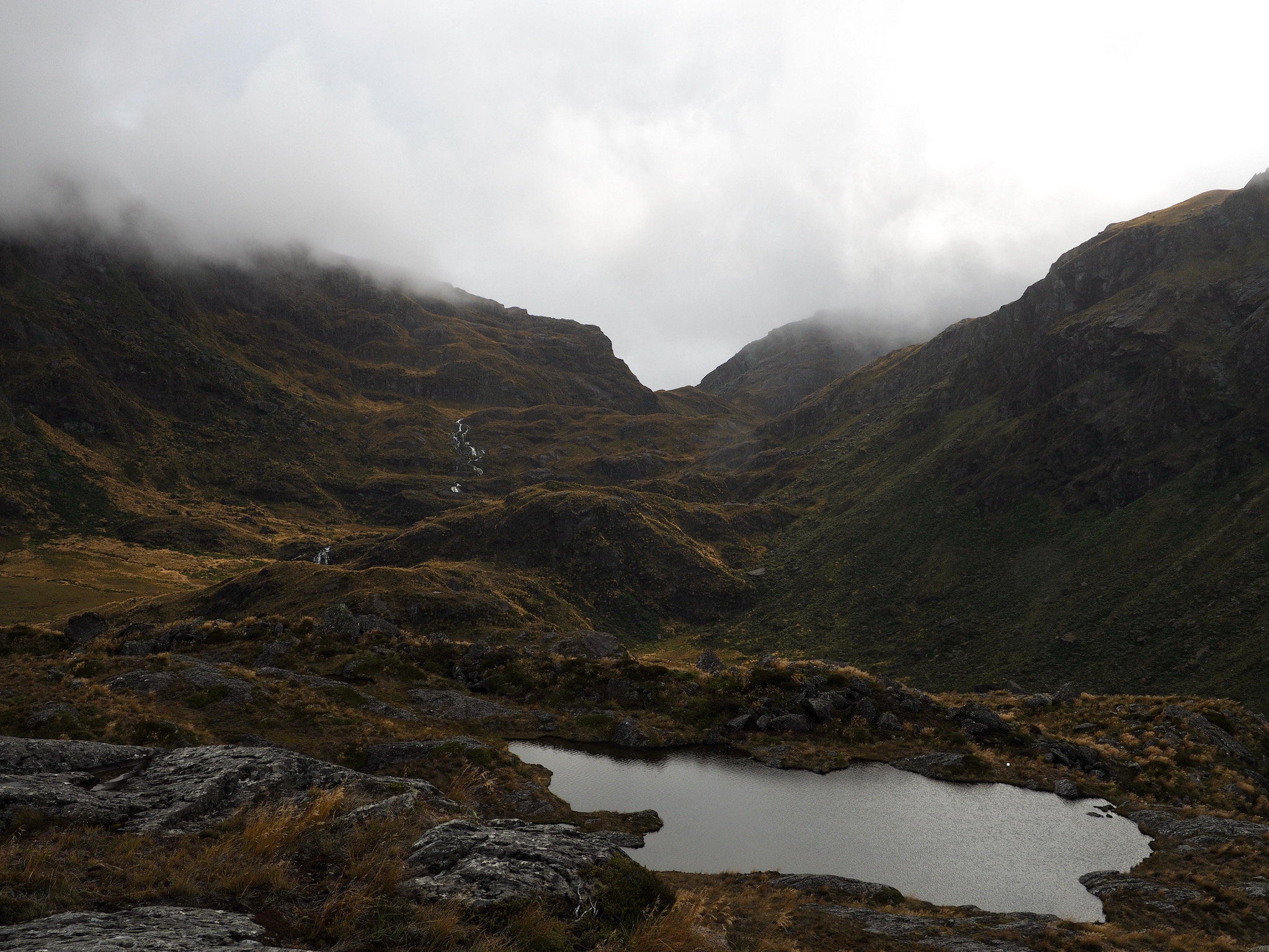 We had breakfast and then set out. The morning was grey and wet, with no signs of of clearing. While we had nice views back down to Lake MacKenzie, the weather limited our views as we hiked toward Harris Saddle. We could see the saddle, but nothing further, nor could we see cross the valley to the west.