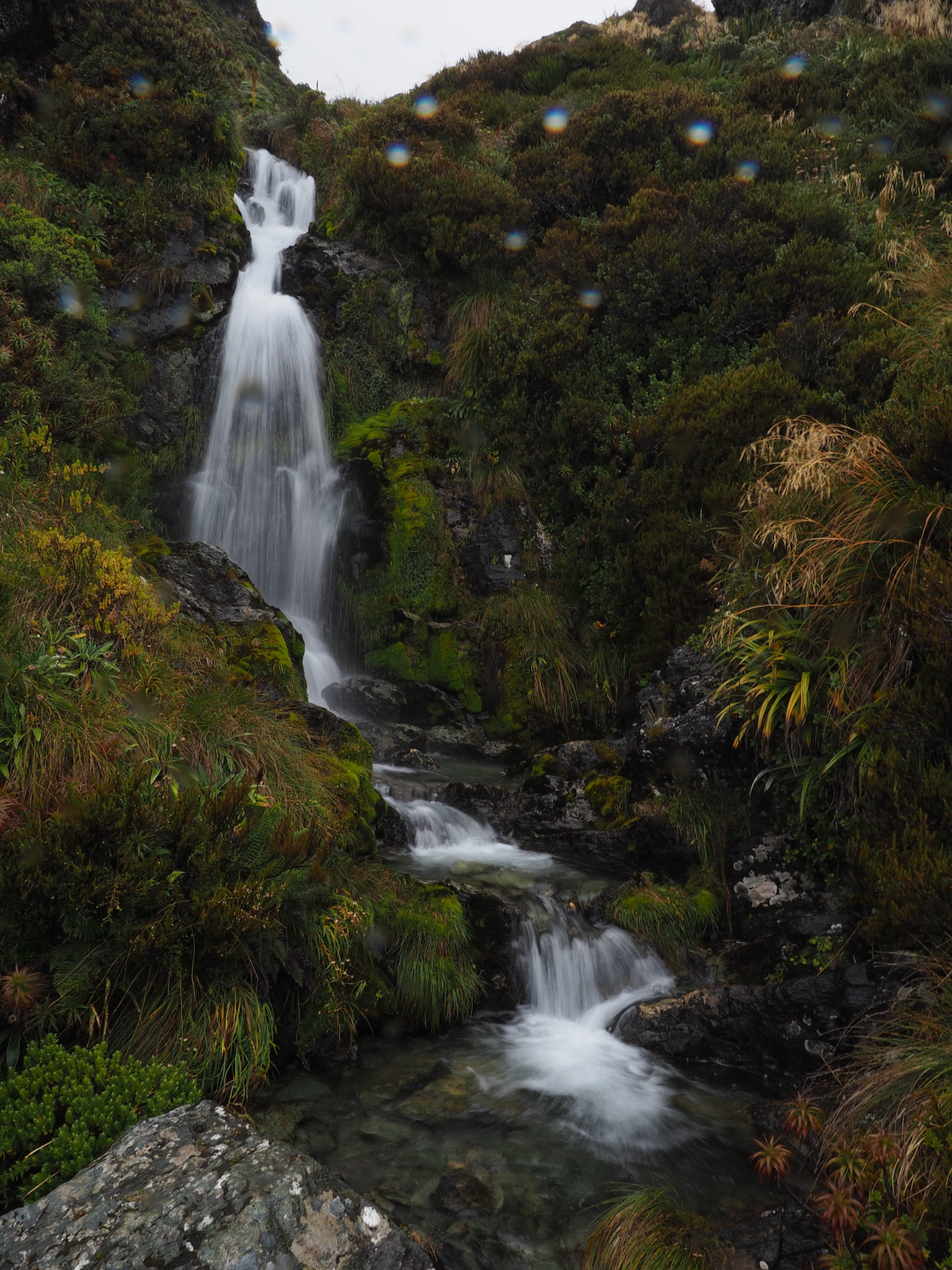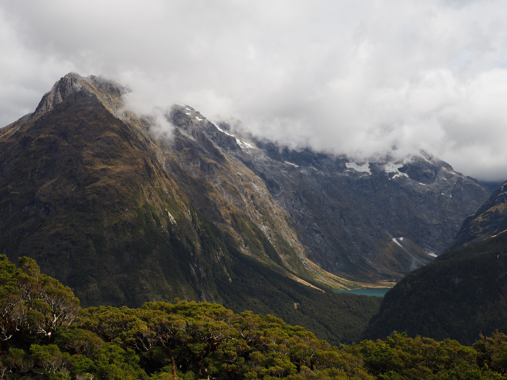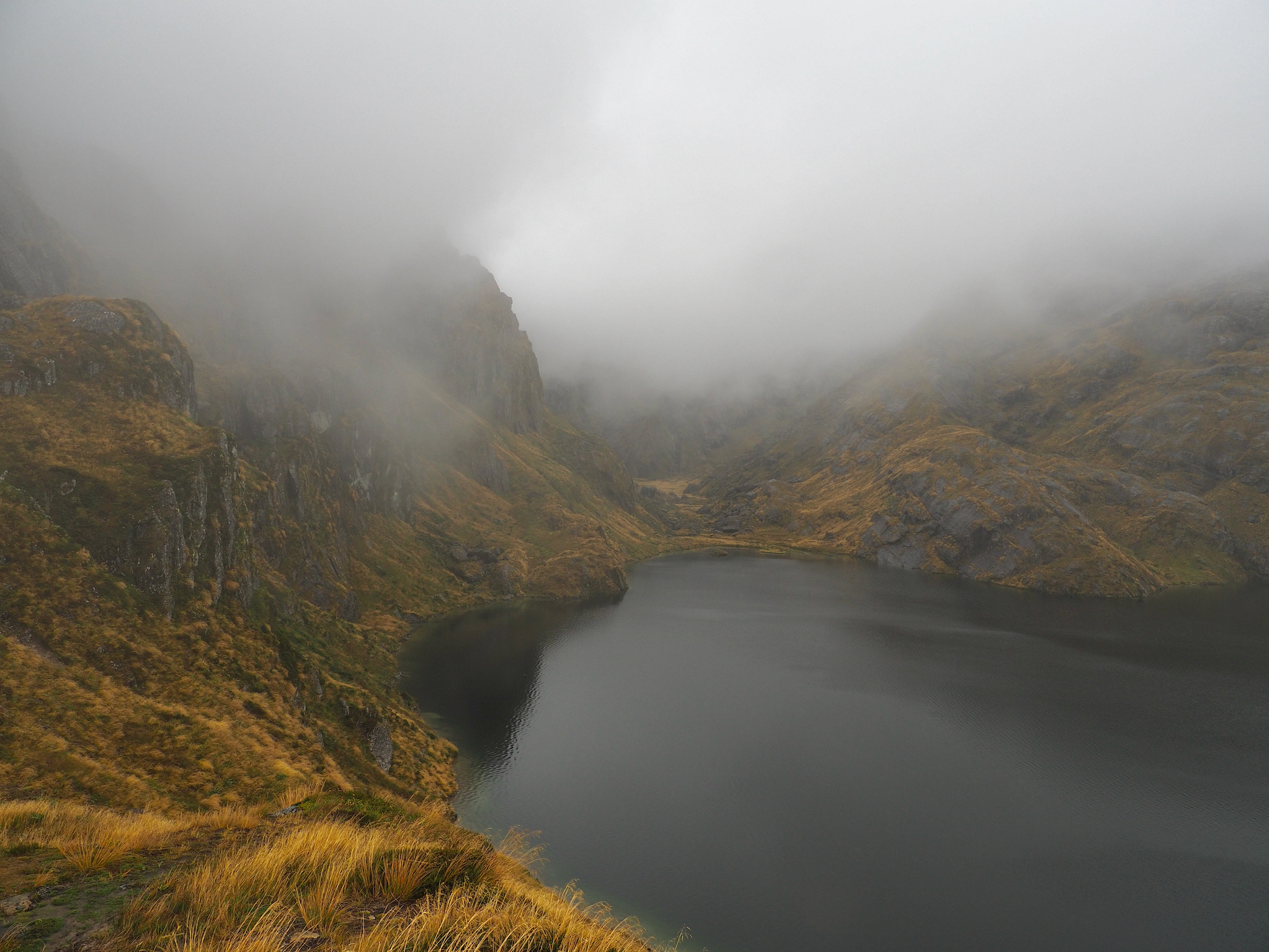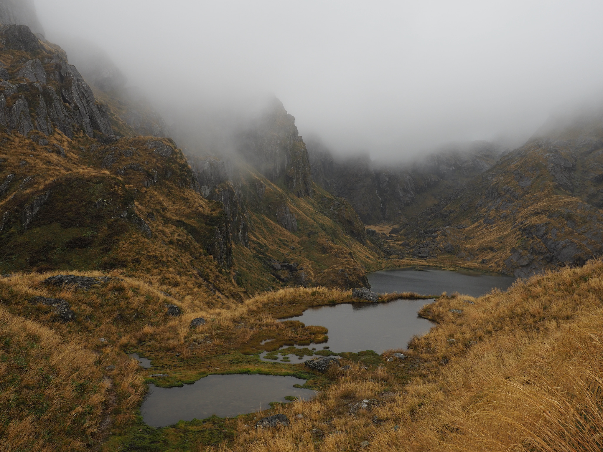 We had breakfast and then set out. The morning was grey and wet, with no signs of of clearing. While we had nice views back down to Lake MacKenzie, the weather limited our views as we hiked toward Harris Saddle. We could see the saddle, but nothing further, nor could we see cross the valley to the west.