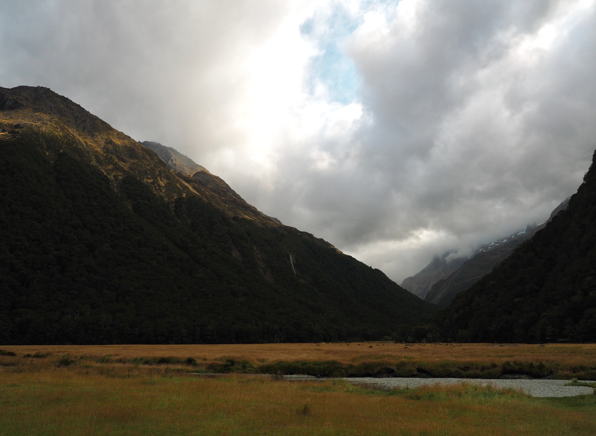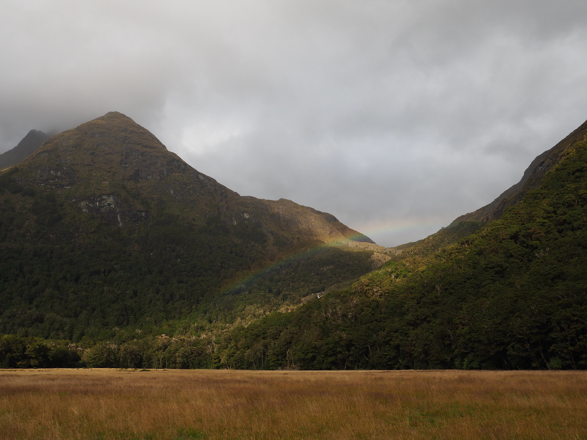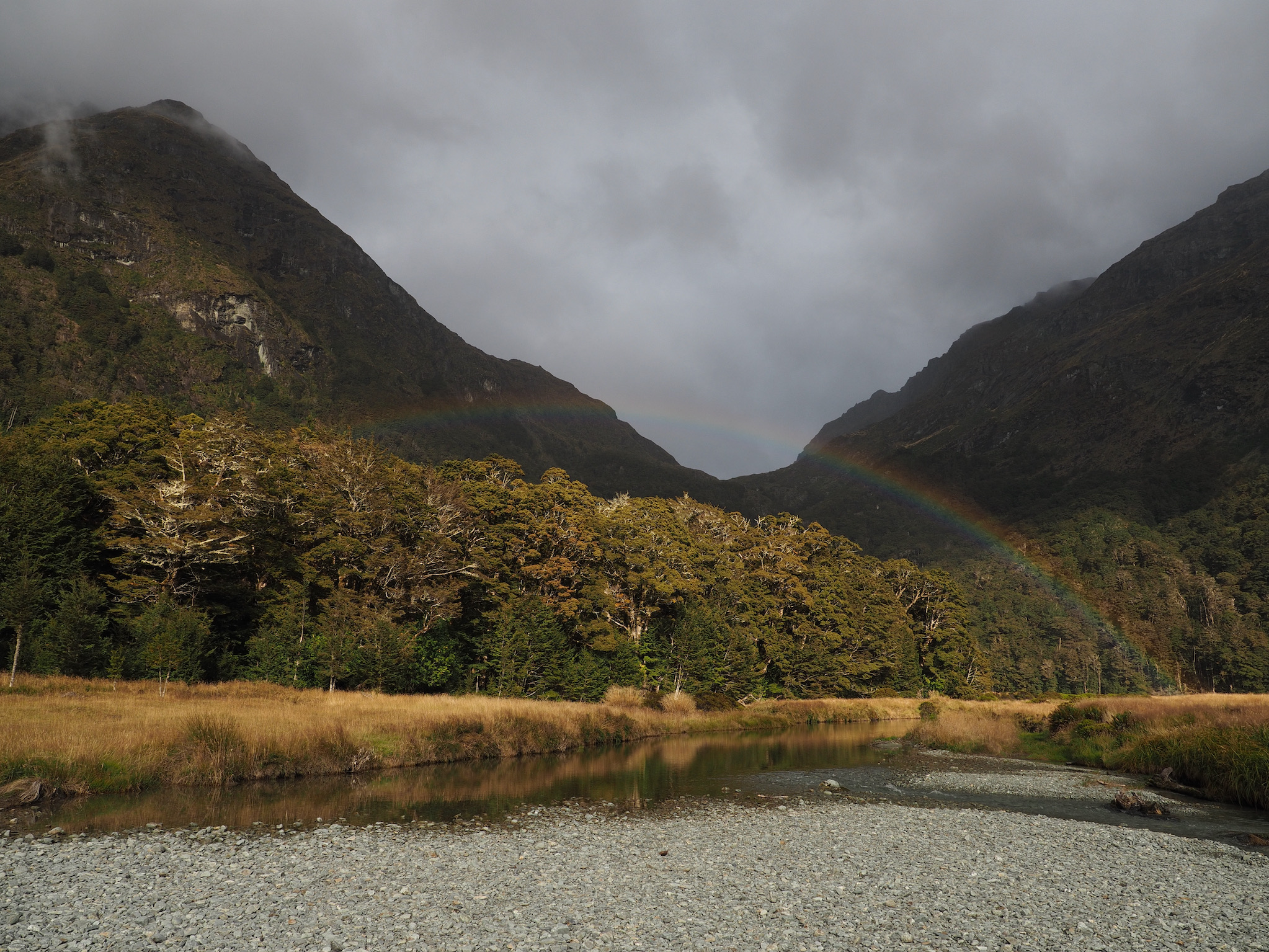 At Routeburn Flats, we had to look around a little to find a good crossing that would lead us to the path up the north fork. As we did, a vibrant rainbow appeared back toward Routeburn Falls.