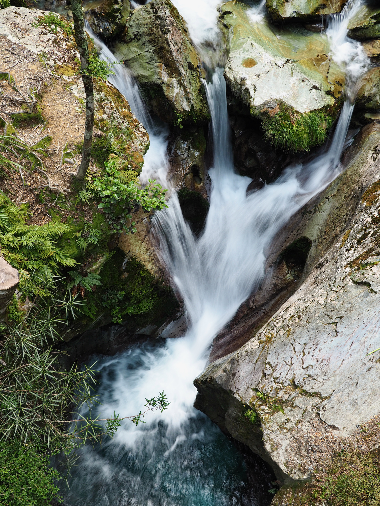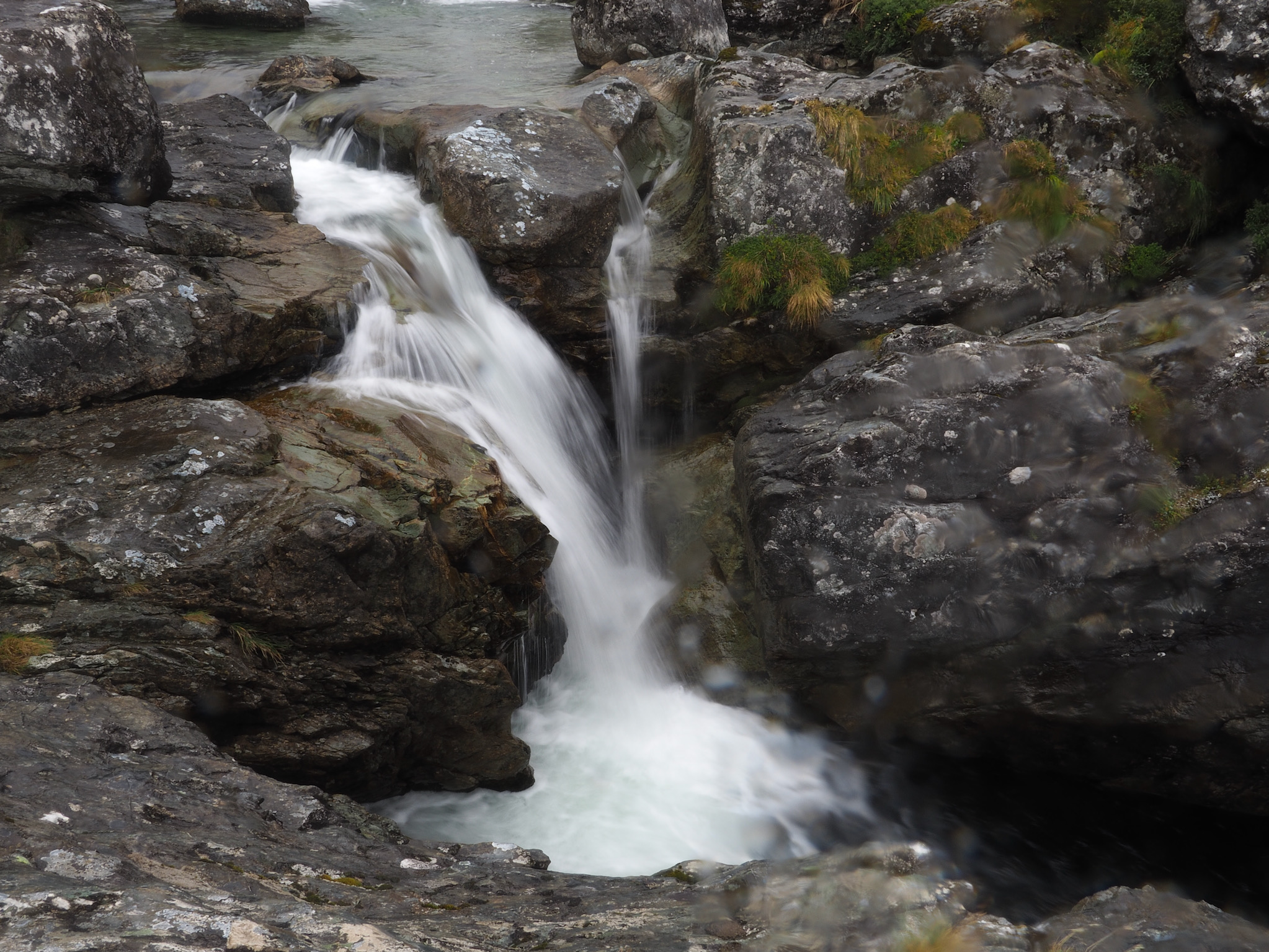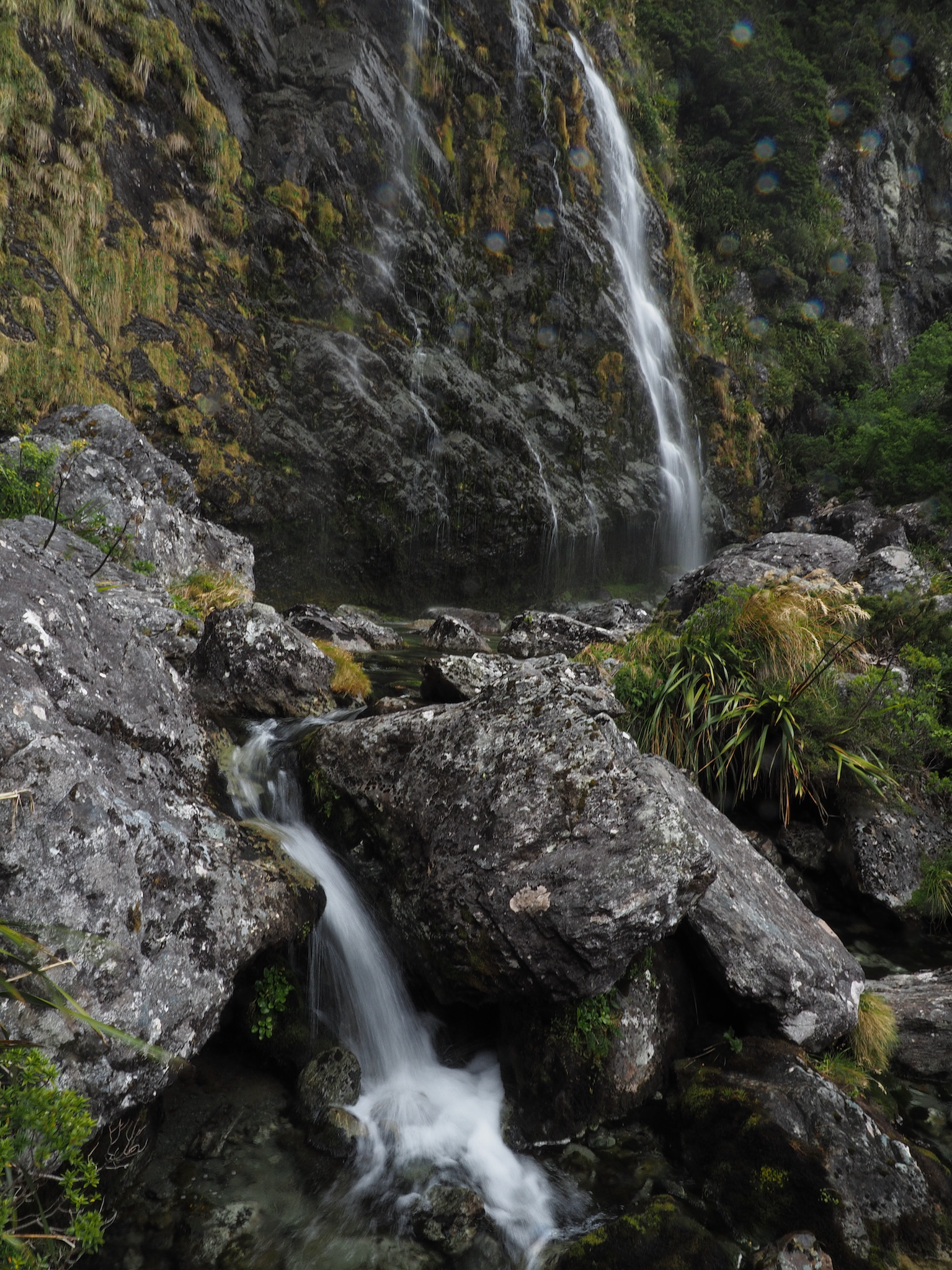 At Routeburn Flats, we had to look around a little to find a good crossing that would lead us to the path up the north fork. As we did, a vibrant rainbow appeared back toward Routeburn Falls.