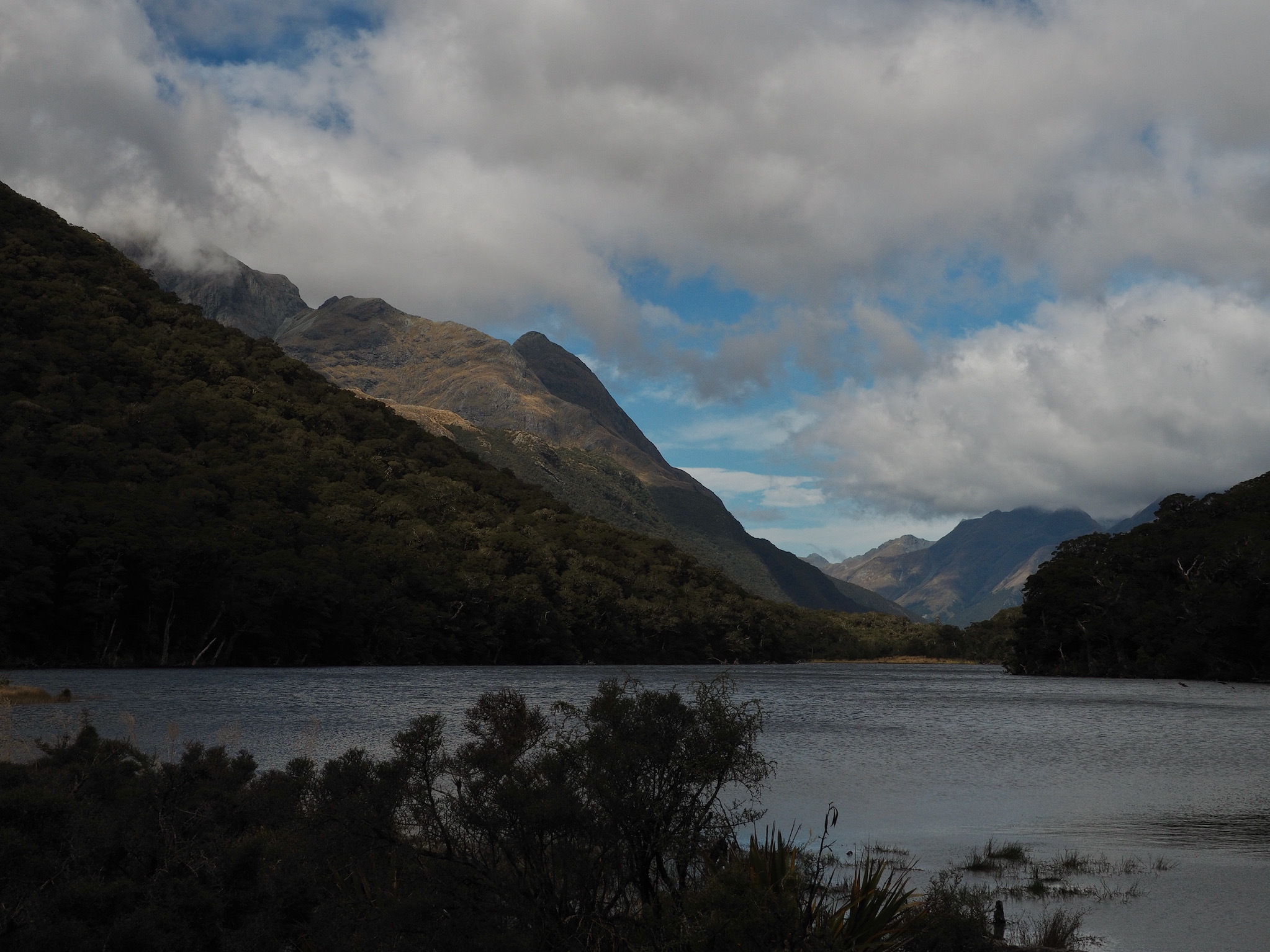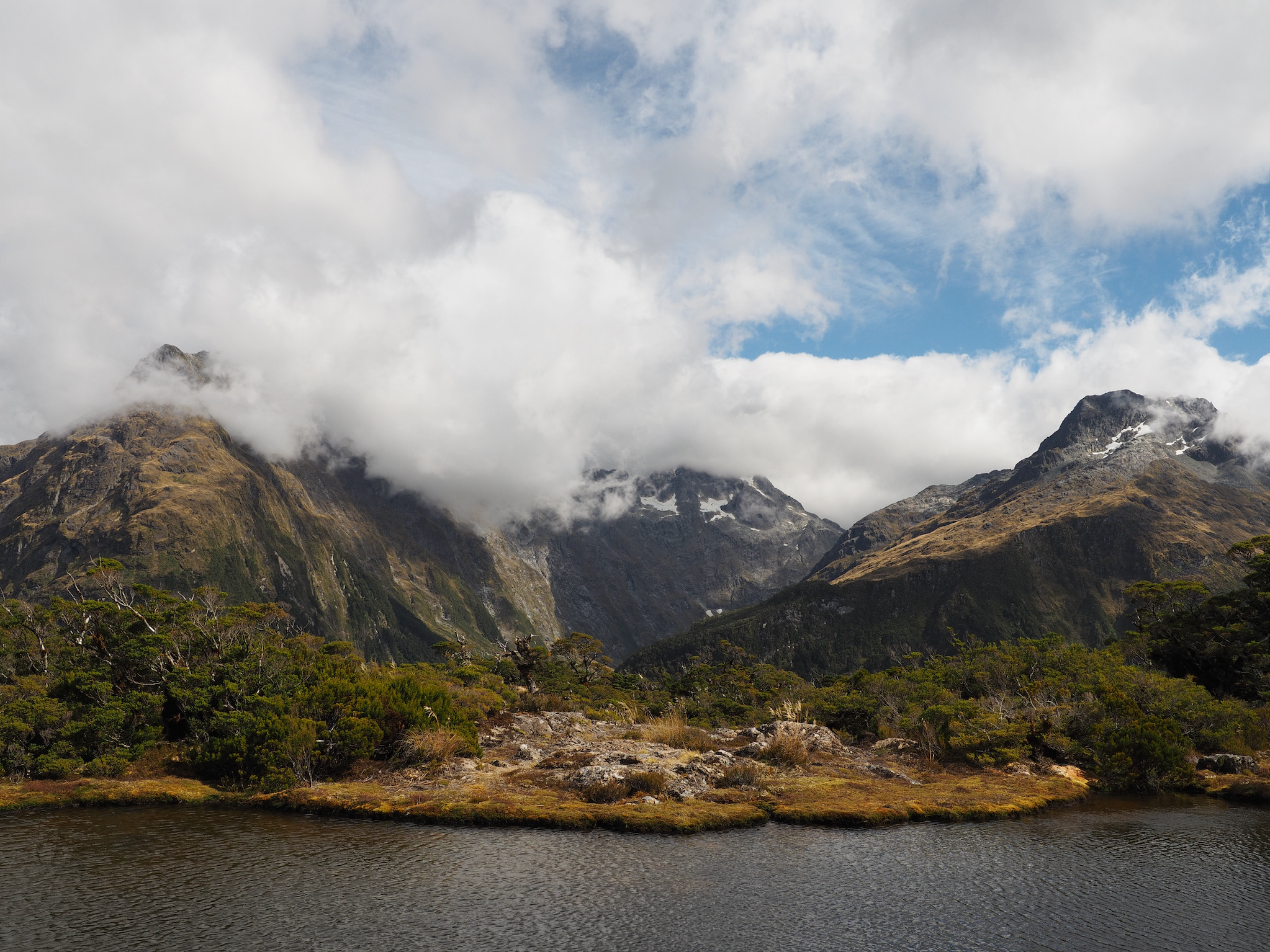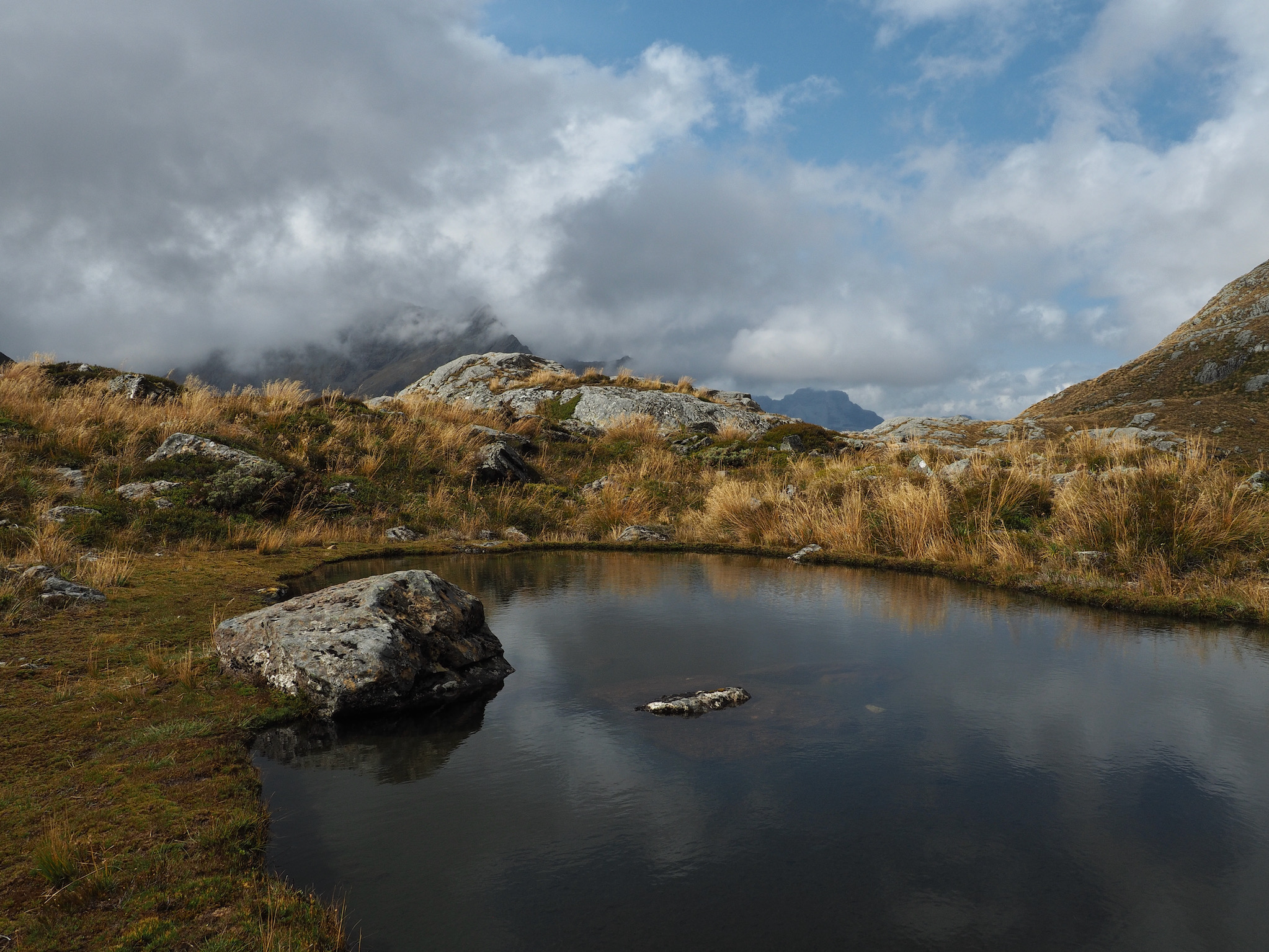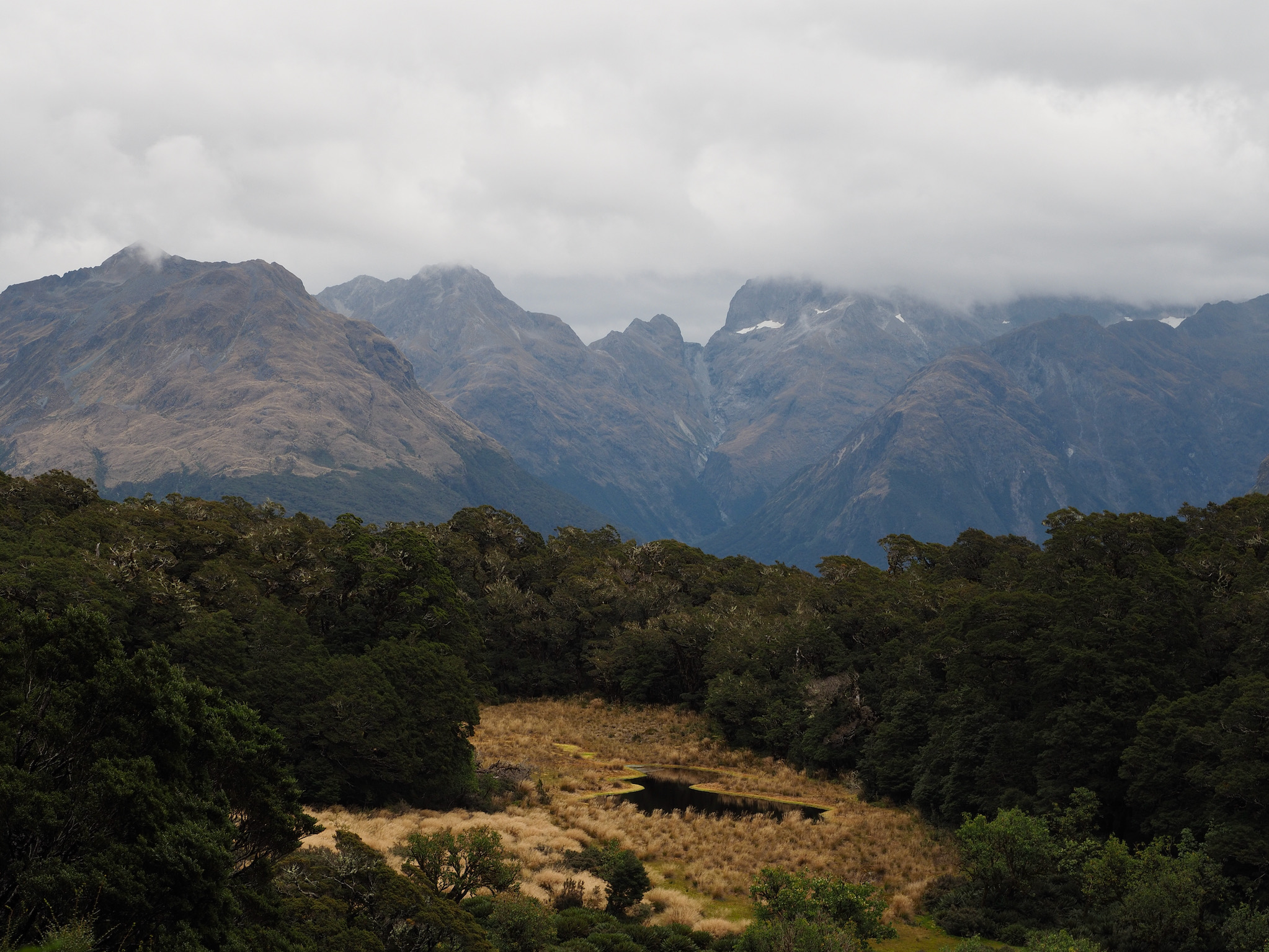 From the junction, another 15 minutes or so of gradual up brought us to Key Summit. Even though clouds were starting to close in on the horizon and obstructed our views of the higher peaks, we could see why this would be a good short hike (about 4.5 miles round trip) for those who could not do the whole Routeburn Track. The summit area offered 360º views of the Humboldt and Darran Mountains, including views toward Harris Saddle and the next day’s route. The landscape was also an alpine wetland, with various trails, bogs, and tarns.