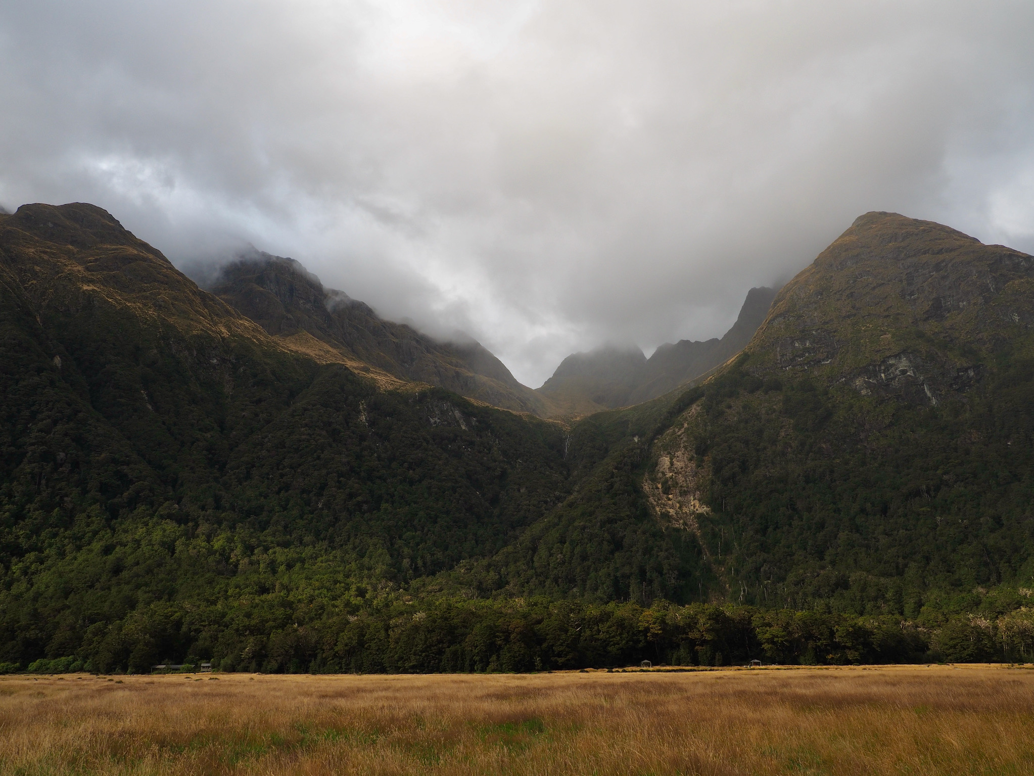 From there, the route began climbing through forests. We passed Earland Falls and then an open area called The Orchard. Along the way, the forest opened up, offering views of the surrounding mountains. By this time, the weather had clouded in and it soon began to drizzle. Not long after, though, we reached the Lake Mackenzie Hut, passing first the swankier hut for guided hikes and then reaching the cozy Department of Conservation Hut.