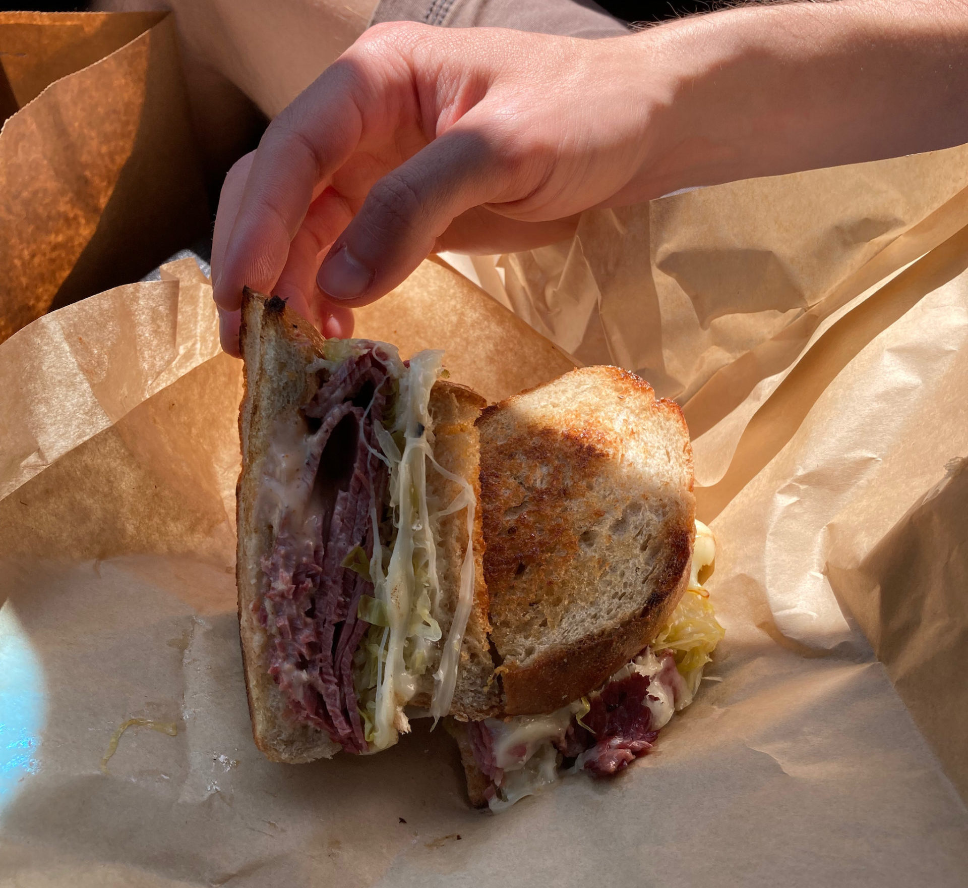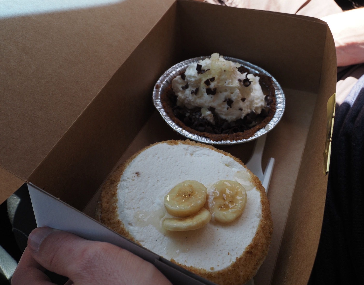 At Leoda’s, we found that they did accept Apple Pay and other contactless payments now. We kicked ourself for the missed opportunity the previous day and ordered. Kyle got the reuben, I got the seared ahi sandwich, and we shared banana cream and chocolate macadamia nut pies. We took the food up to Olowalu petroglyphs, where we ate in the car before getting out to look at the petroglyphs. The food was as good as I remembered.