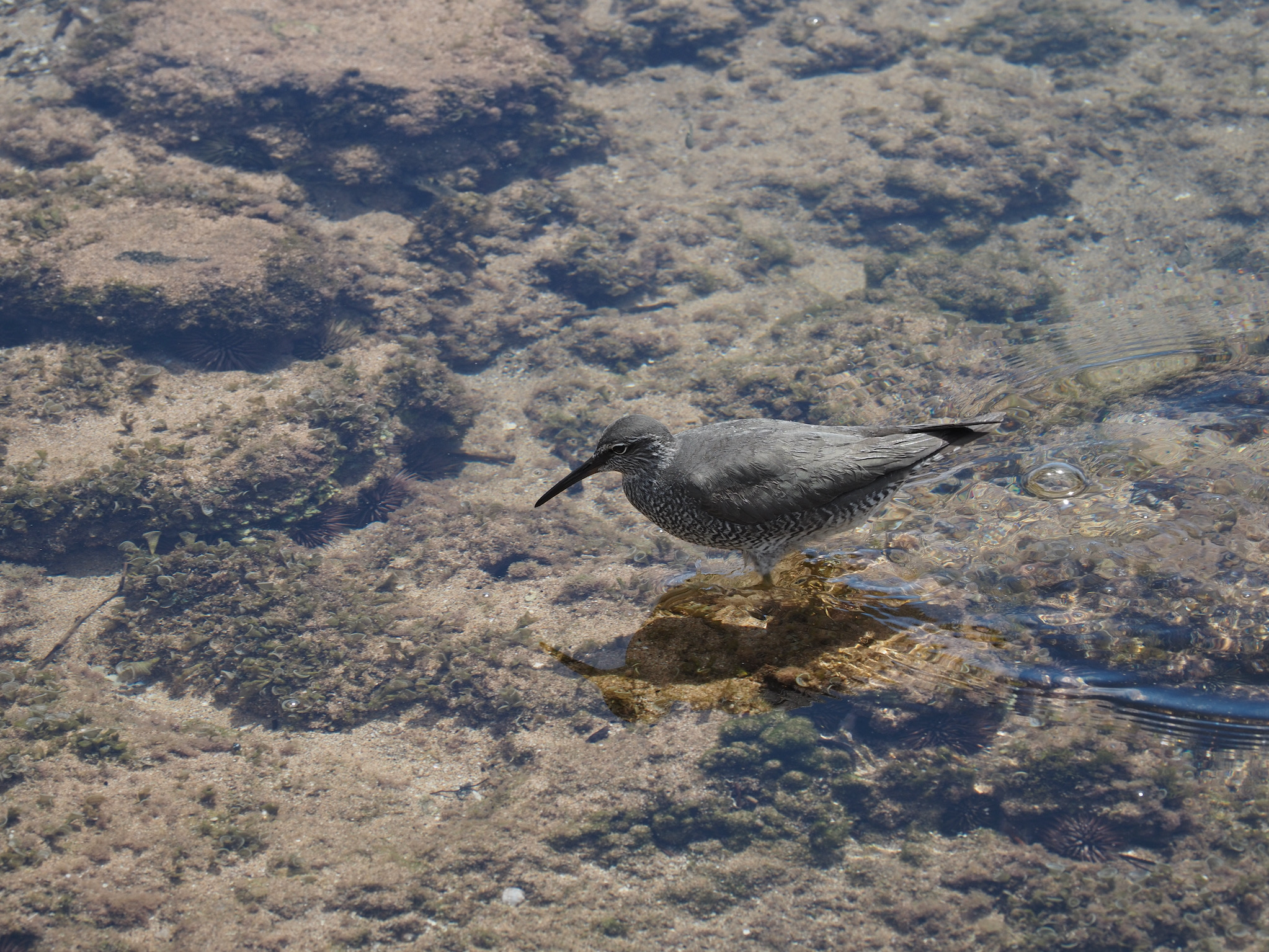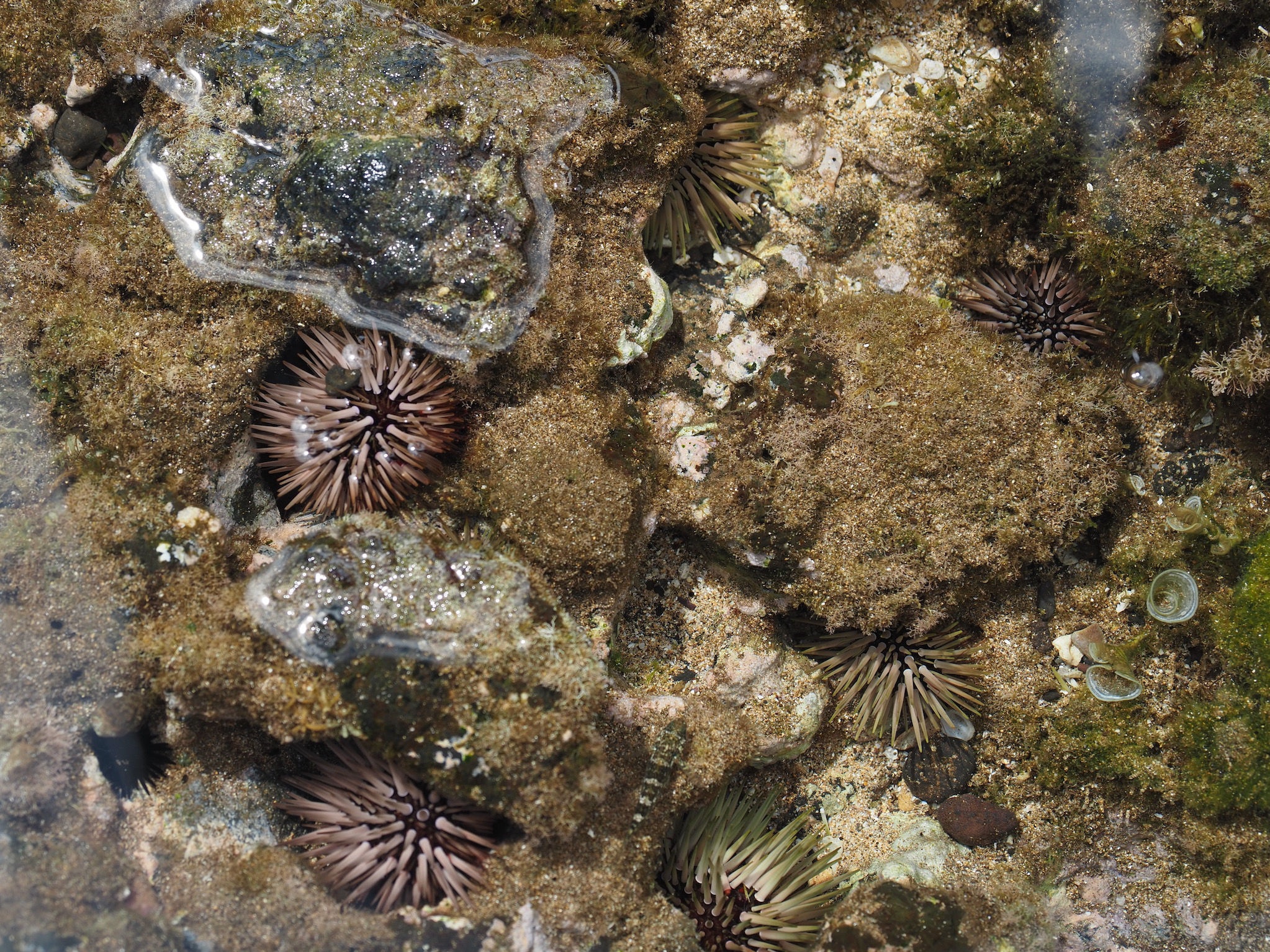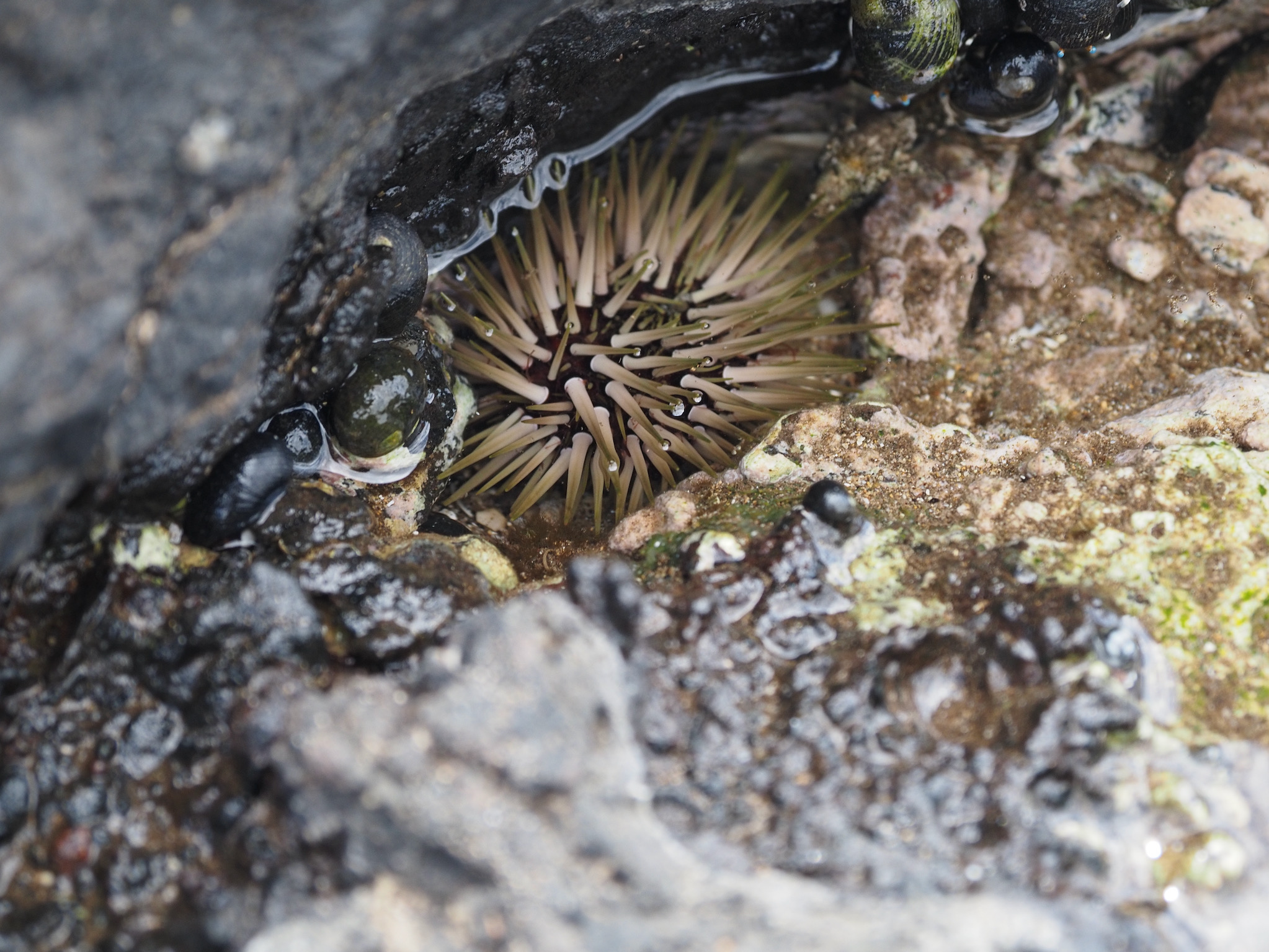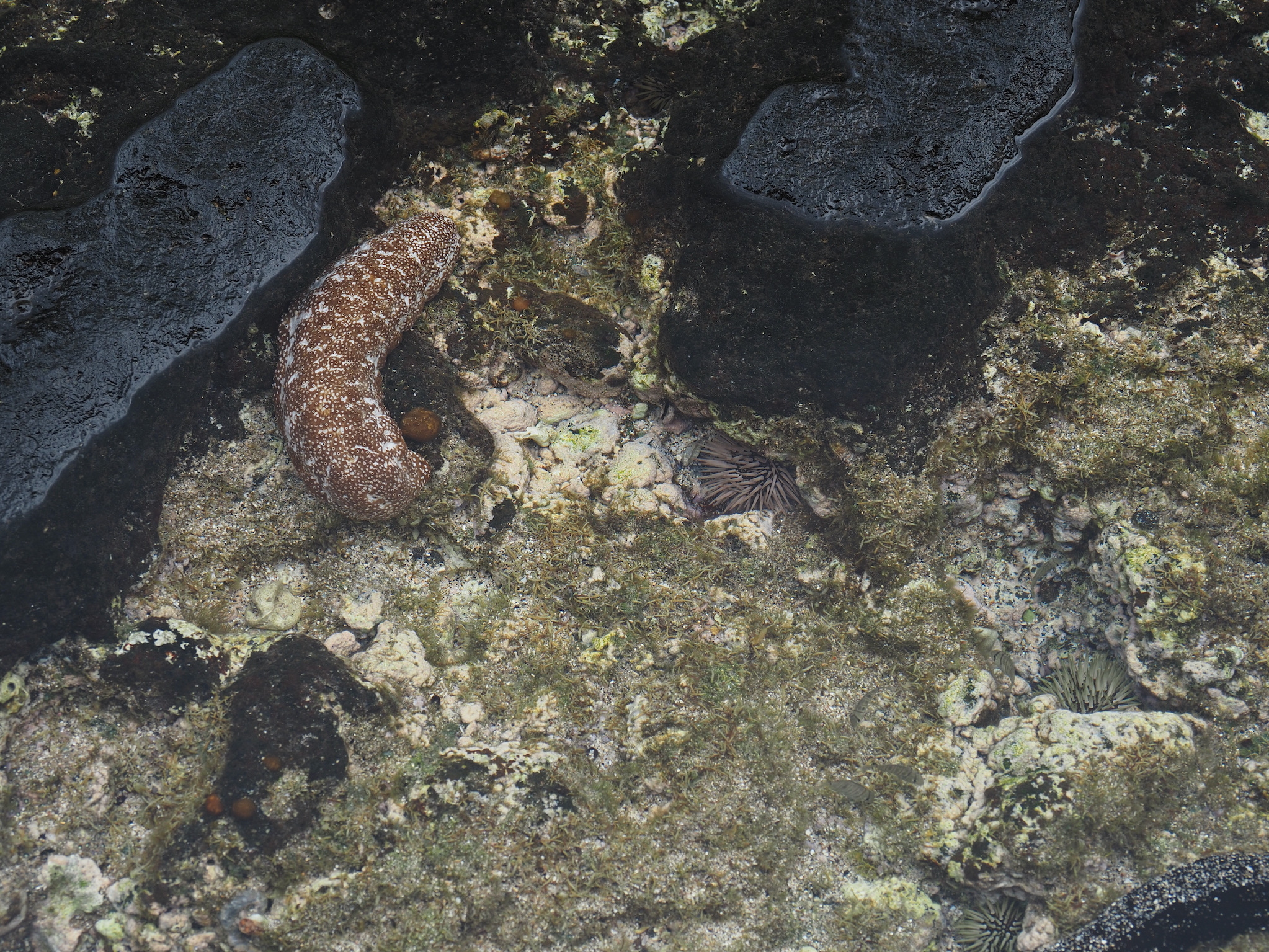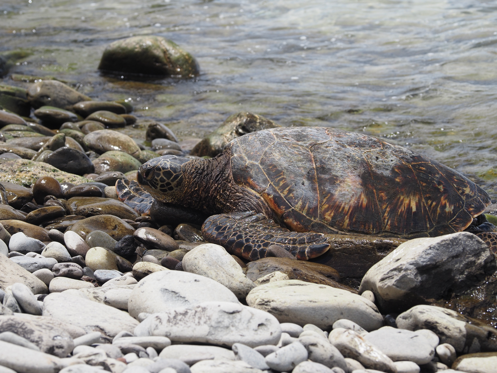 By the time we returned to the condo, the rain had mostly passed. From our lanai, we could see several turtles in the cove, and so we decided it was time to snorkel. We wandered out to the cove and to in the water. There, we were rewarded with views of fish, urchins, and, most of all, more than a dozen sea turtles. We mostly saw green sea turtles, and Kyle also saw a Hawksbill from a distance.