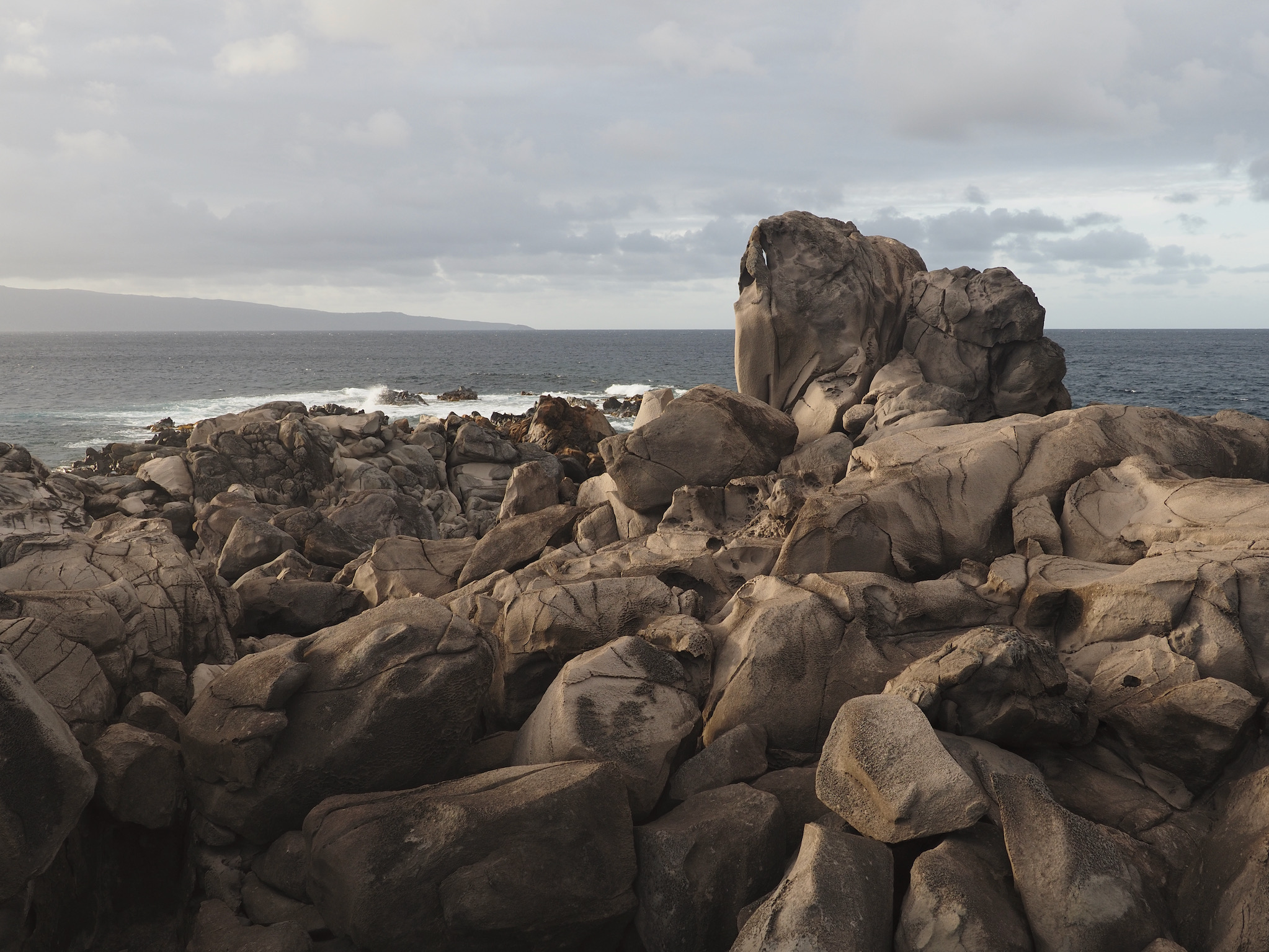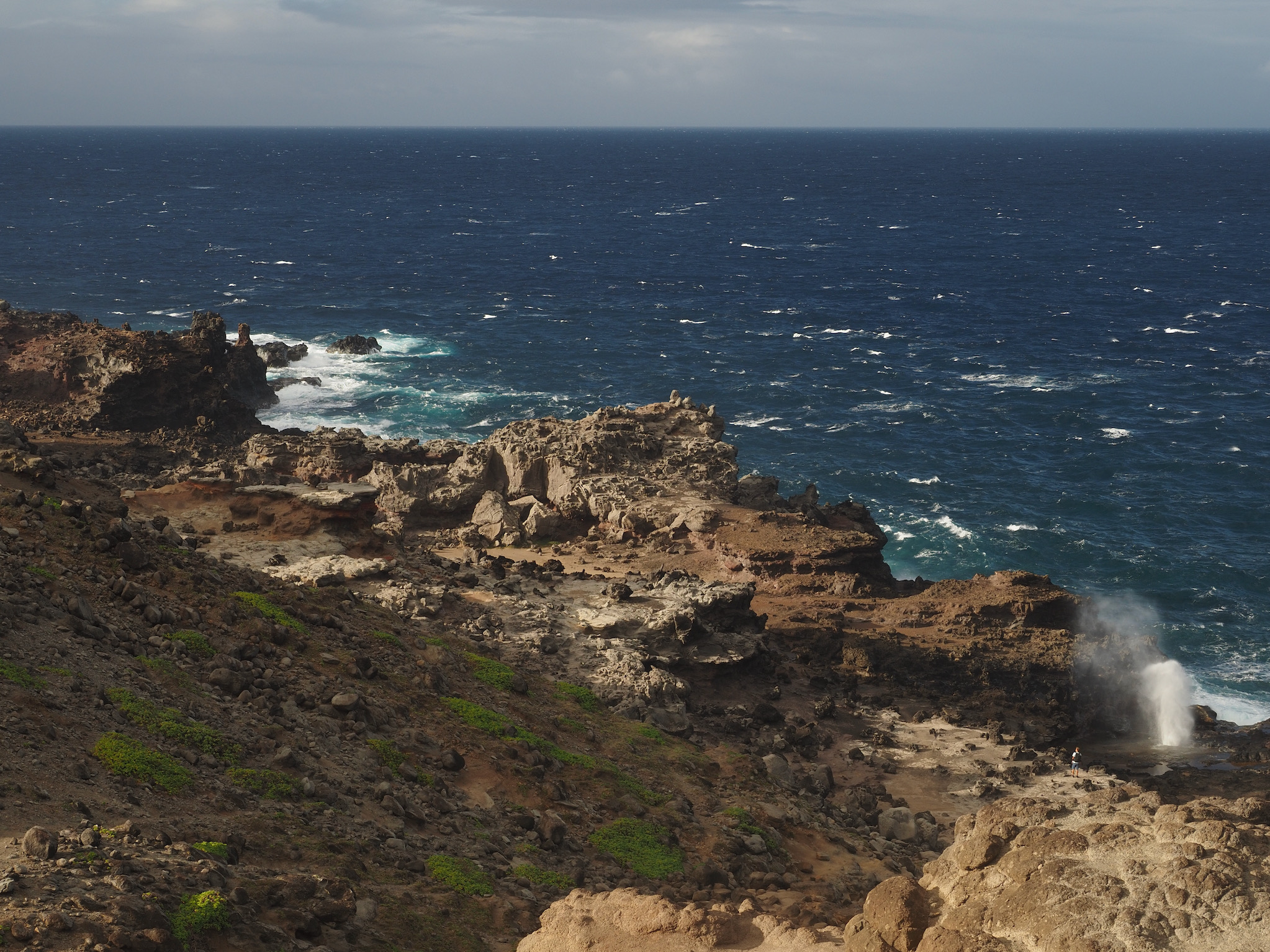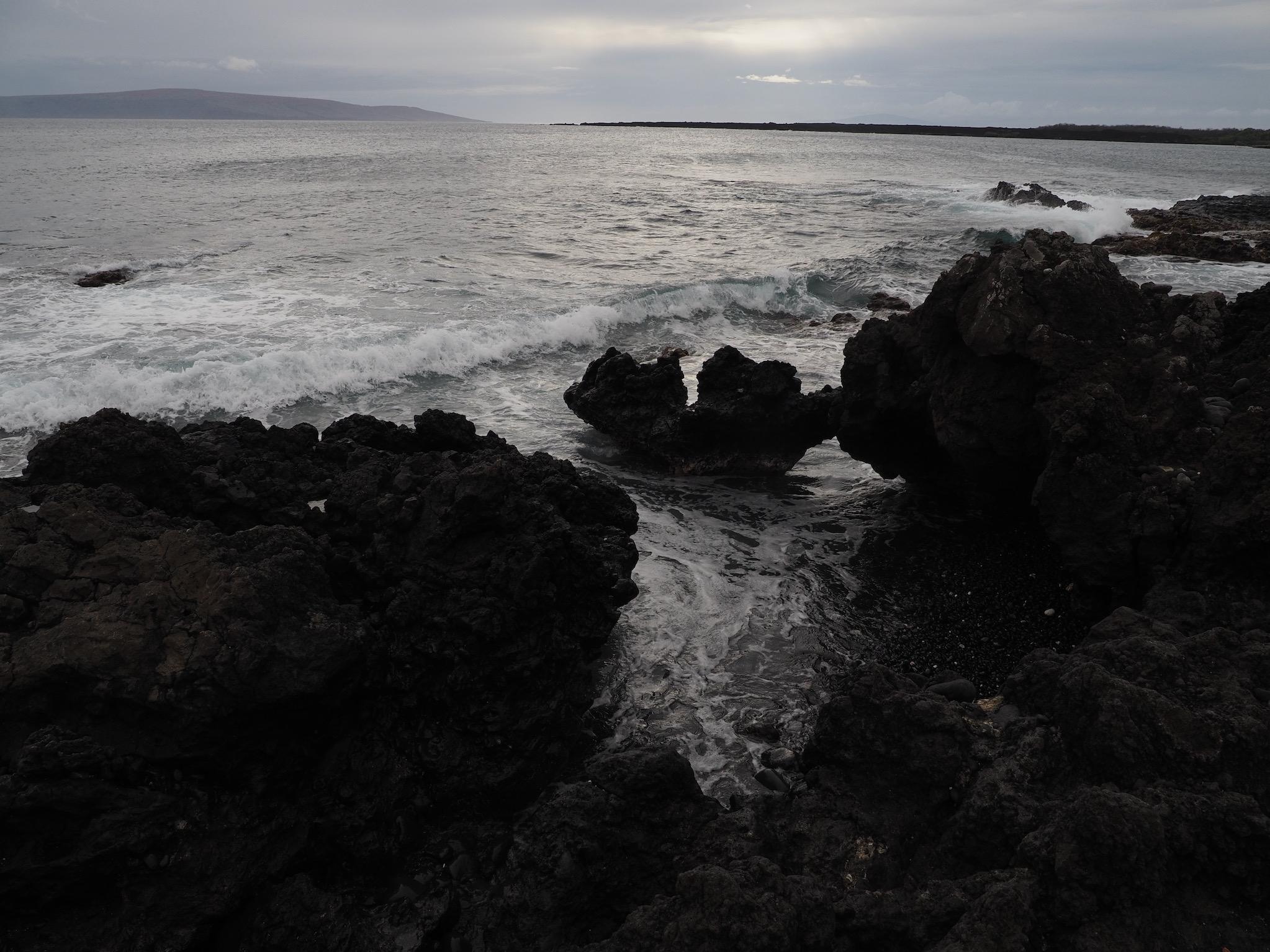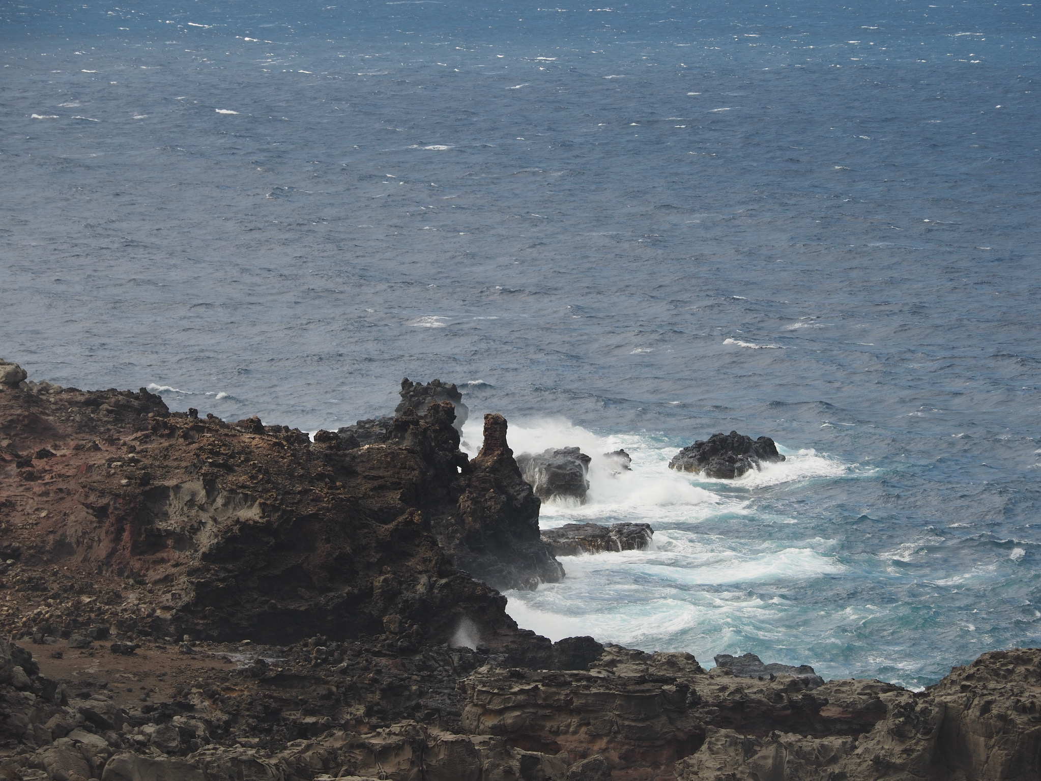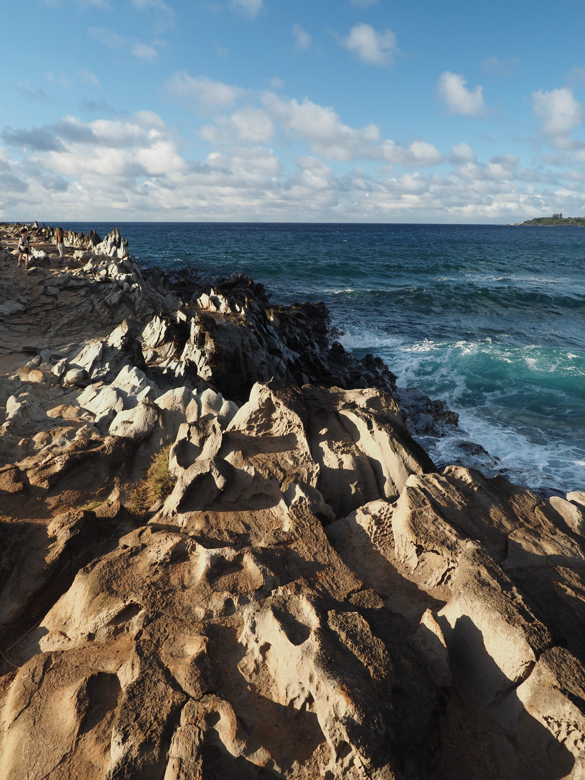We then set out for the lava fields and La Perouse Bay, south of Kihei, for a hike. Our route took us along the bay to Maui’s youngest lava flows. We then followed the 16th-century King’s Highway inland, before turning back to the coast for Hanomanioa Light. We alternately could have continued along to Kanaio Beach, for a longer hike. From the light, we followed the coast back to the bay and our car. This area also had many unique rock formations, including blowholes or trumpets and some sea arches.