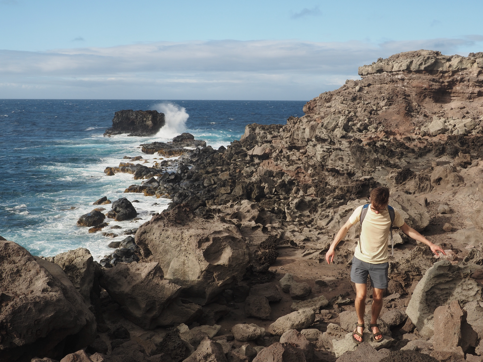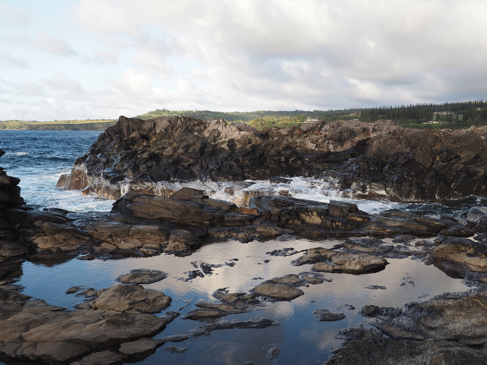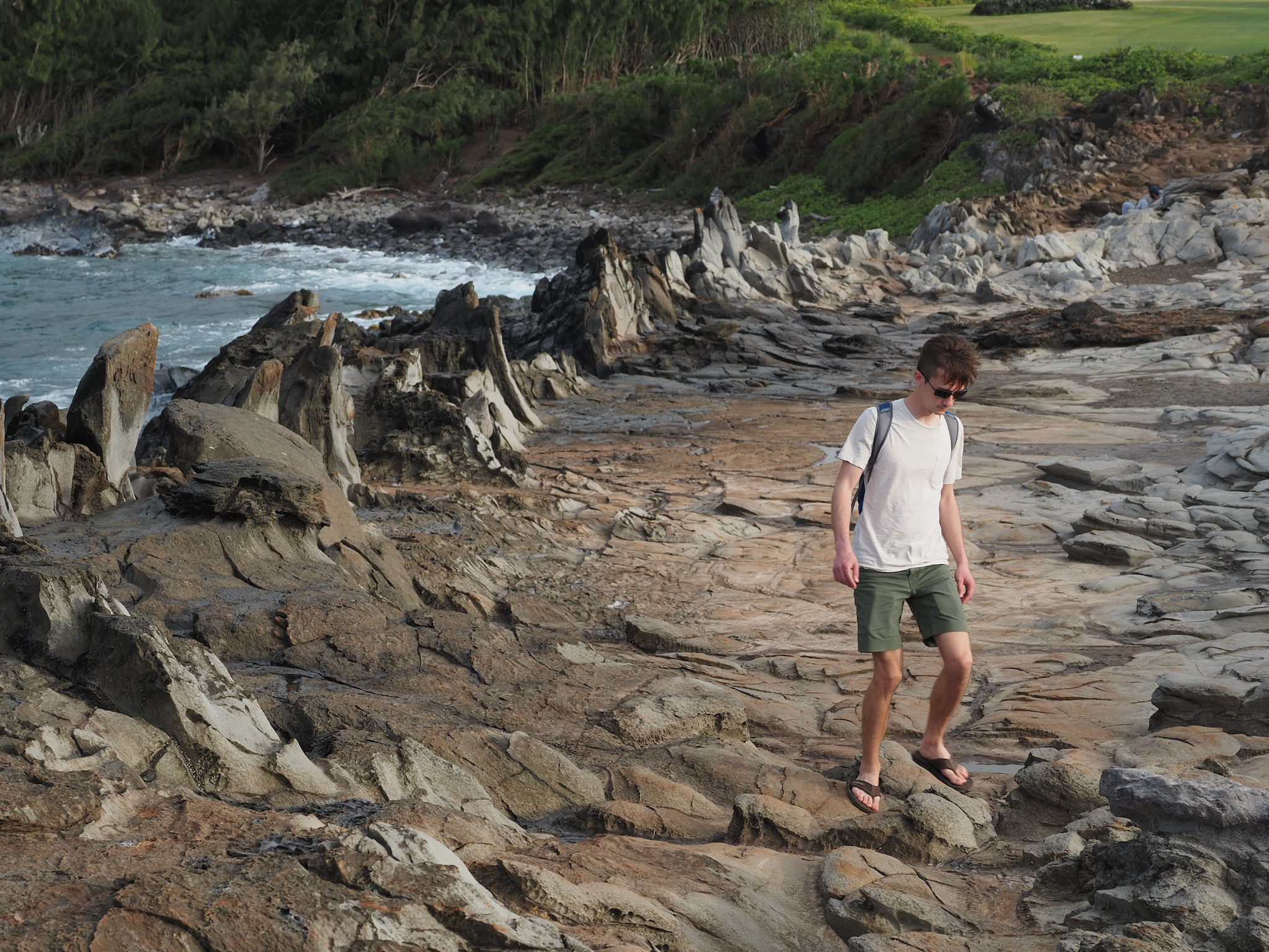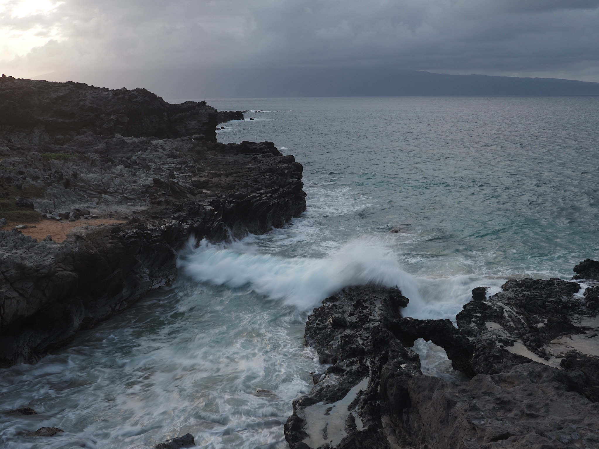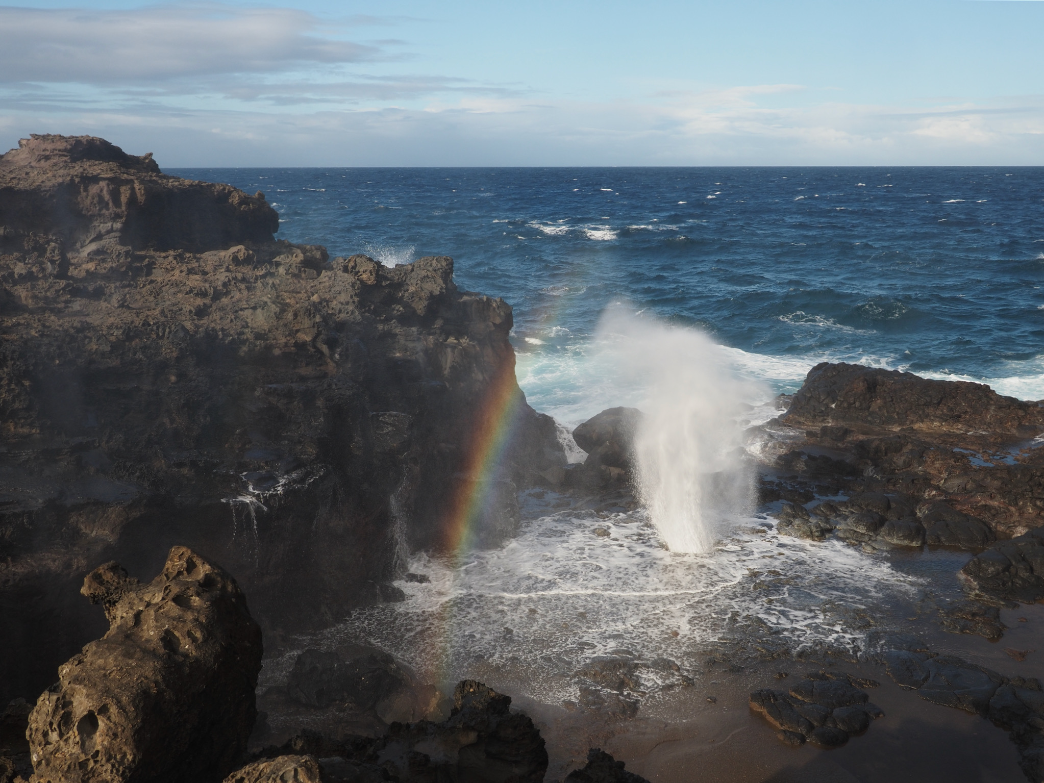 We then set out for the lava fields and La Perouse Bay, south of Kihei, for a hike. Our route took us along the bay to Maui’s youngest lava flows. We then followed the 16th-century King’s Highway inland, before turning back to the coast for Hanomanioa Light. We alternately could have continued along to Kanaio Beach, for a longer hike. From the light, we followed the coast back to the bay and our car. This area also had many unique rock formations, including blowholes or trumpets and some sea arches.