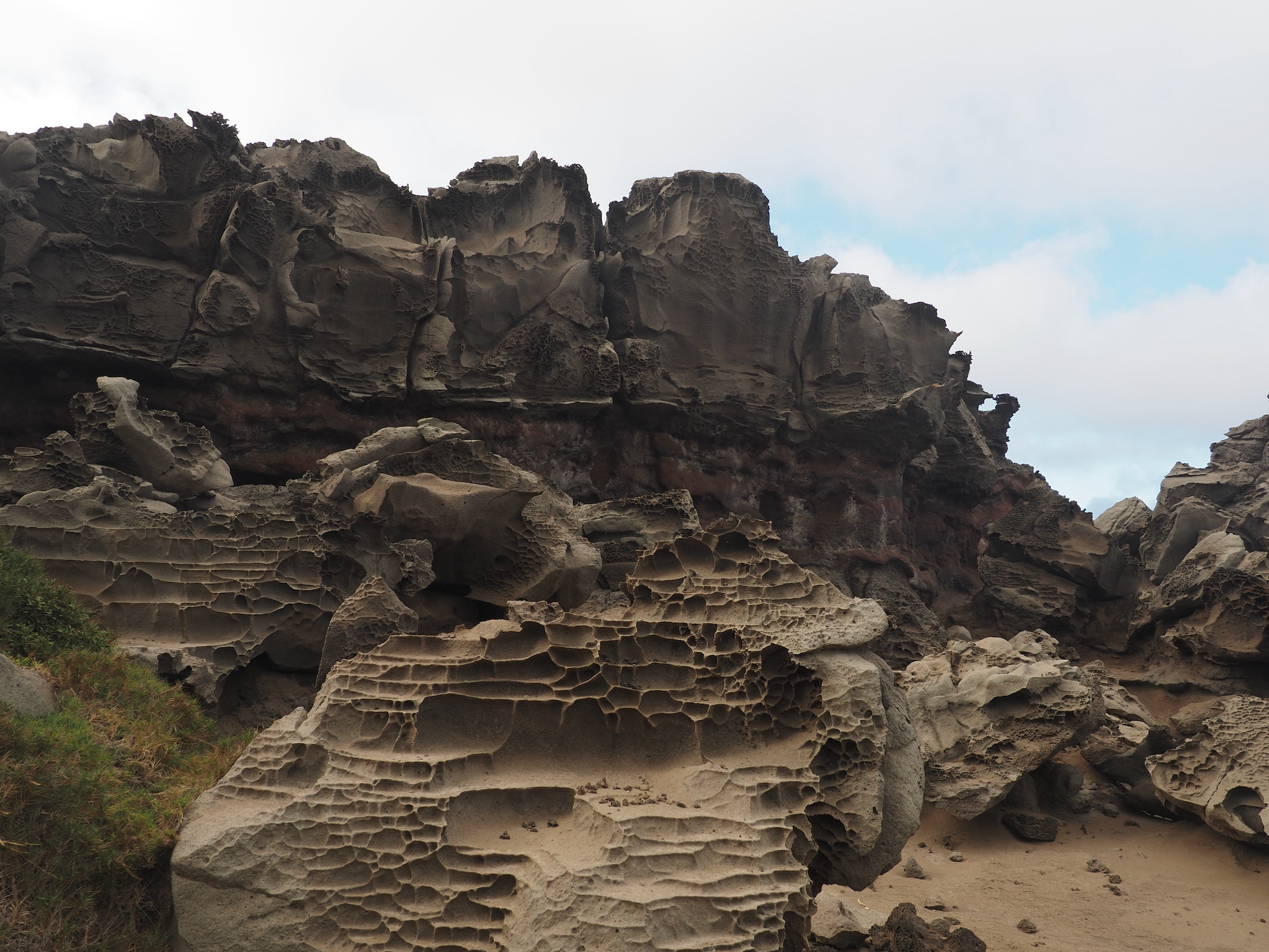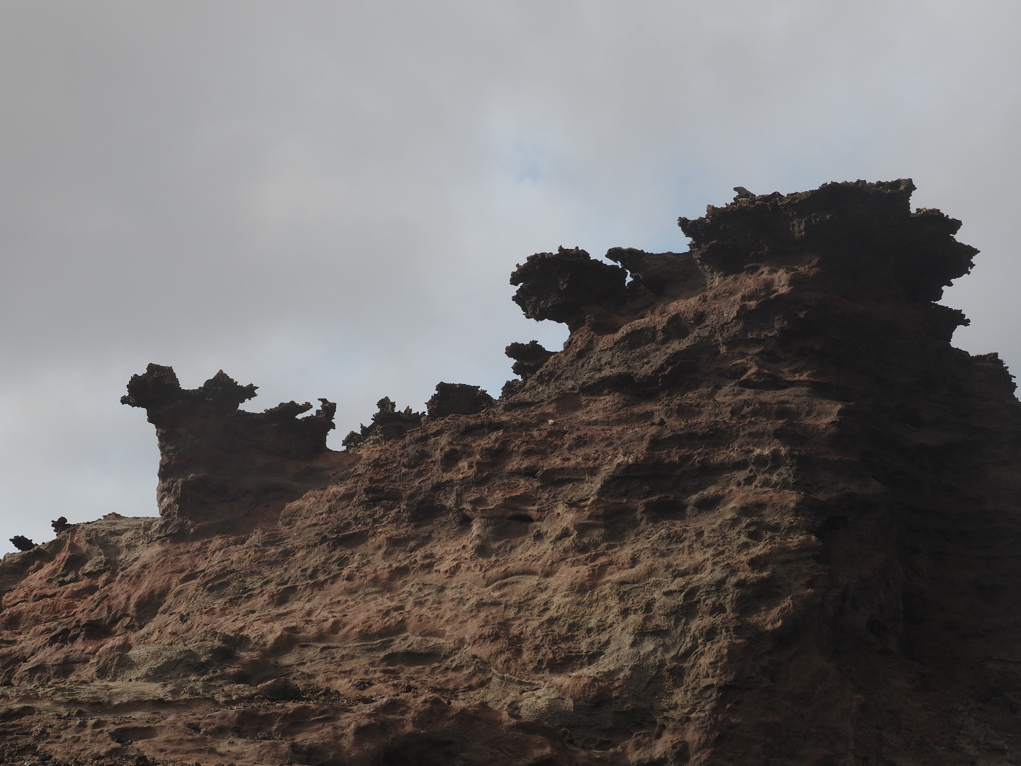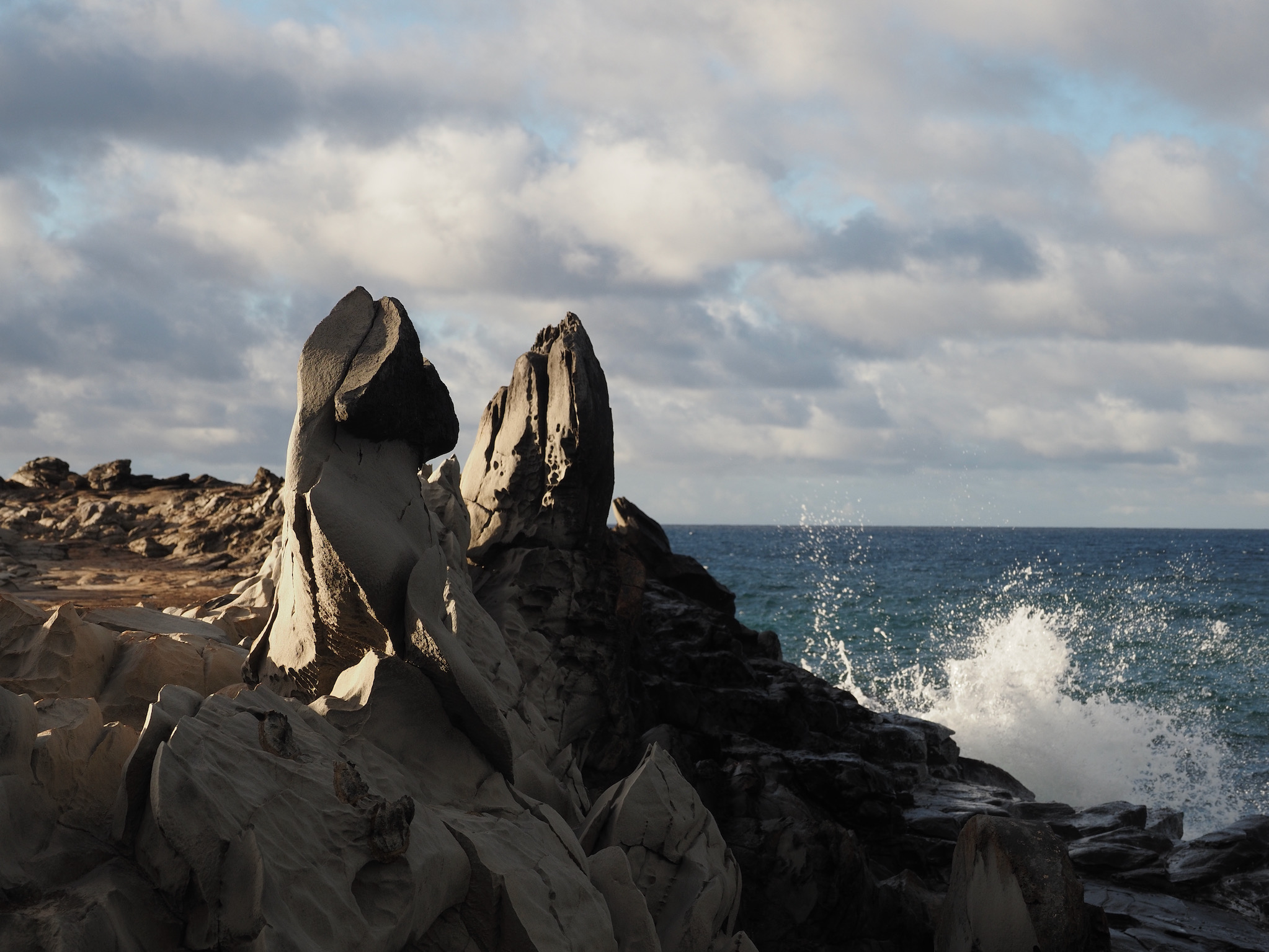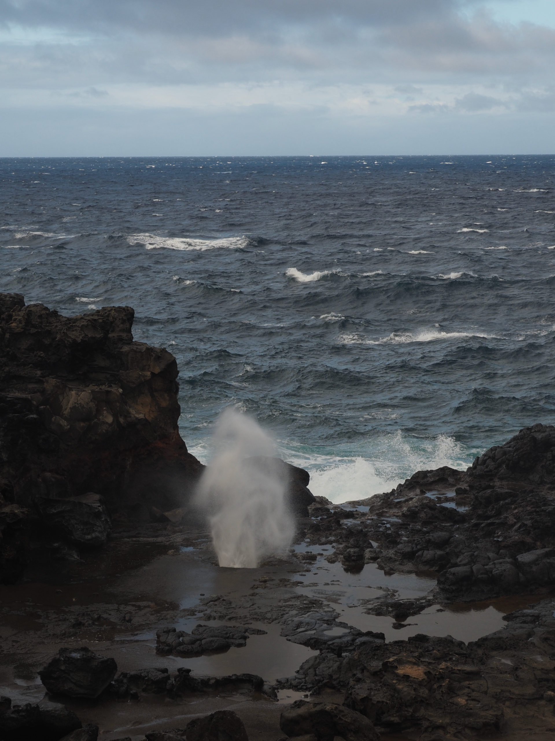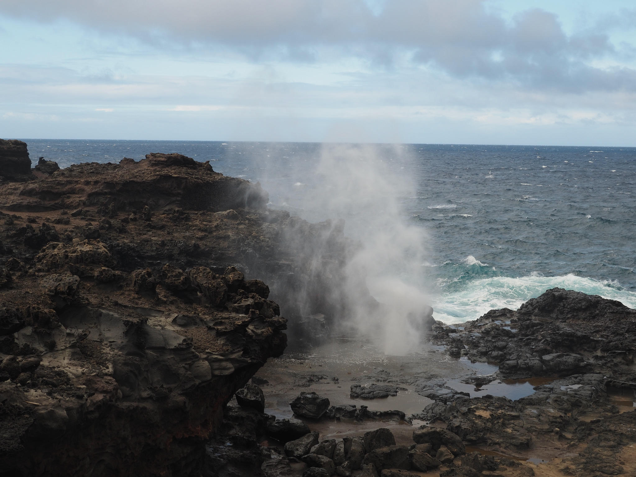 Once cleaned up, we read for a bit on the lanai. Then, we set out for Nā-kālele Point, with its blowhole and trails among unique rock formations that resulted from years of erosion. The blowhole was one of the most impressive we’ve seen, and we watched it several times from a safe distance. I think we both enjoyed exploring the rock formations even more, though. Each turn brought a somewhat different set of shapes, textures, and colors.