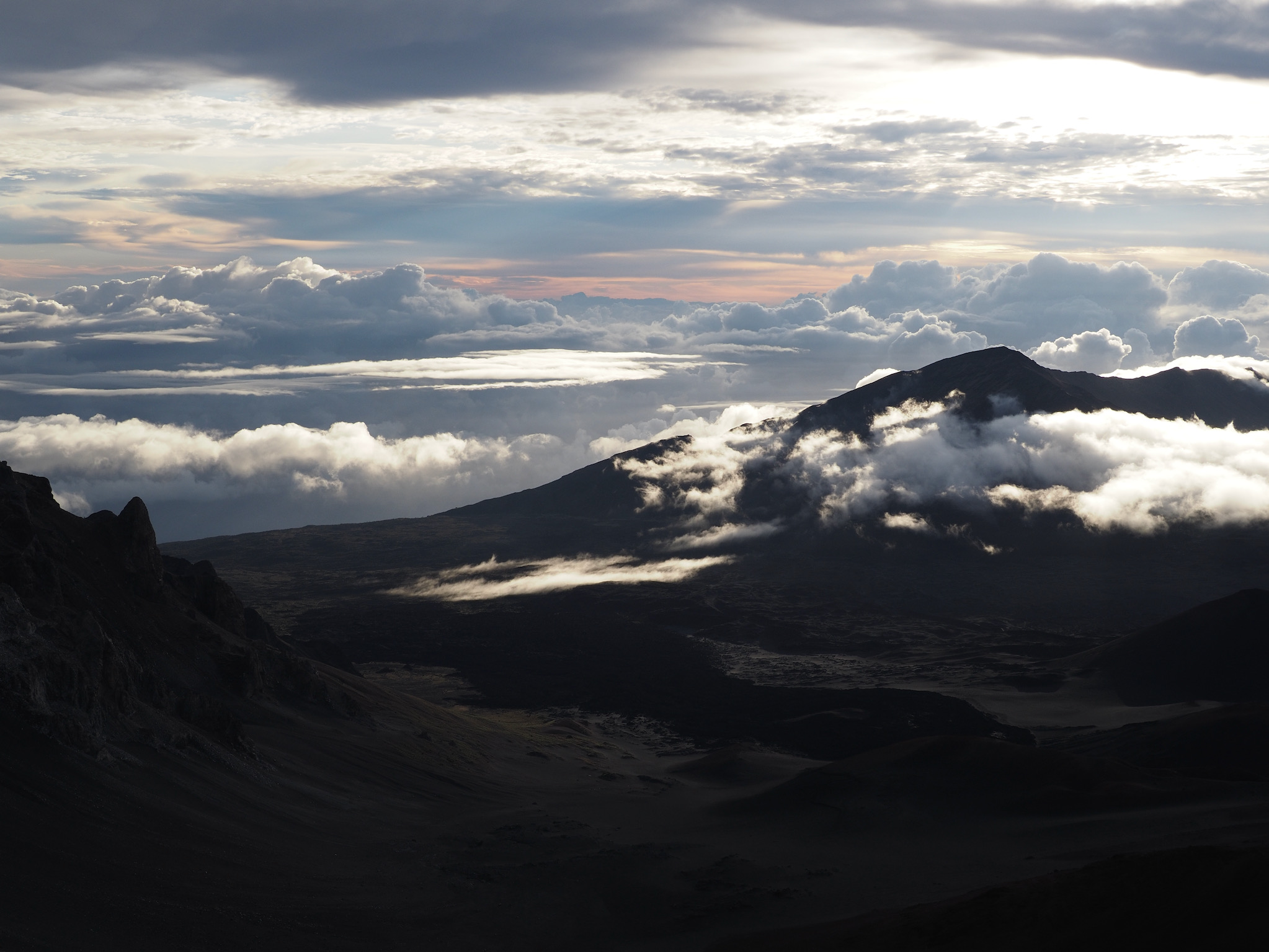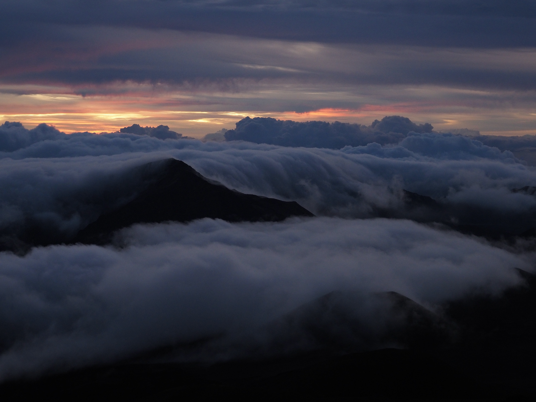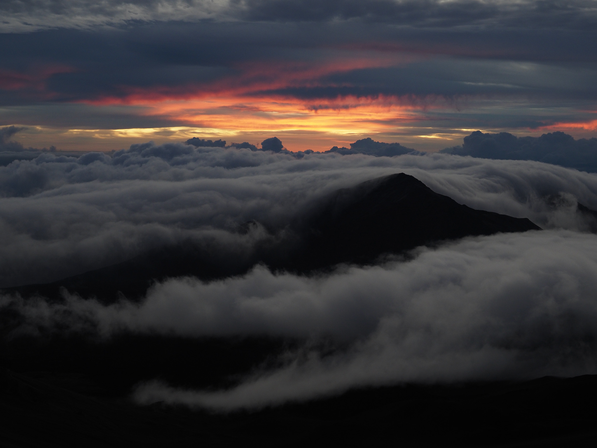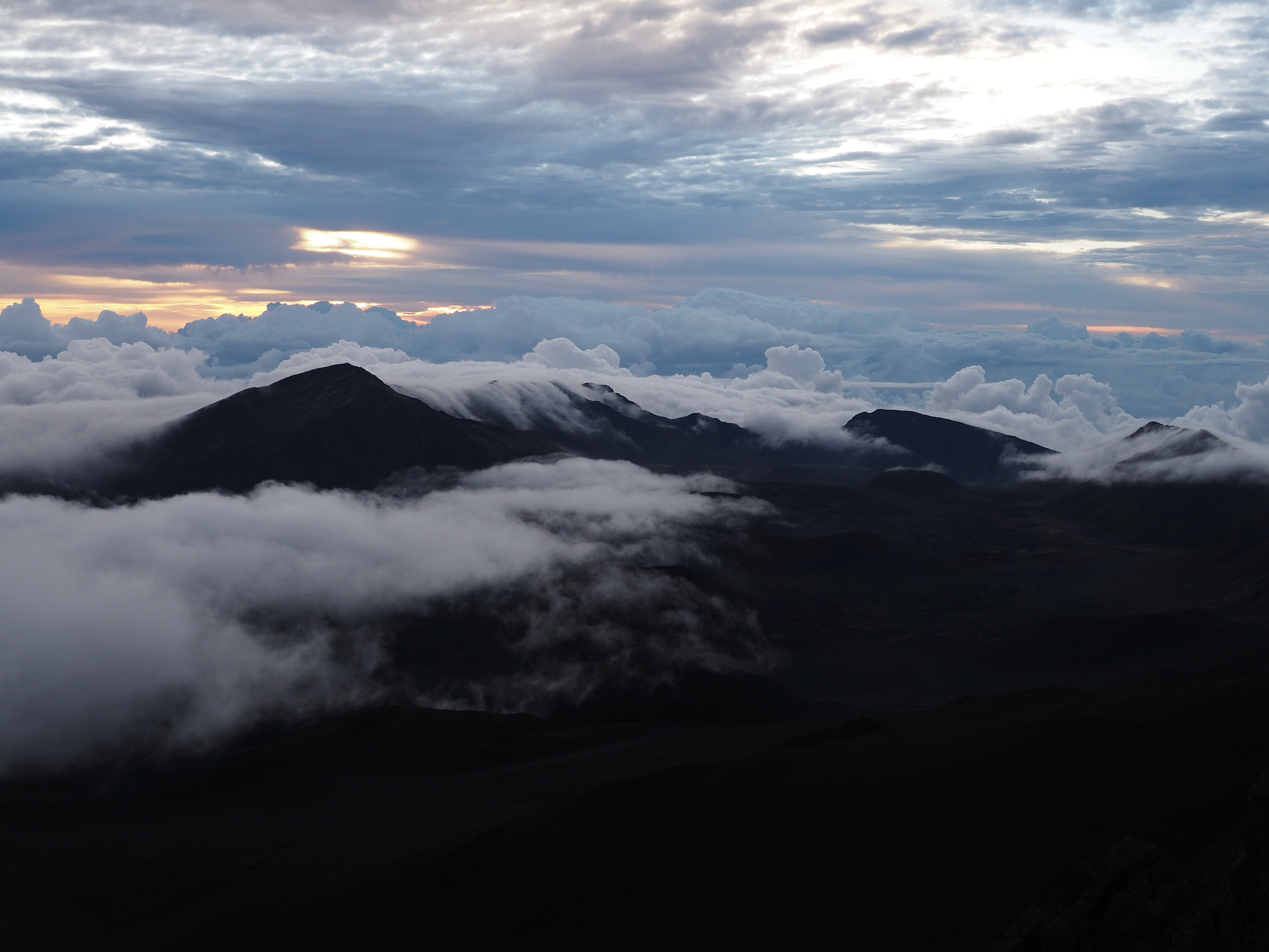 While the drive from Kula to the summit had been short, the drive from Kihei to the summit was closer to 90 minutes. That meant we had to leave by 4am to have some margin for error for a 5:52am sunrise. We made it with plenty of time to spare and enjoyed the lovely sunrise as clouds drifted in through the gaps in the mountains.