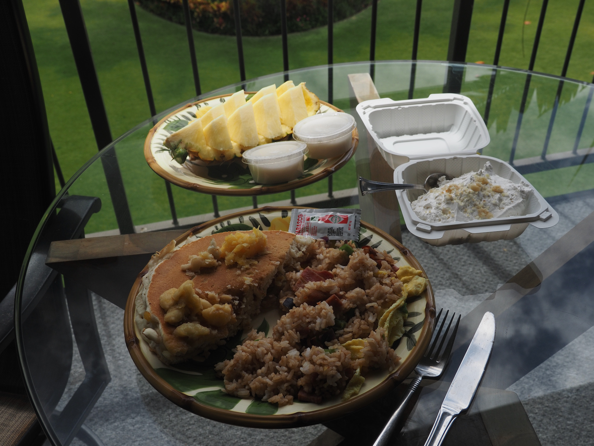 After our snorkel, we decided to try the well-known breakfast spot, The Gazebo. Though it was near their closing time, they were happy to take our call-in order, which was ready by the time we walked over to pick it up. We brought the food back to the condo and ate on the lanai. We shared pineapple spears and their two best known dishes: combo pancakes (banana, pineapple, white chocolate macadamia chips, and coconut syrup) and fried rice. The portions were huge, and left us in a bit of a food coma.