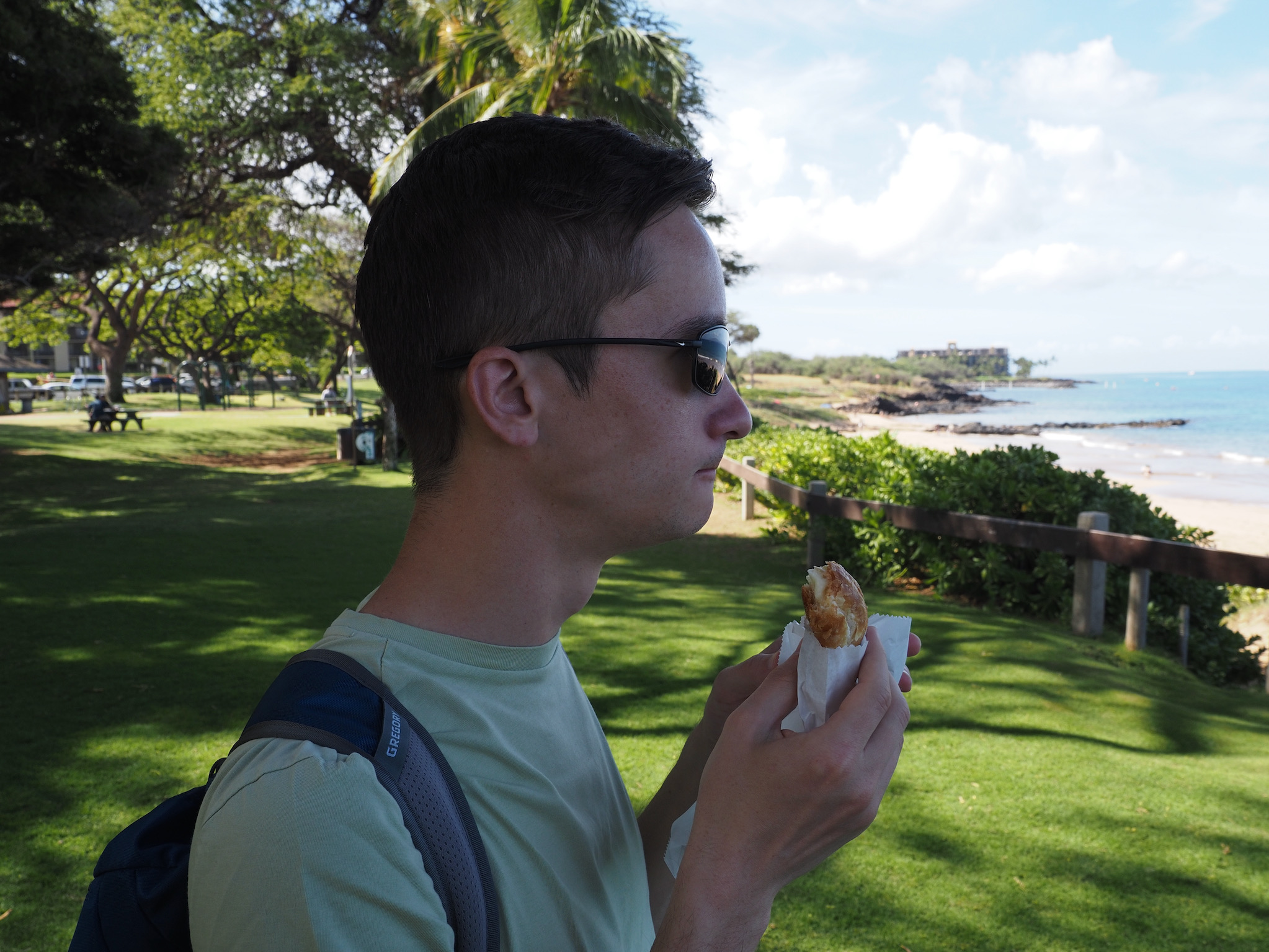 Always eager to try another bakery, we walked to Maui Bread in the morning to pick up breakfast. Their offerings included an appealing combination of Hawaiian ingredients and classic German items. We took our food back to Kamaole II beach to eat, sharing a cinnamon roll and almond croissant, both very good. We also had picked up a pineapple loaf and a Hawaiian loaf (carrot, raisin, pineapple?), intended them to be our snacks for the next few days. I don’t think our pineapple loaf survived the morning.