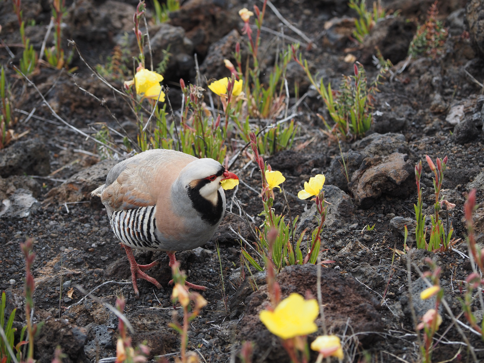 We then ate our remaining Hawaiian loaf for breakfast and set out for a hike into Haleakalā’s eroded summit. As we descended, clouds continued to build. Once the fog became thick enough to block most views, we decided to turn around. Along the way, we saw chukars systematically devouring yellow flowers. Though they are introduced birds, they seem to have taken well to life in the lava landscape.