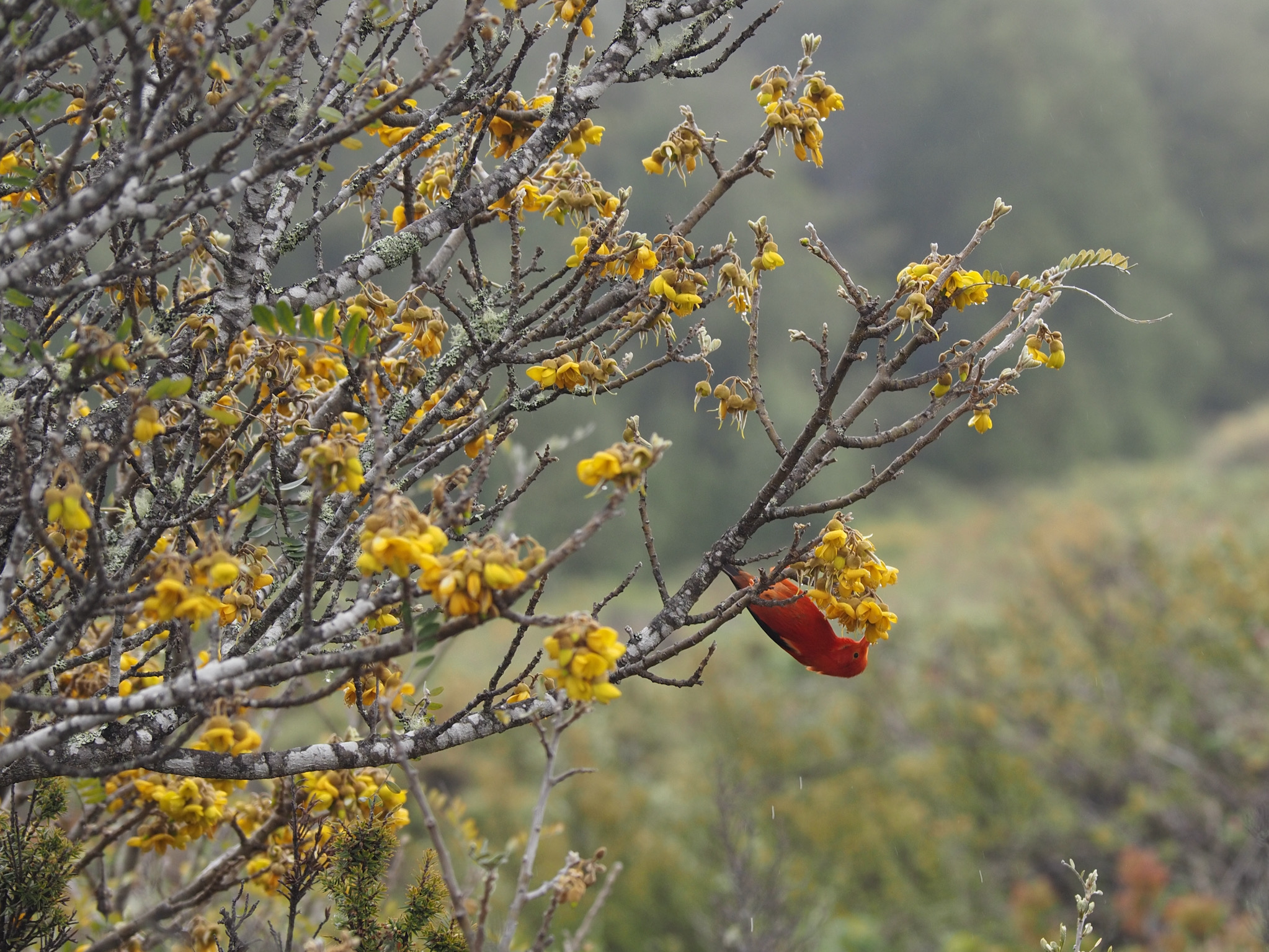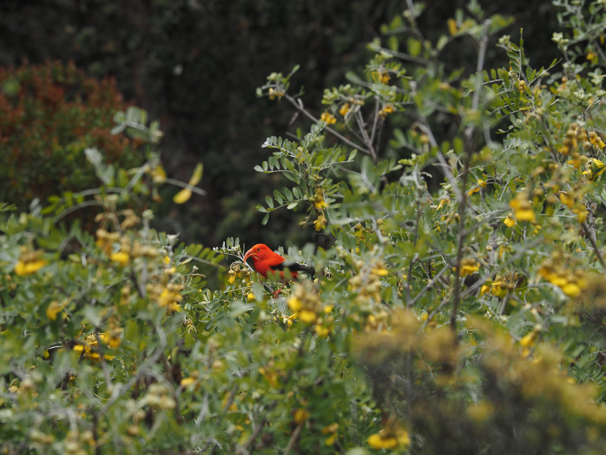 We drove down the mountain. Back below the clouds, we stopped at Hosmer Grove for the short loop trail through the forest. When planning the trip, I had seen this was a potentially good spot for seeing birds. We were soon rewarded with great views of red ‘Apapane and ‘I’iwi, as well as a Pueo, Hawaii’s only native owl.