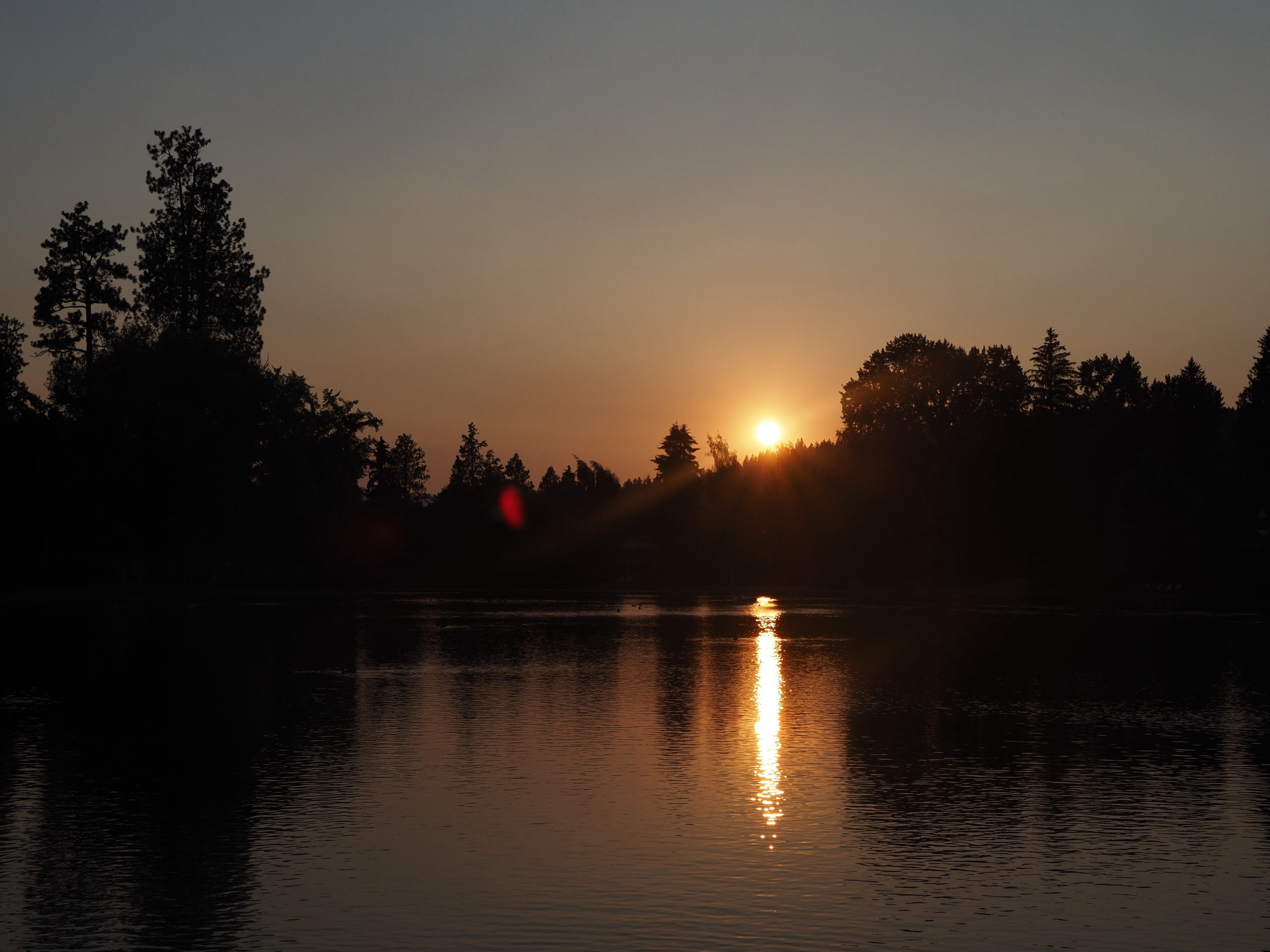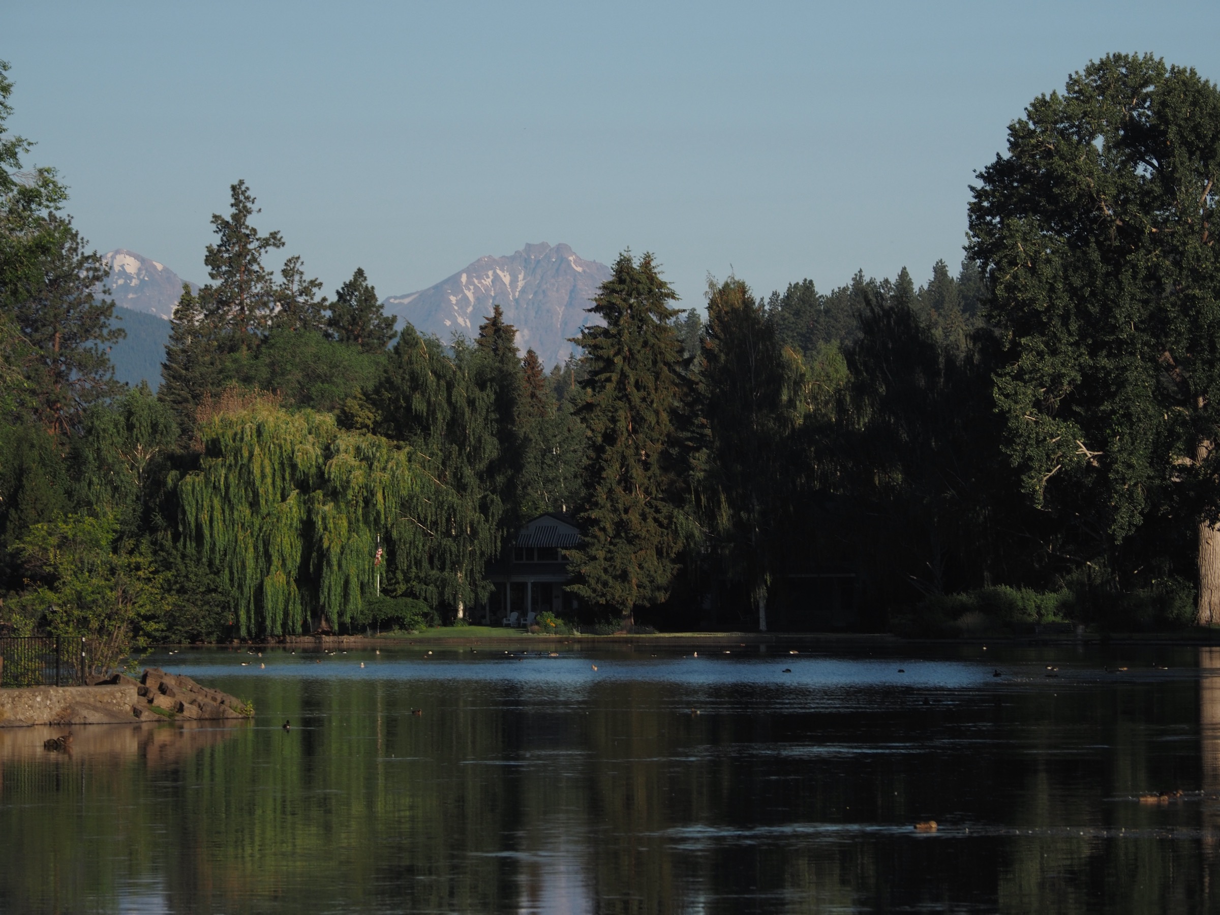 In the morning, we woke up, got doughnuts from Sweetheart Donuts (fine but not standout) and then back to downtown Bend for coffee from Bellatazza. We ate our doughnuts and coffee in Drake Park, by Mirror Pond. There, wildfire smoke had cleared enough that we had better views of the Sisters than the previous night.
