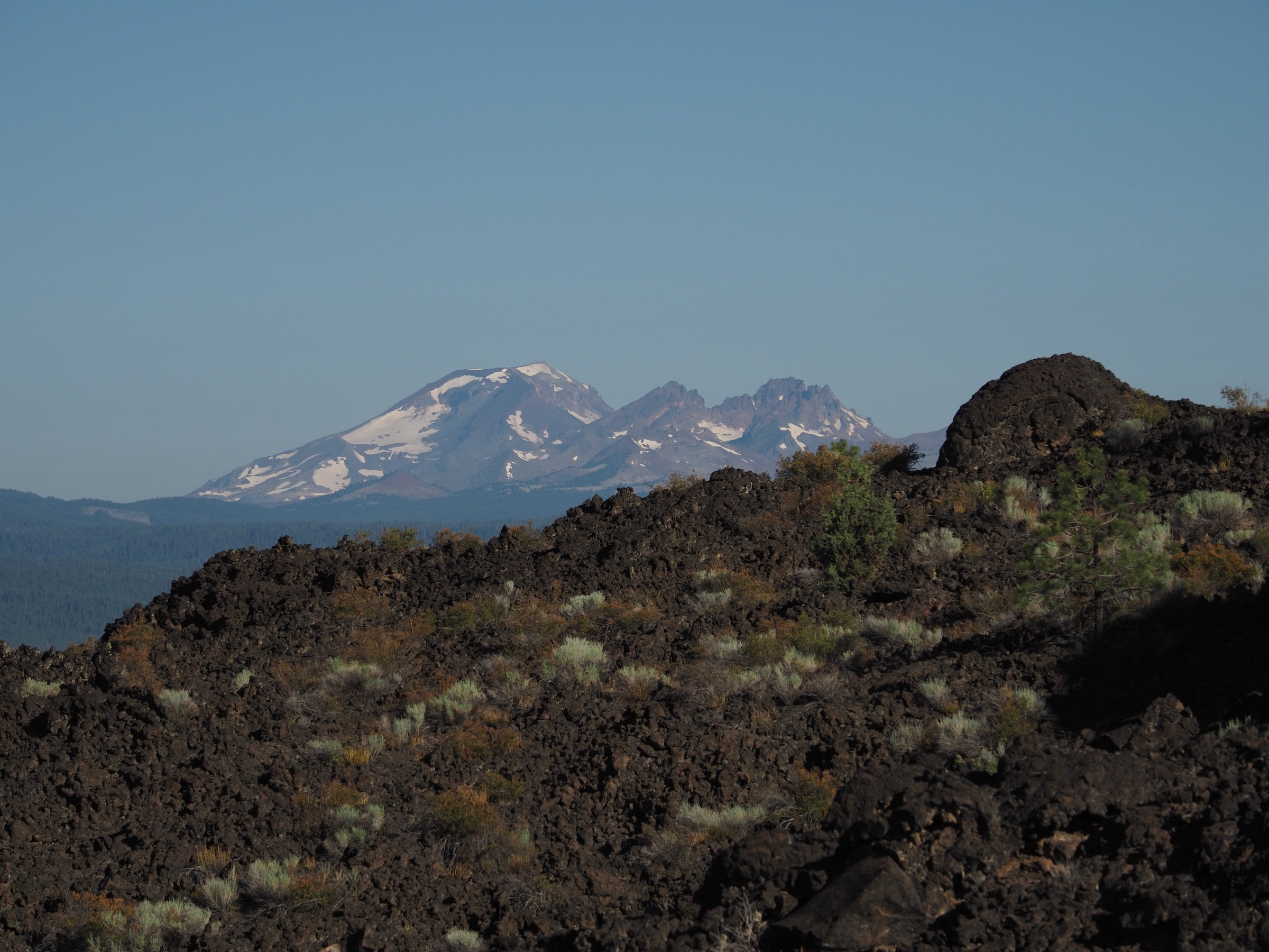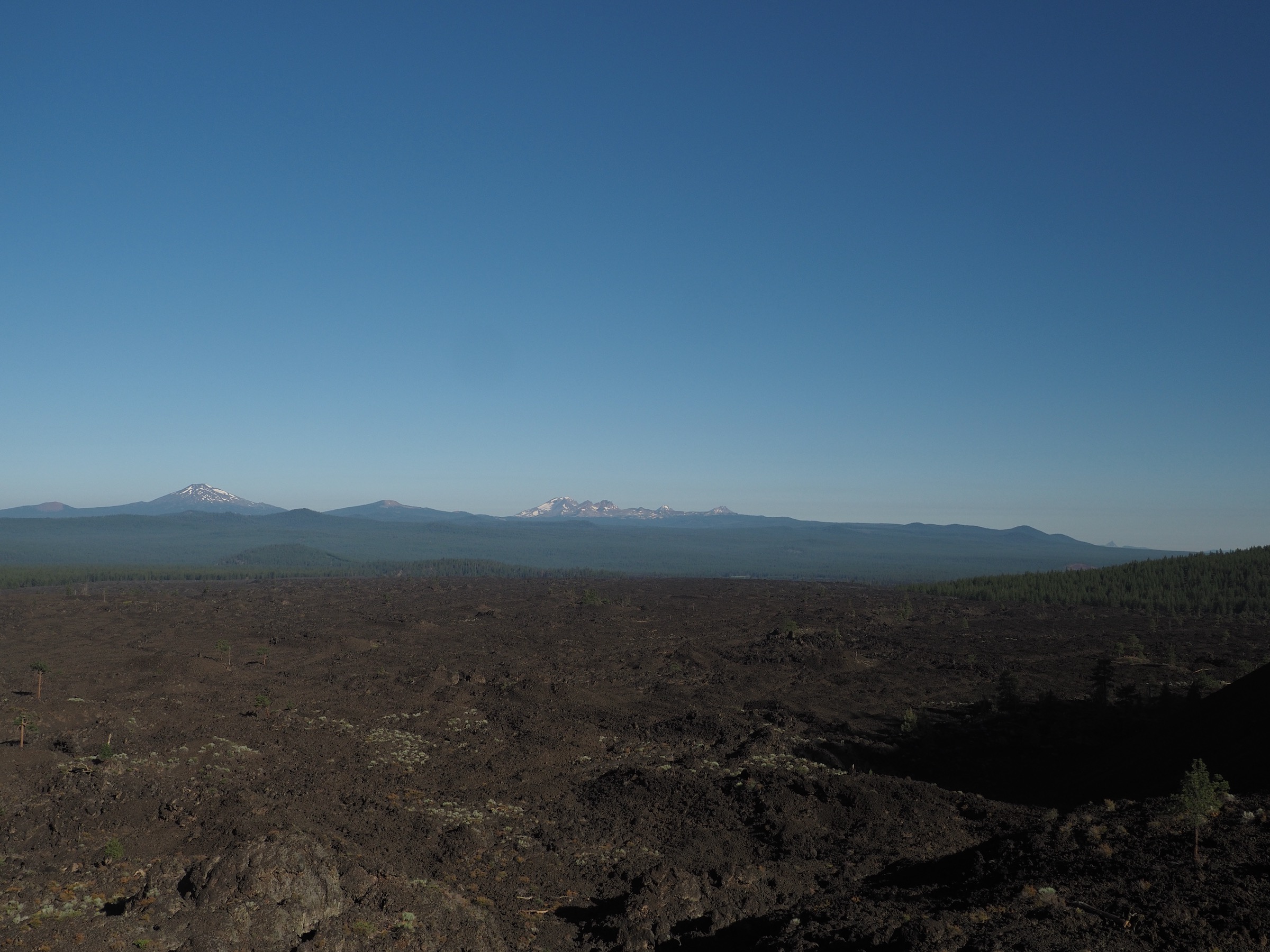 From the visitor center, we walked the Trail of the Molten Land, which wound among basalt flows for about a mile. The trail featured excellent views, including of the lava flows up close, Lava Butte above, and the Sisters mountains in the distance. We had also hoped to visit the top of Lava Butte, but the shuttle was not running early in the morning and the road to the summit was gated. We considered walking up, but we had other priorities for the limited time in our day.