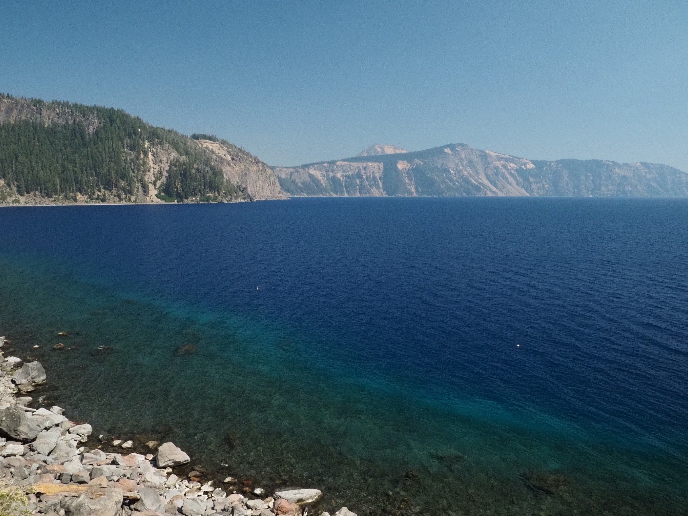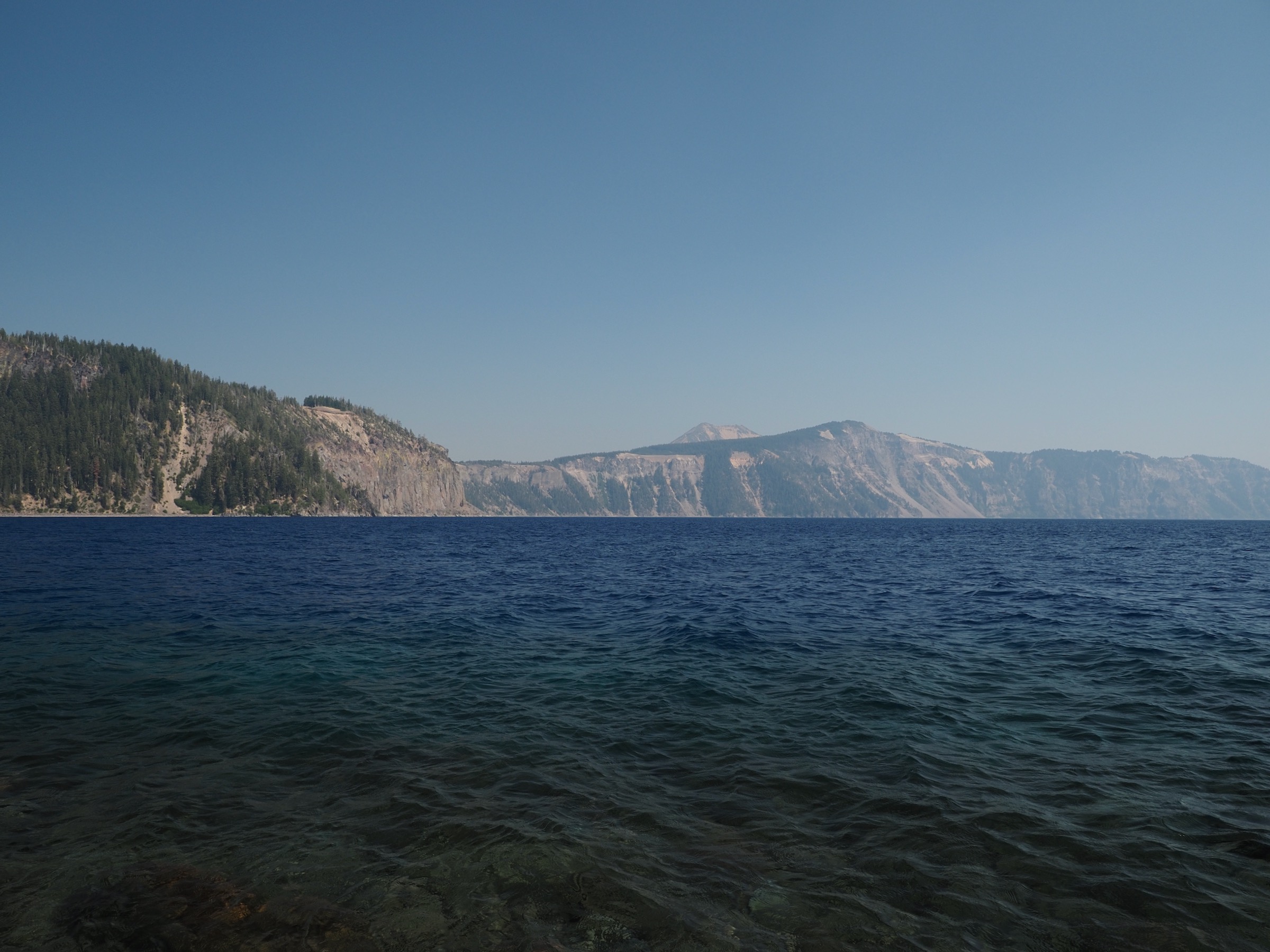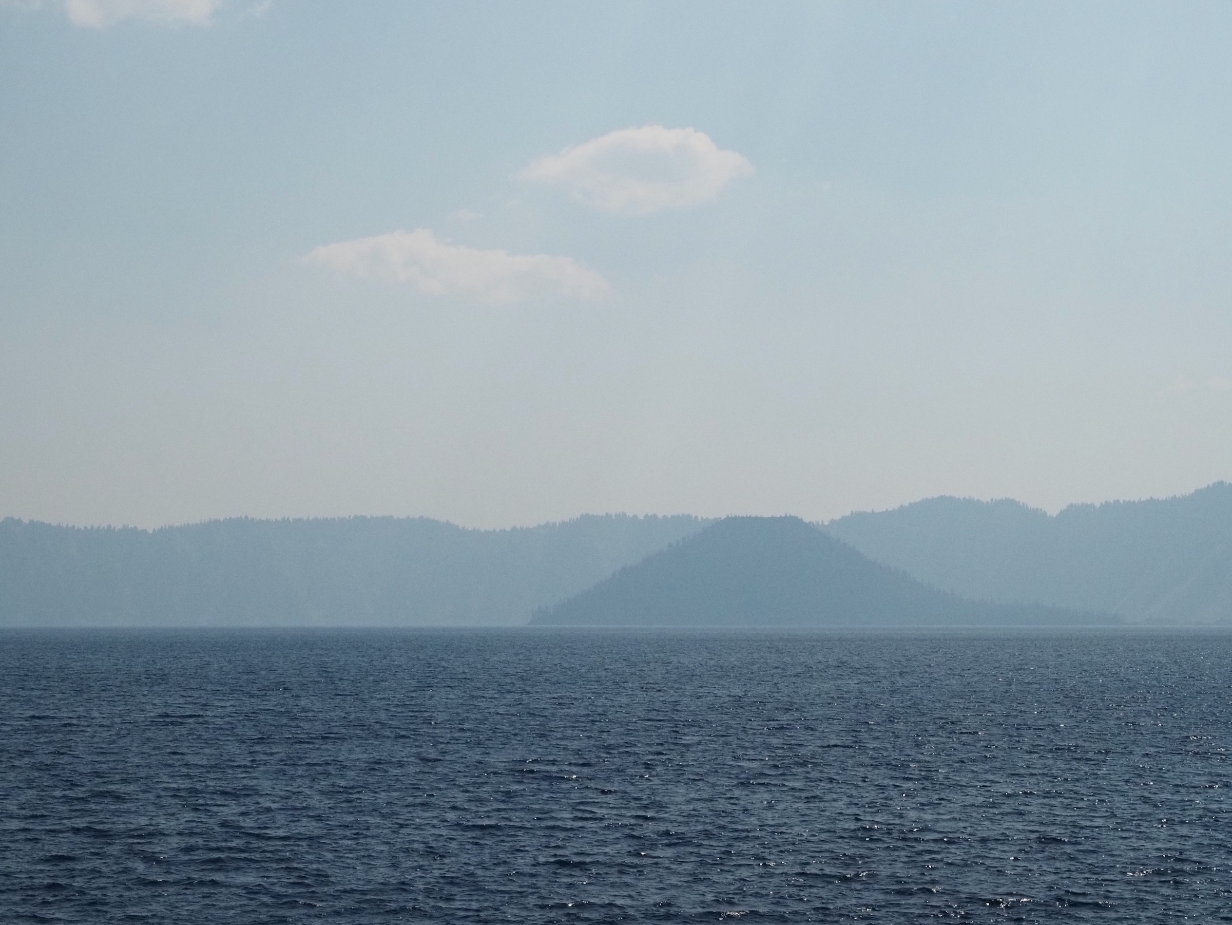 From this viewpoint, we proceeded clockwise around the lake, stopping at almost every viewpoint. Unfortunately, the smoke–already limiting visibility when we arrived–was rapidly thickening. Because of this, we decided to take the hike down the Crater Rim to the lakeside at Cleetwood Cove. For 1.1 miles, each way, this trail switchbacks down to the beautiful blue water. With a warm day, the trail was crowded, but we still had no problem finding a spot to hang out at the lake. Park rangers were checking that people had appropriate water. They were also reminding folks about what was and was not allowed in the lake, to prevent contamination.