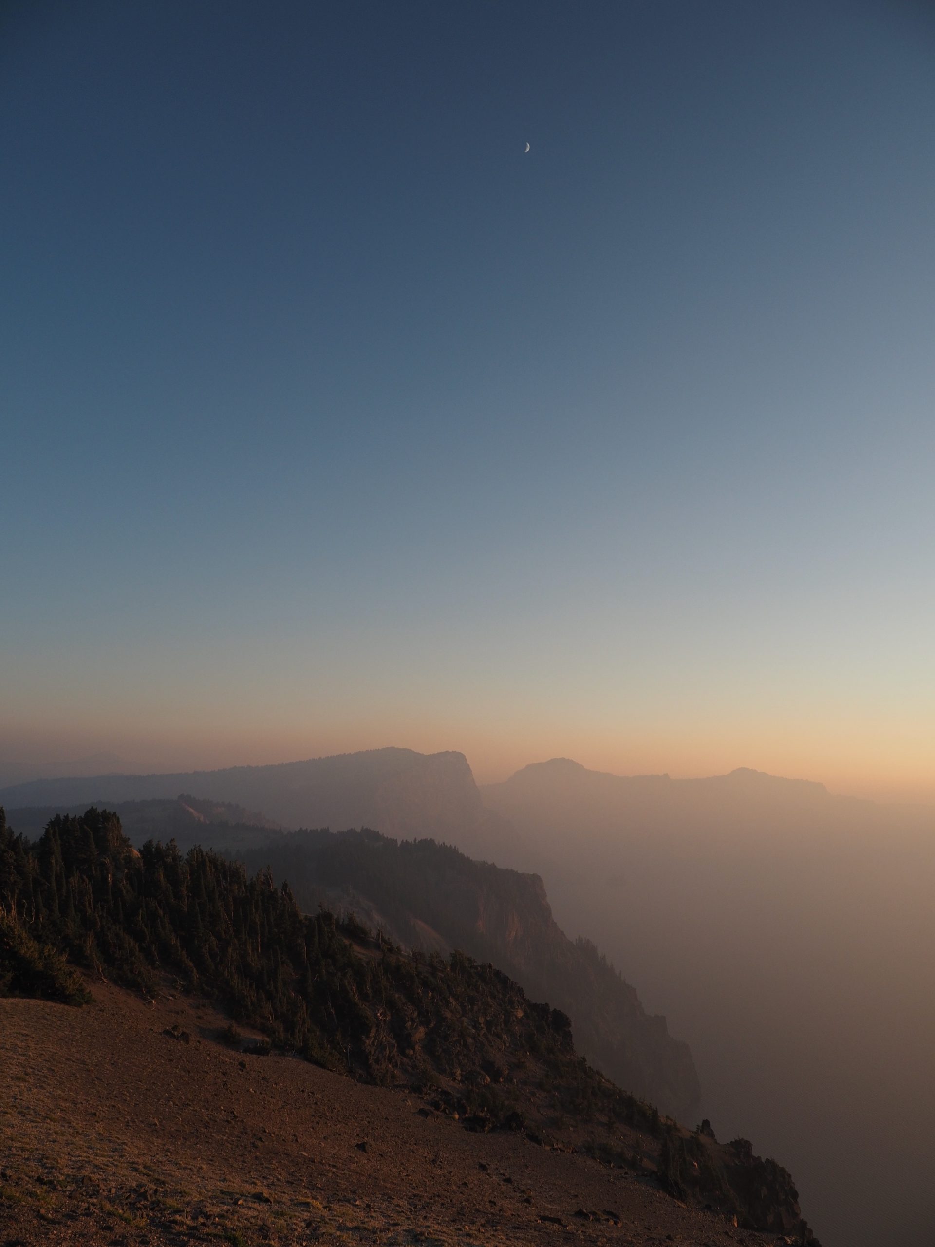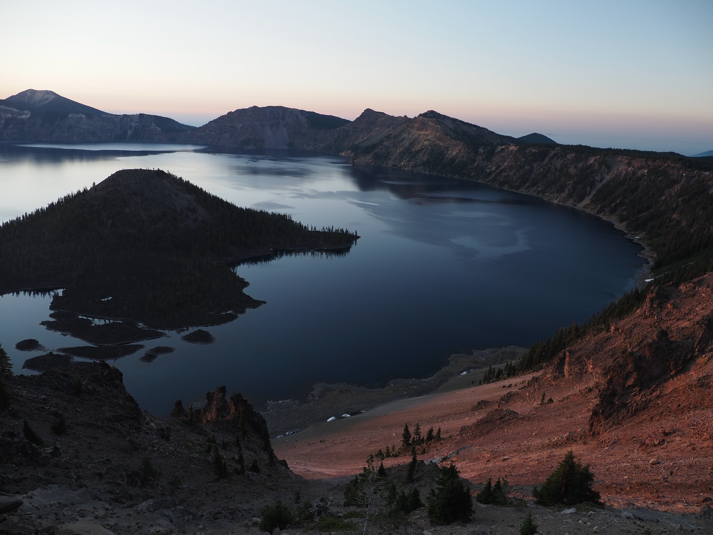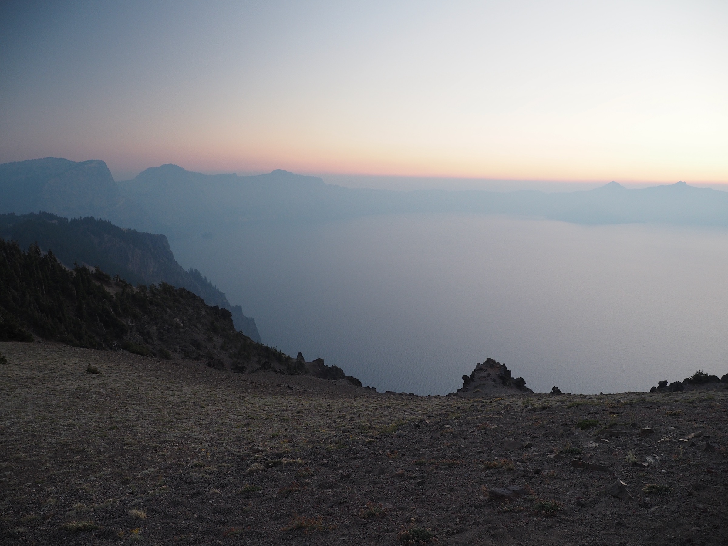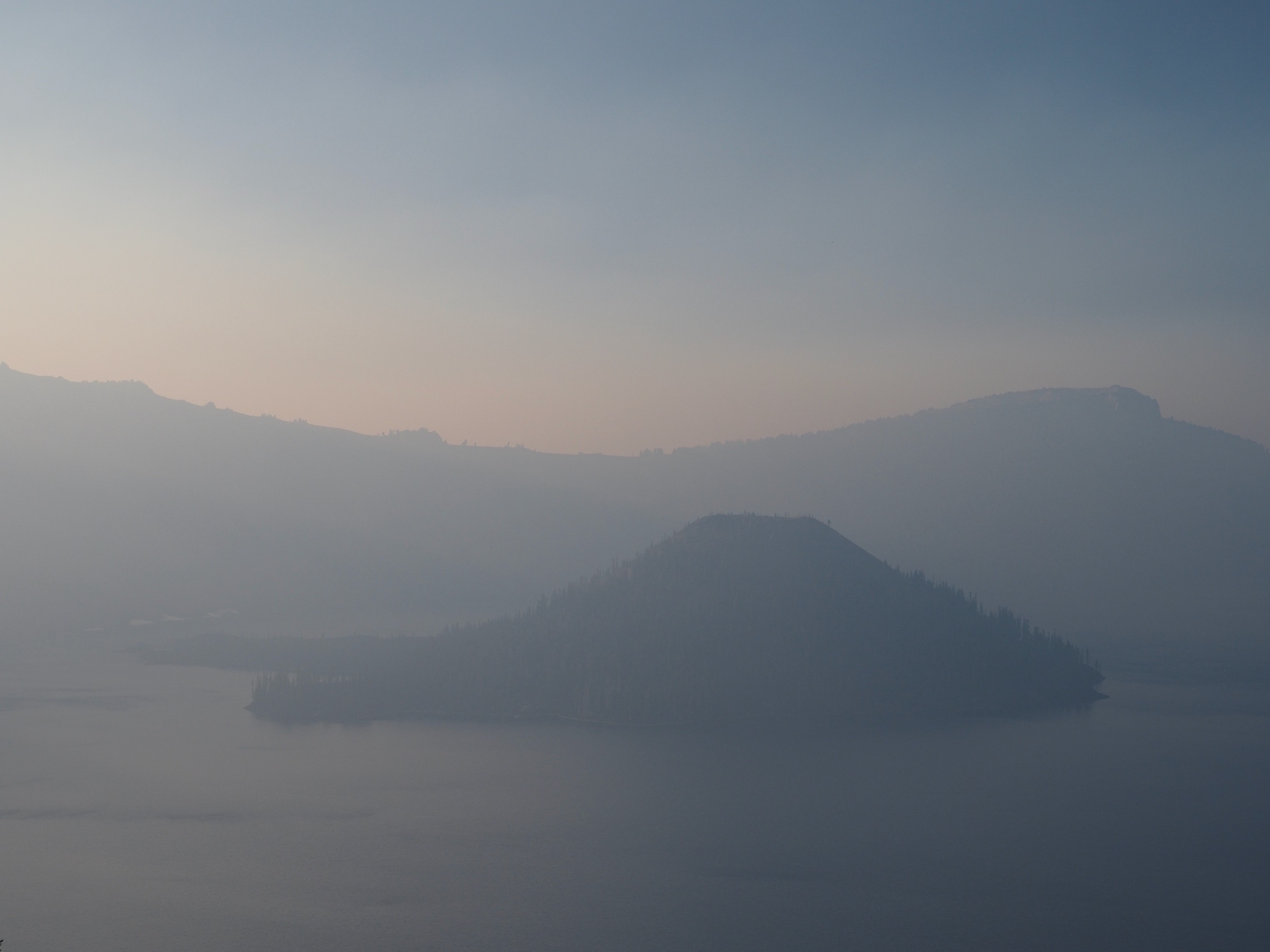 In the morning, we woke up in time to get to sunrise on the crater rim. We drove up to the Watchman Peak trailhead. There, we were happy to see that the air had cleared. Sunrise and the morning light over the lake and Wizard Island were beautiful.