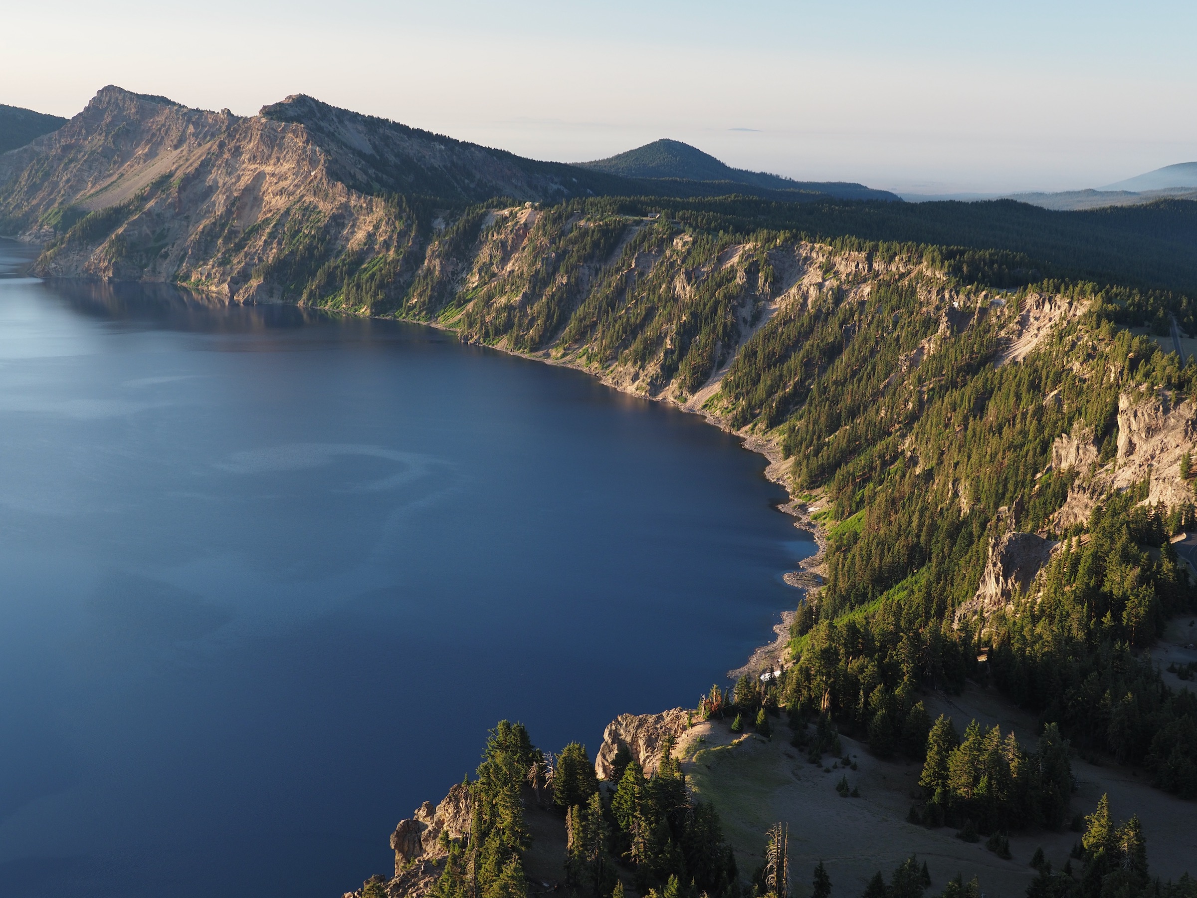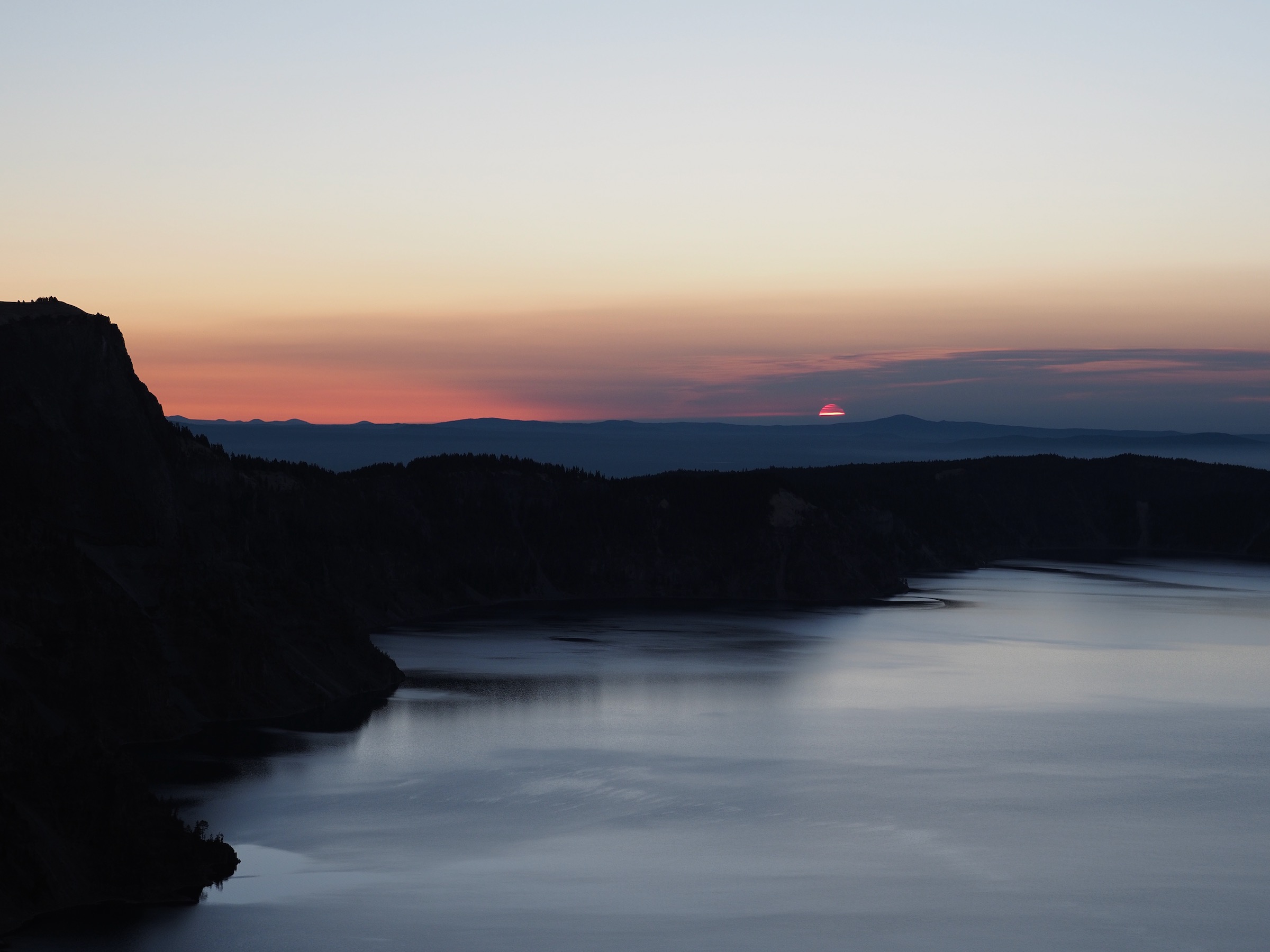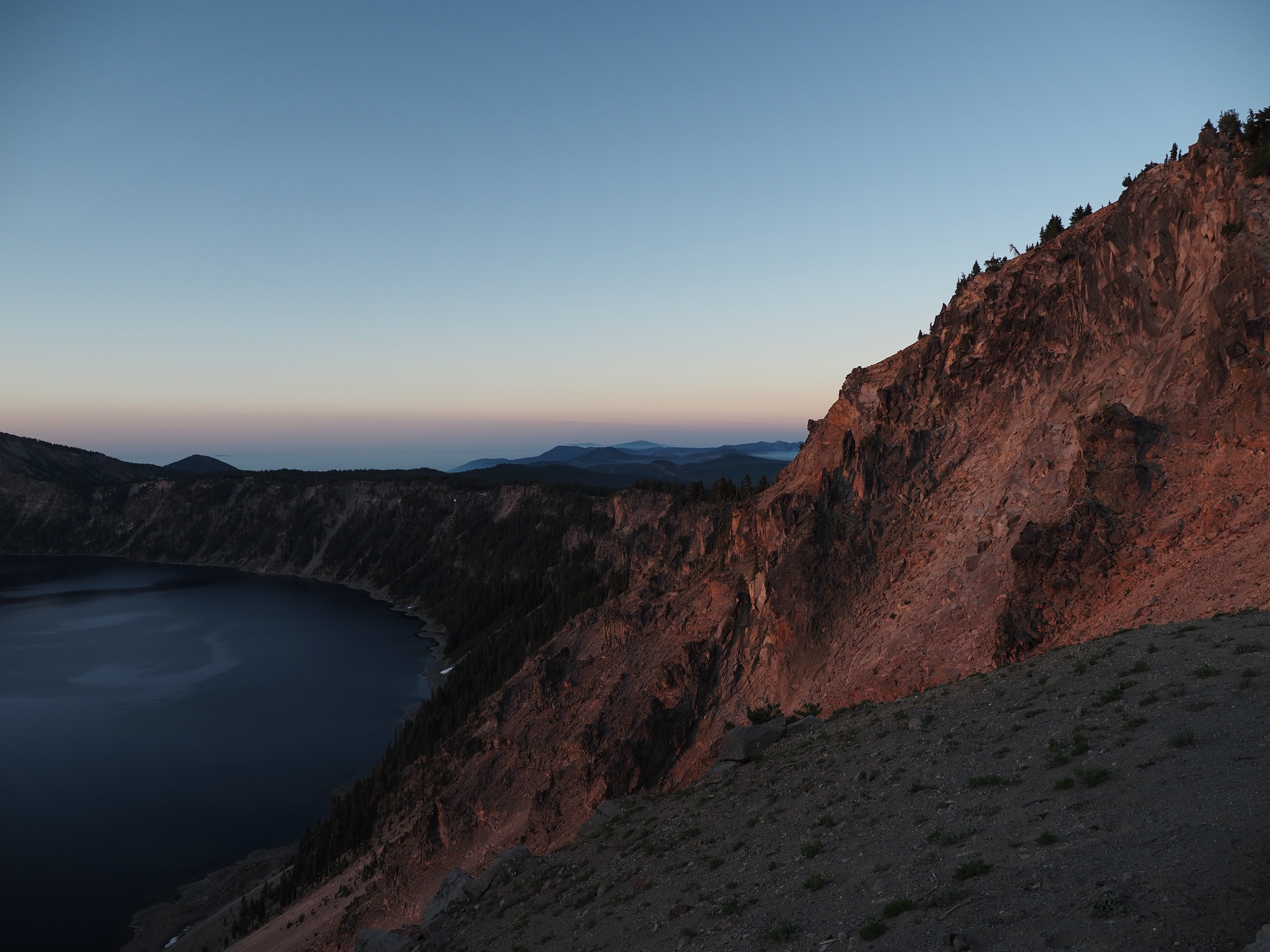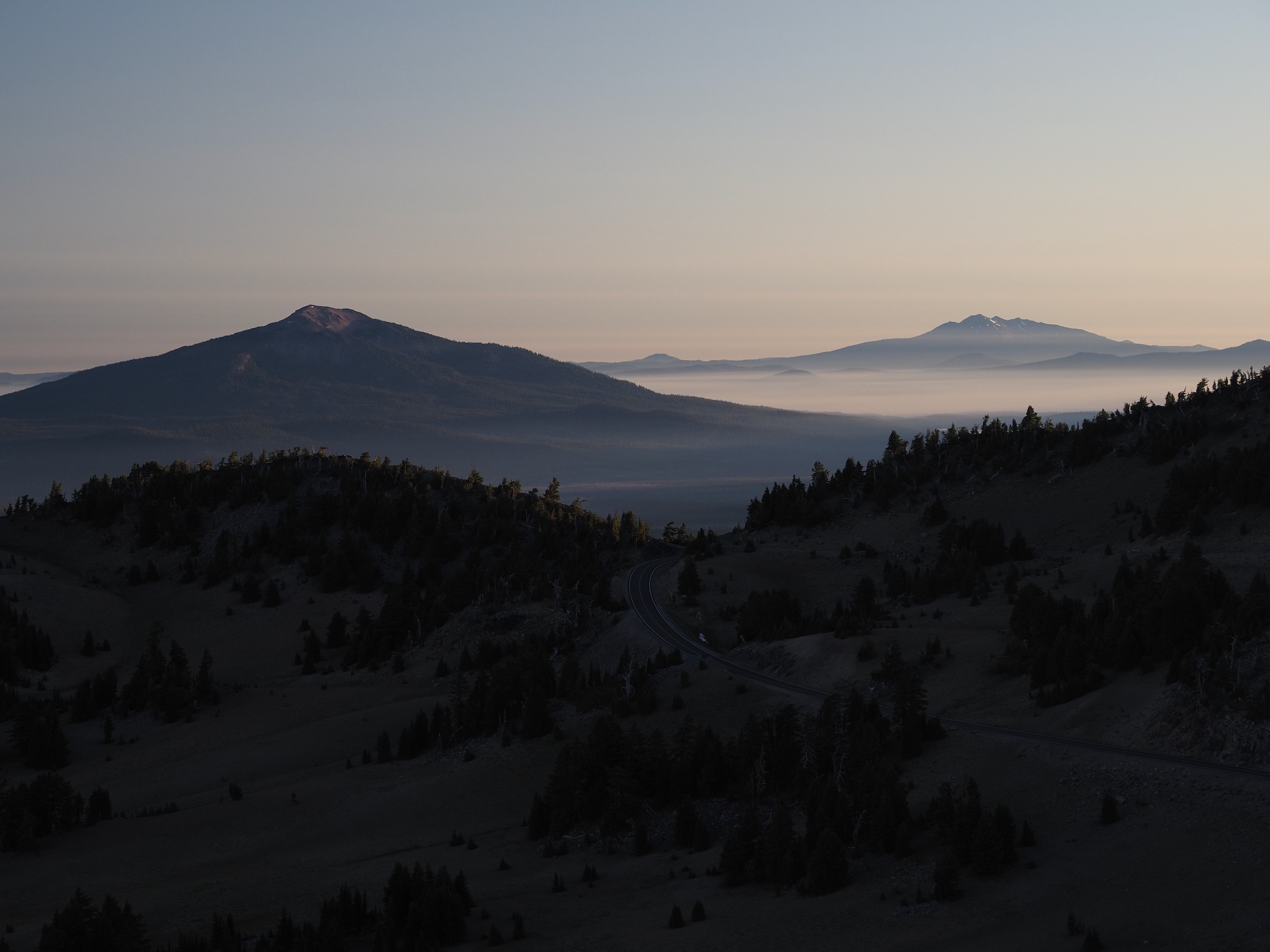 In the morning, we woke up in time to get to sunrise on the crater rim. We drove up to the Watchman Peak trailhead. There, we were happy to see that the air had cleared. Sunrise and the morning light over the lake and Wizard Island were beautiful.