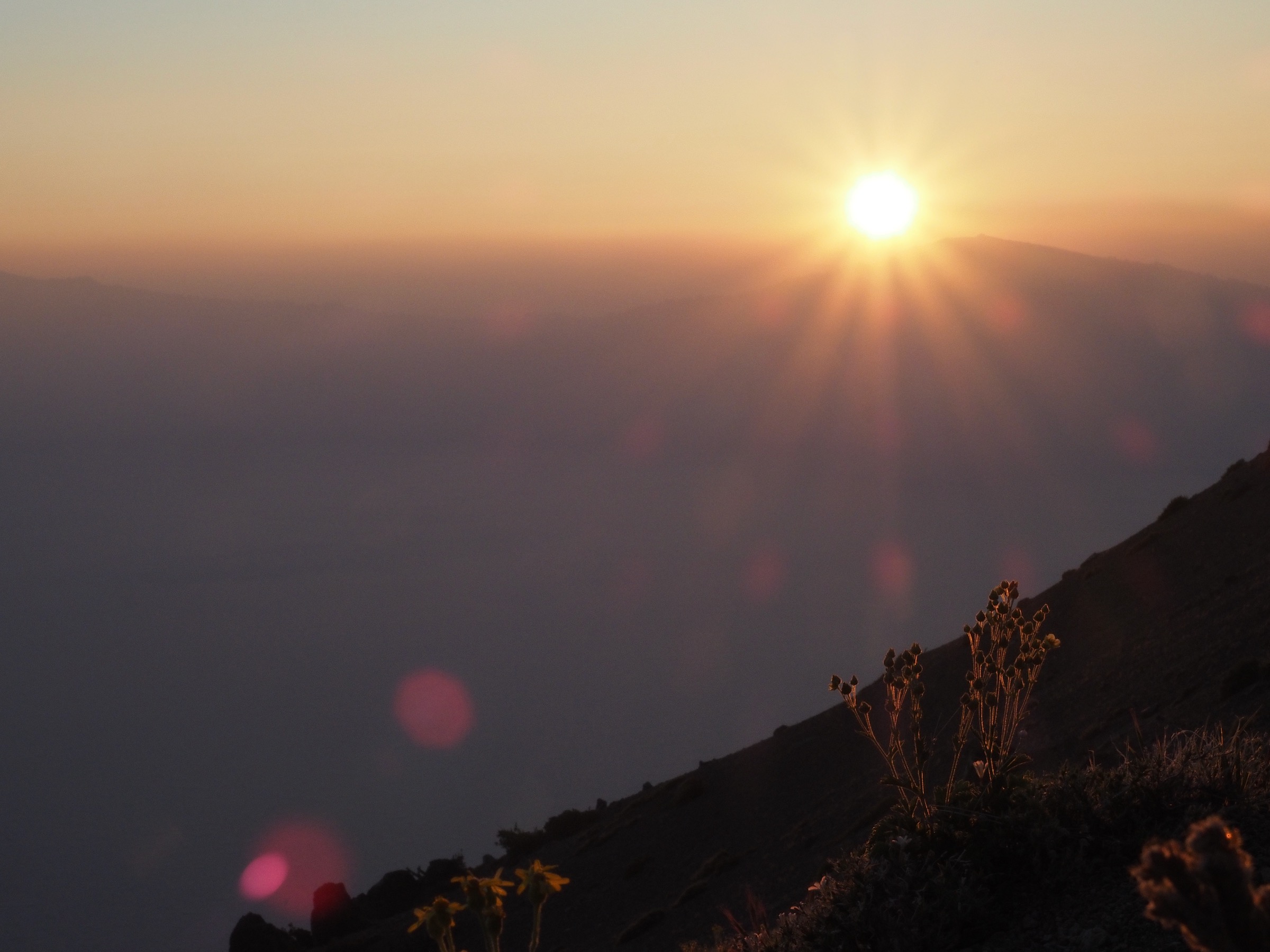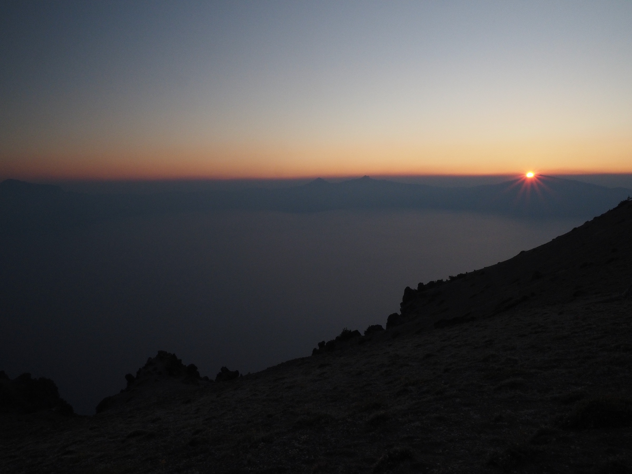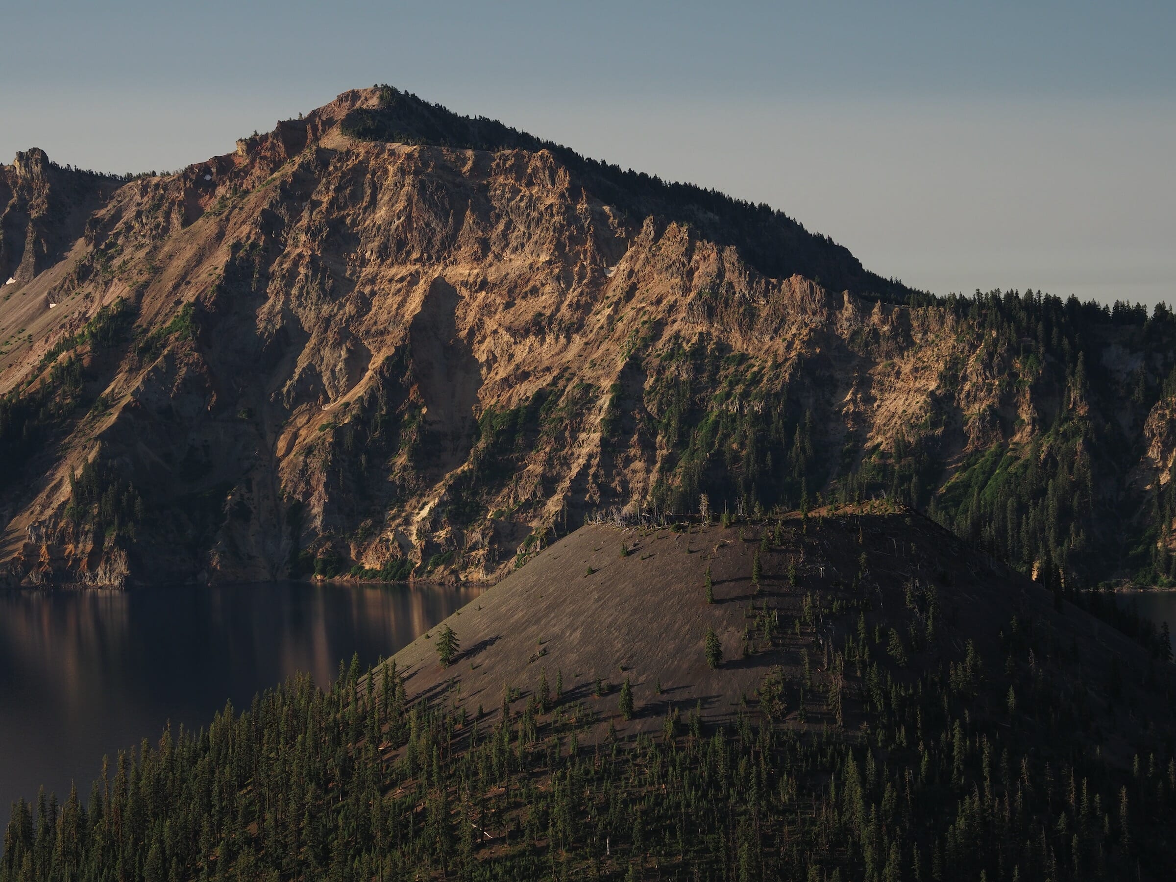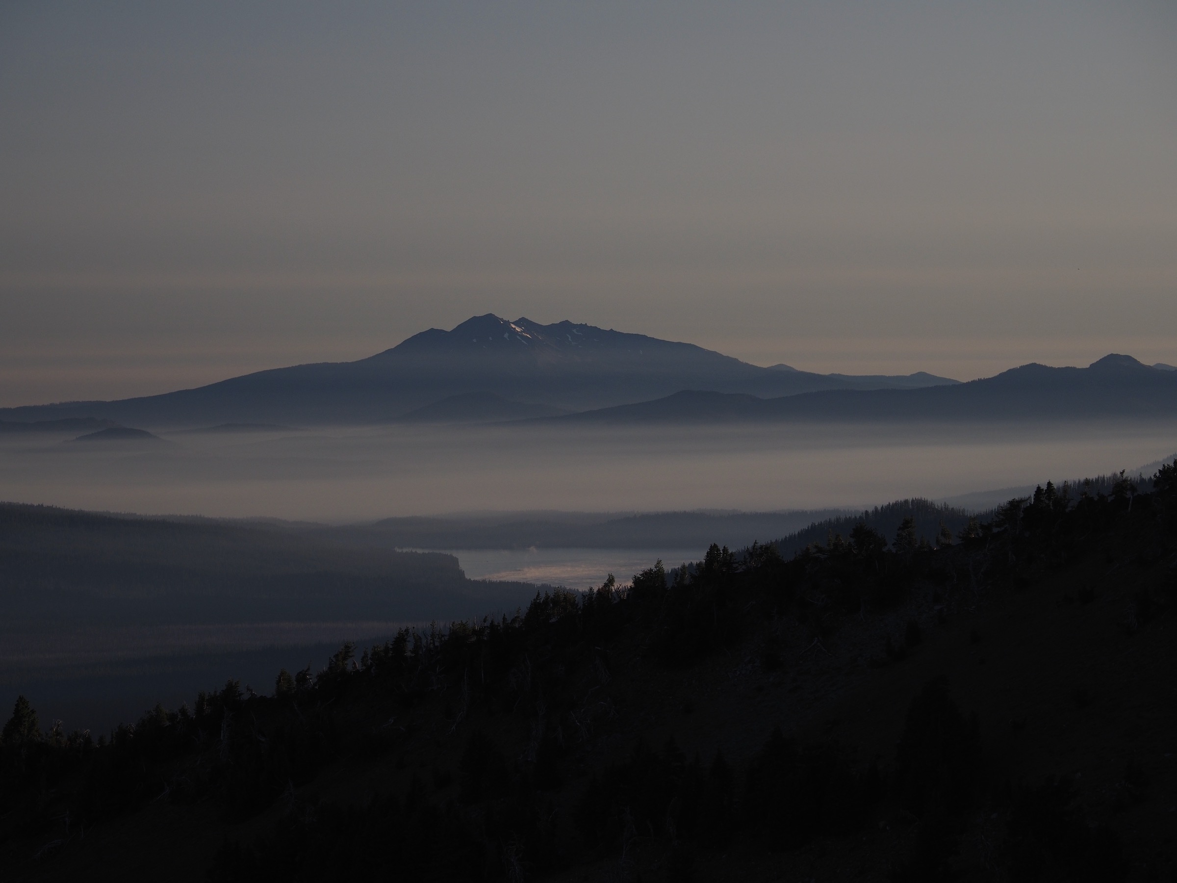 In the morning, we woke up in time to get to sunrise on the crater rim. We drove up to the Watchman Peak trailhead. There, we were happy to see that the air had cleared. Sunrise and the morning light over the lake and Wizard Island were beautiful.