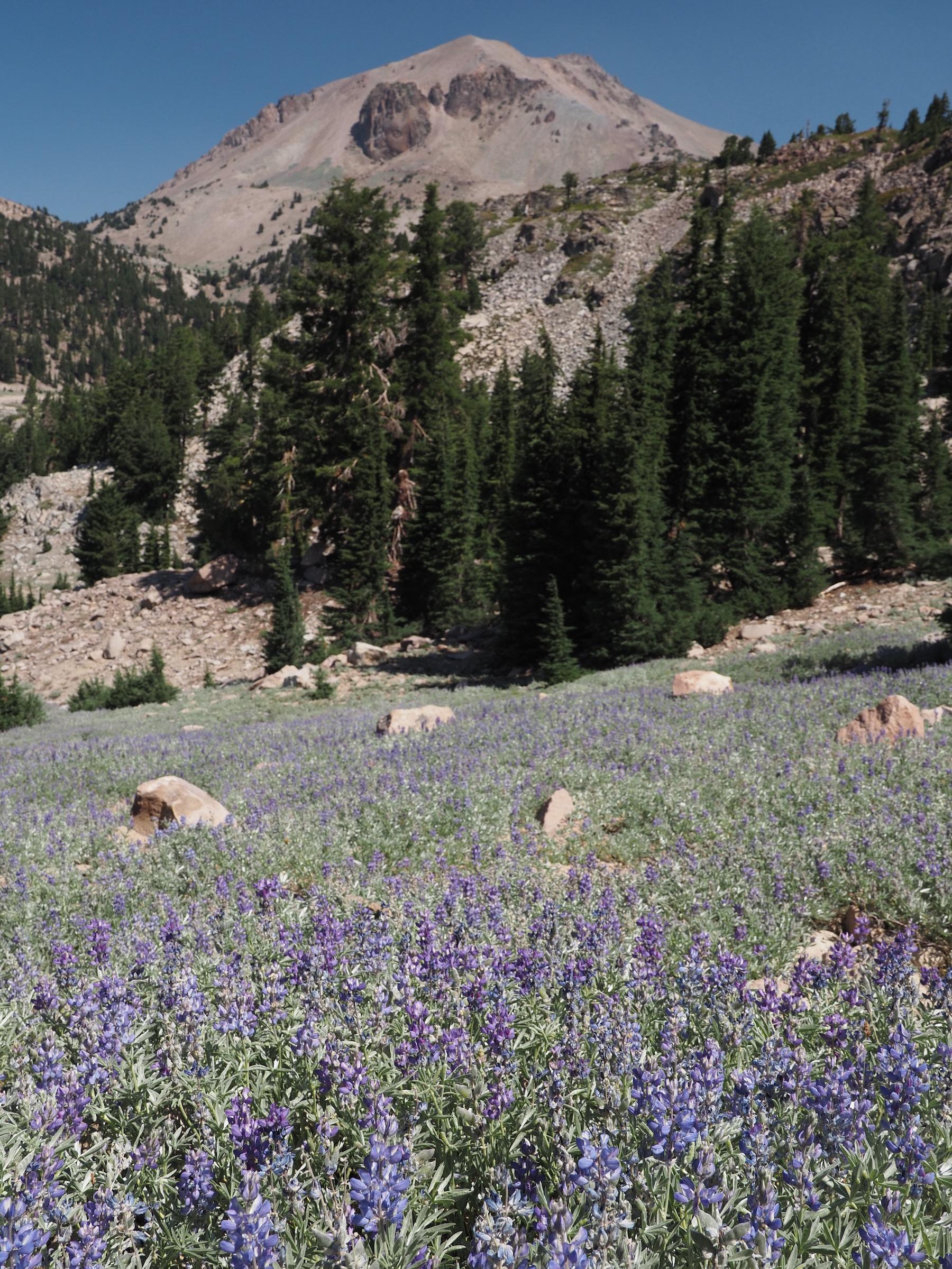 From there, we continued to the Bumpass Hell trail. This 3-mile loop leads to a 16-acre active hydrothermal area, the largest in the park. Along the trail, carpets of purple lupine covered the hillsides. In the hydrothermal area, boardwalks lead past mudpots, noisy steam vents, and bubbling pools.