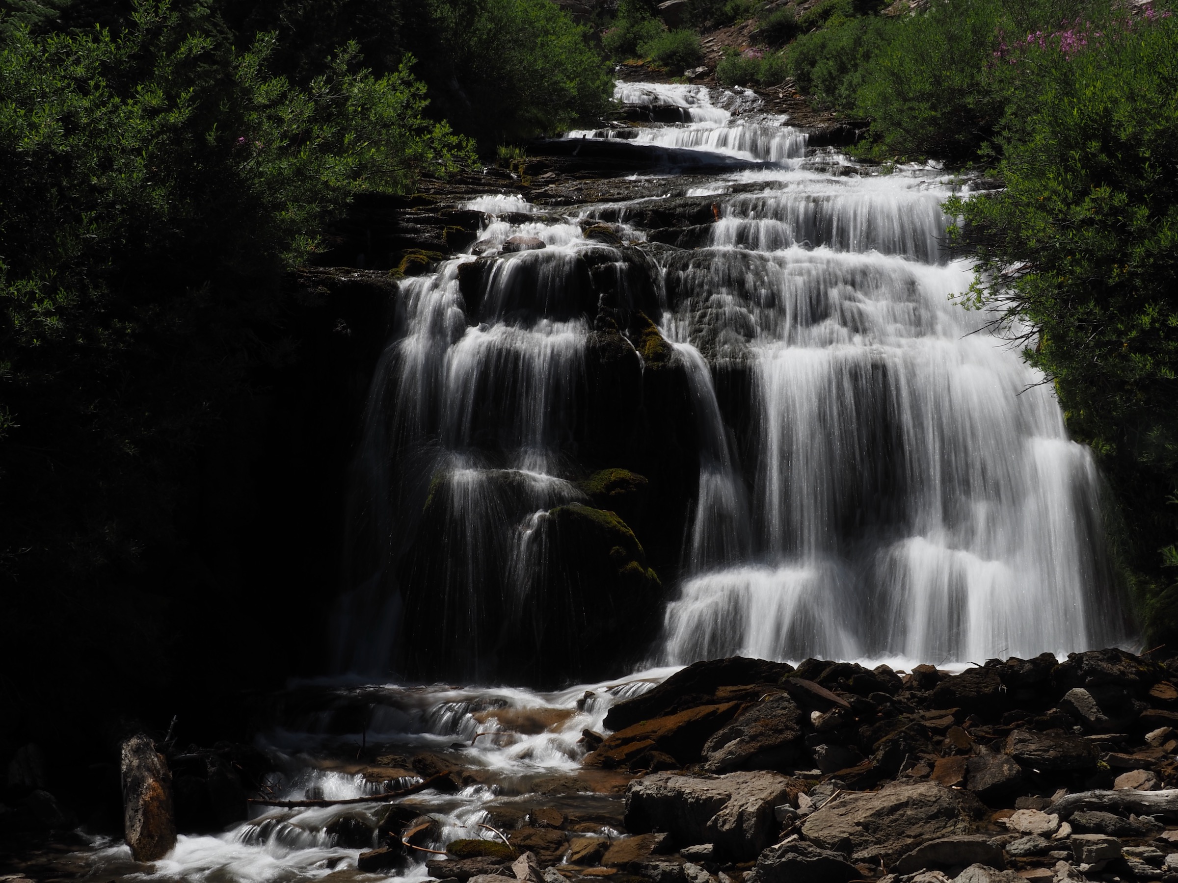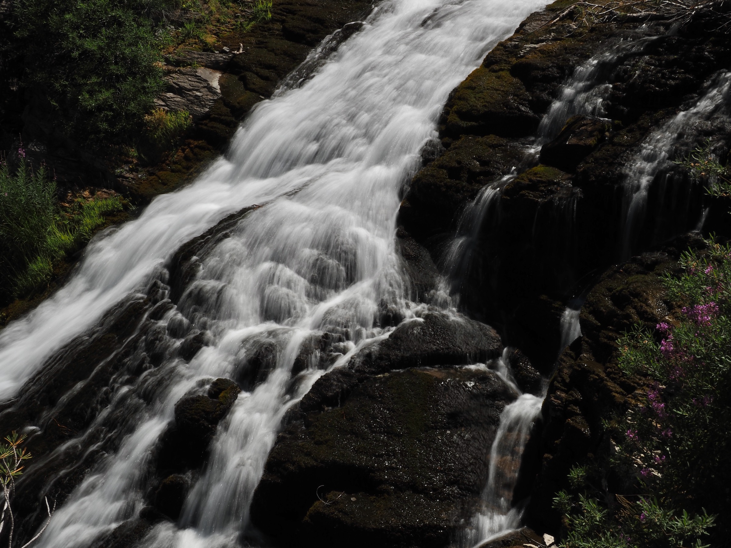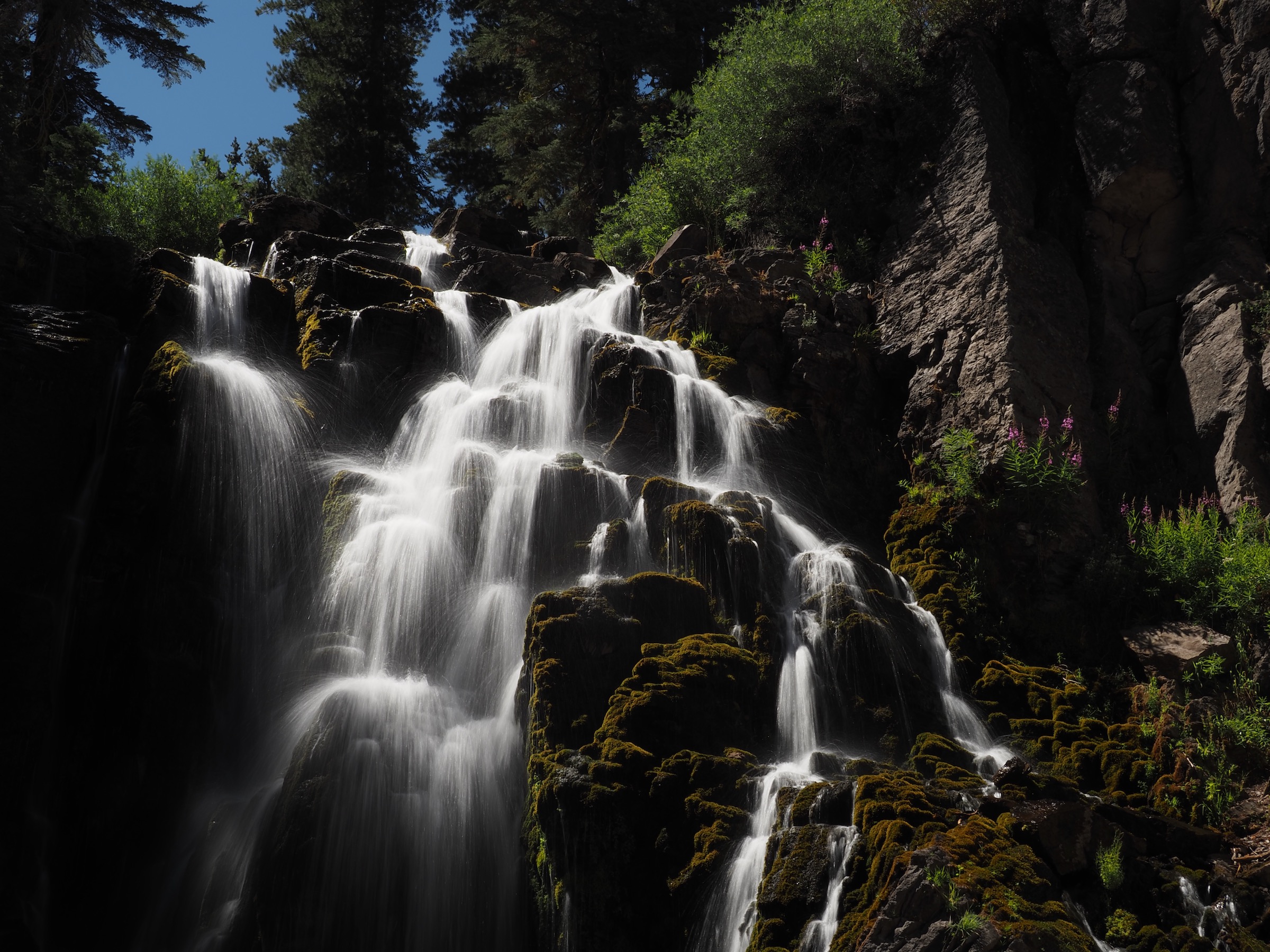 For our next walk, we selected King’s Creek Falls, where a 2.3 mile loop leads to a 30′ waterfall. There are fenced overlooks and a use path down to the base of the falls. Along the way, we had views to the ominous smoke plume generated by the Dixie Fire, miles distant. Later that summer, the Dixie Fire would burn through parts of the park. The falls were pretty, and we enjoyed the cascades along the one-way stretch back up from the falls.