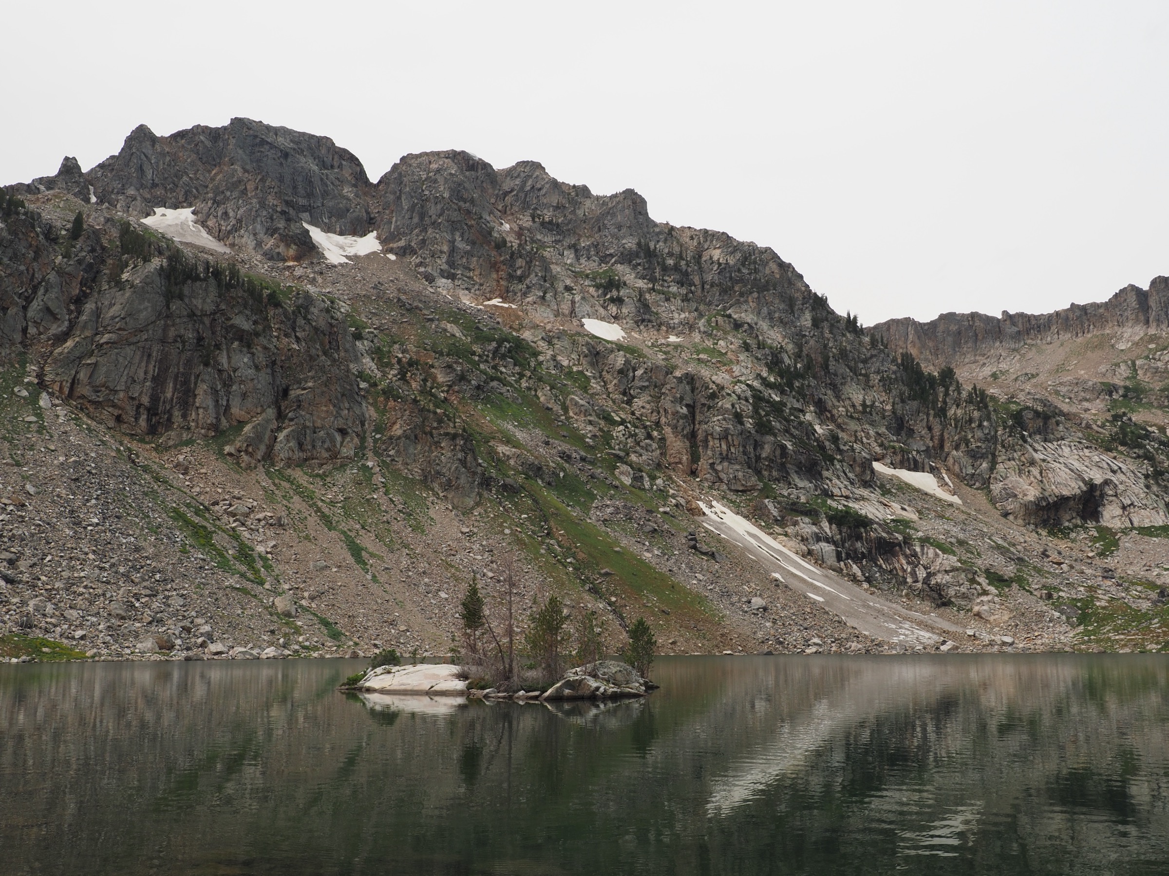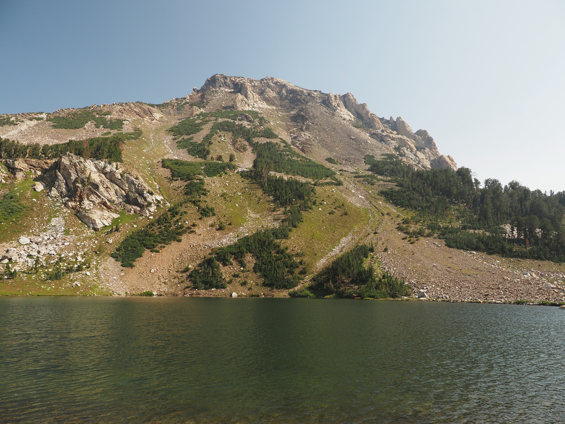 By the time we reached Lake Solitude (9,035′), the sky was still grey but showed some signs of clearing. This made us optimistic for the rest of the day, and we lingered some in hopes of further clearing.