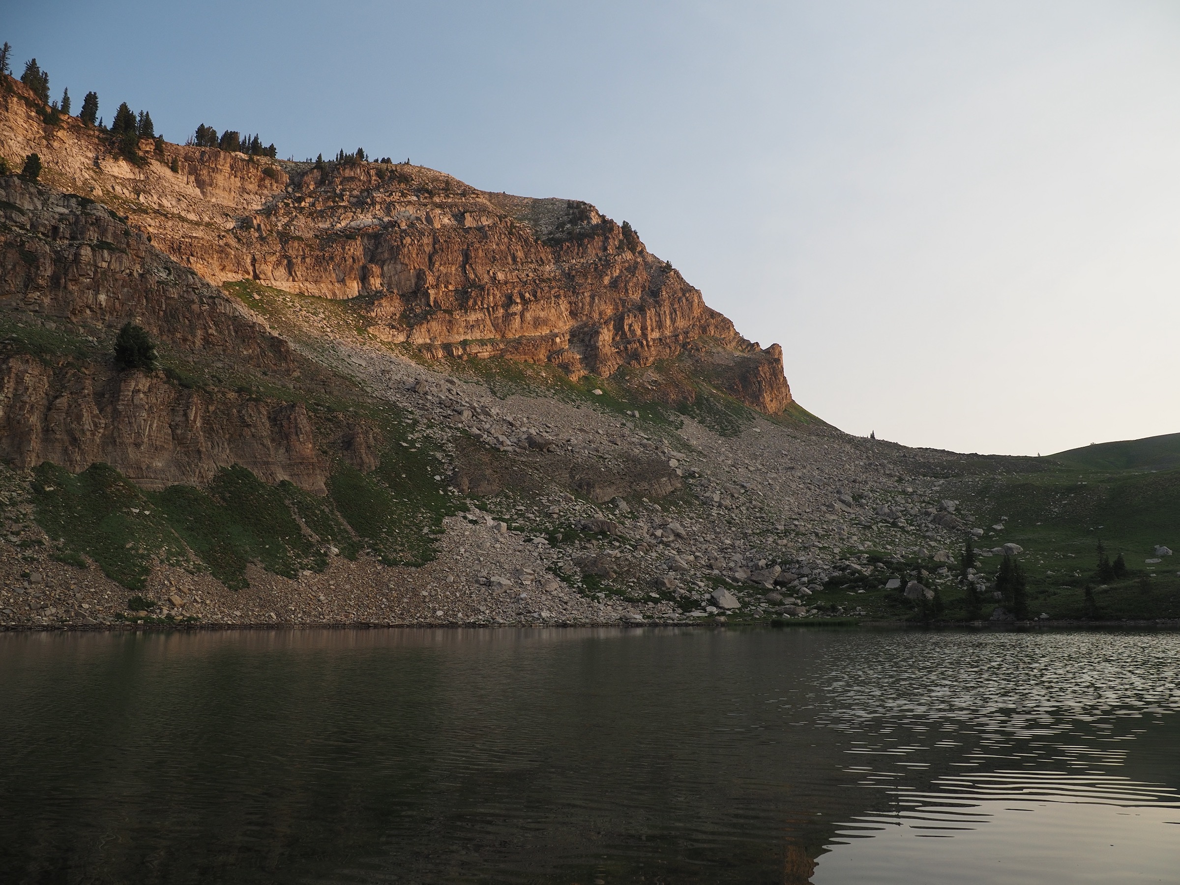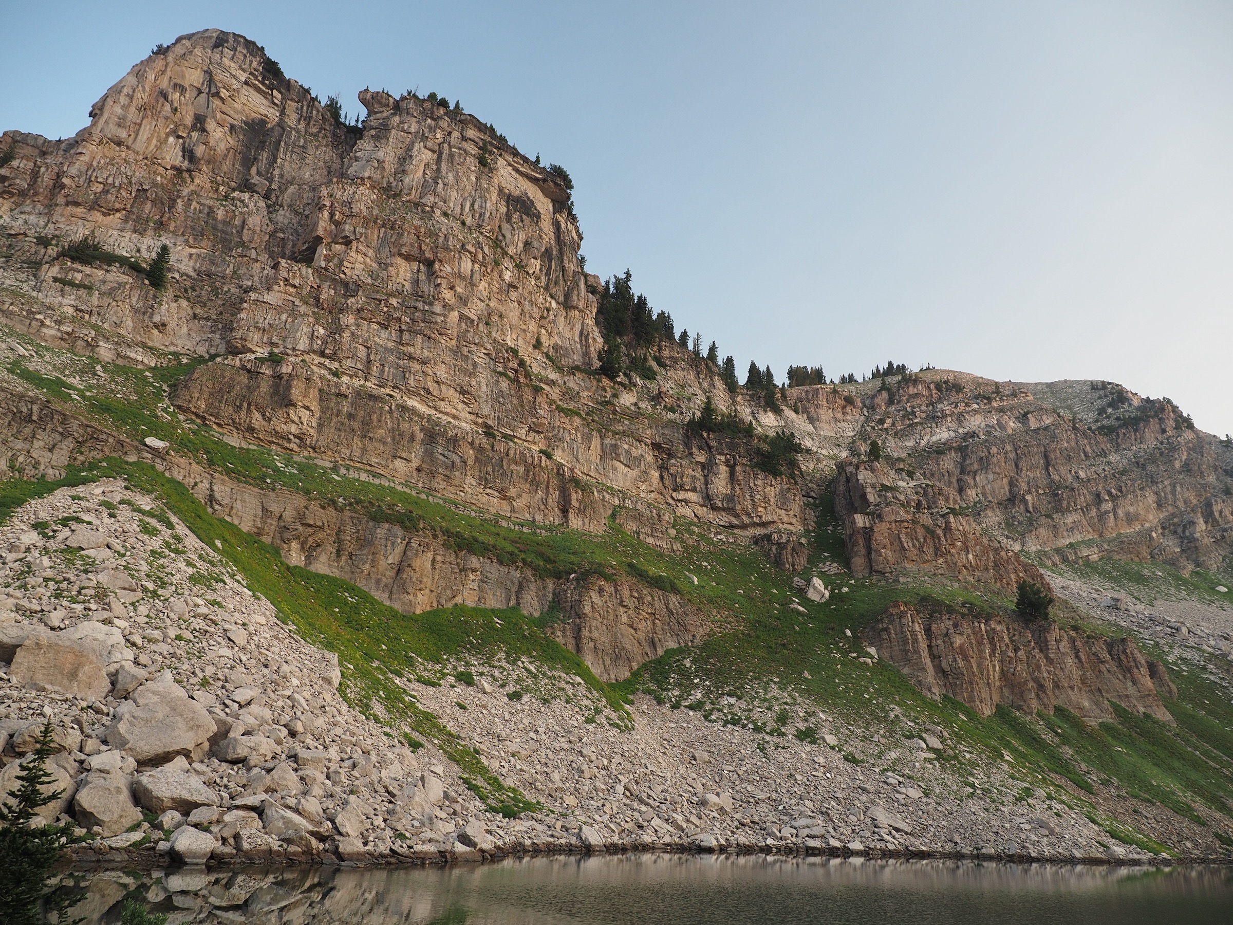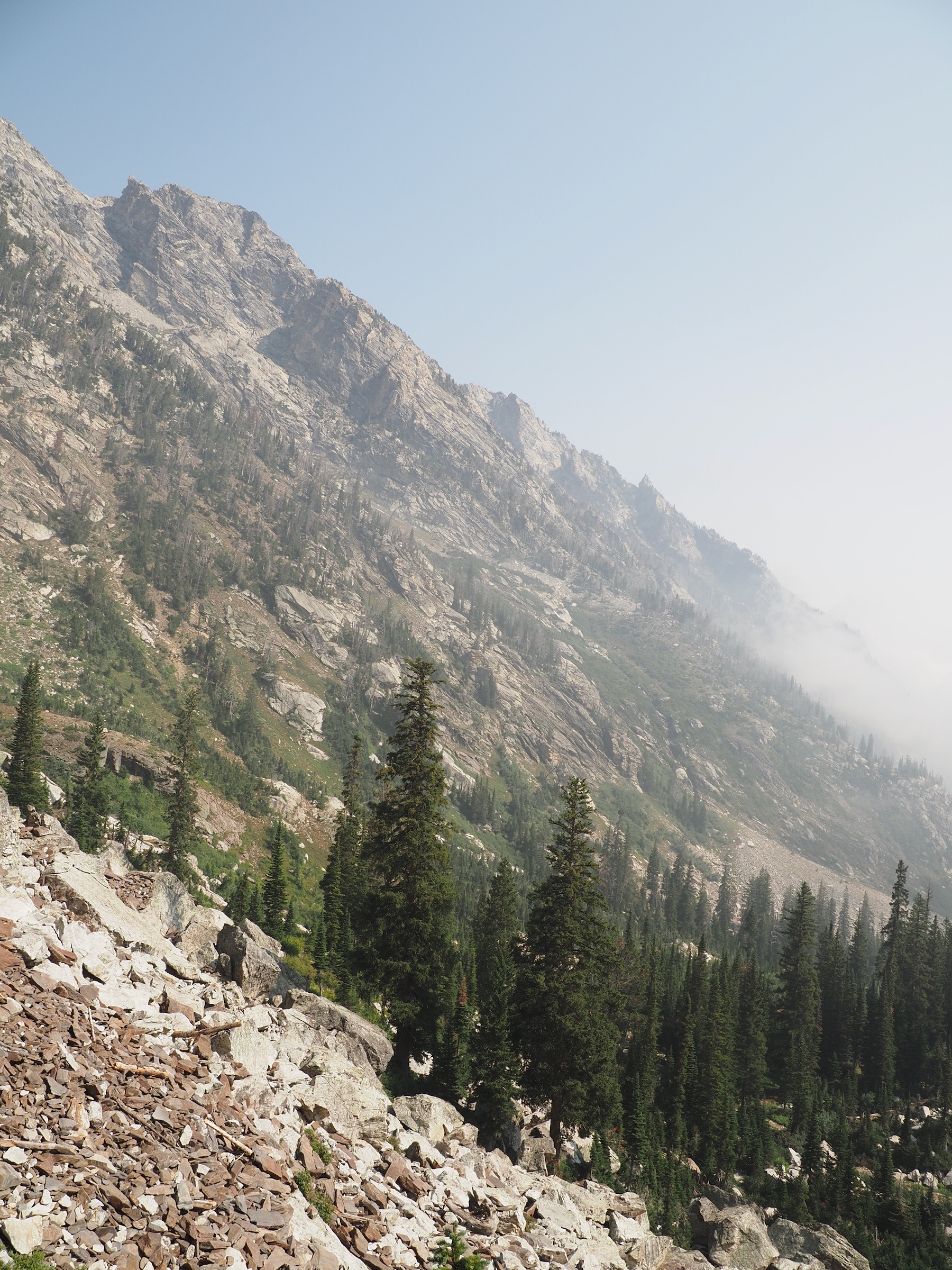 The morning was better. We awoke to smoky but otherwise clear skies and could enjoy views at Holly Lake. I particularly enjoyed seeing jagged bands of rock in the walls of Paintbrush Canyon.