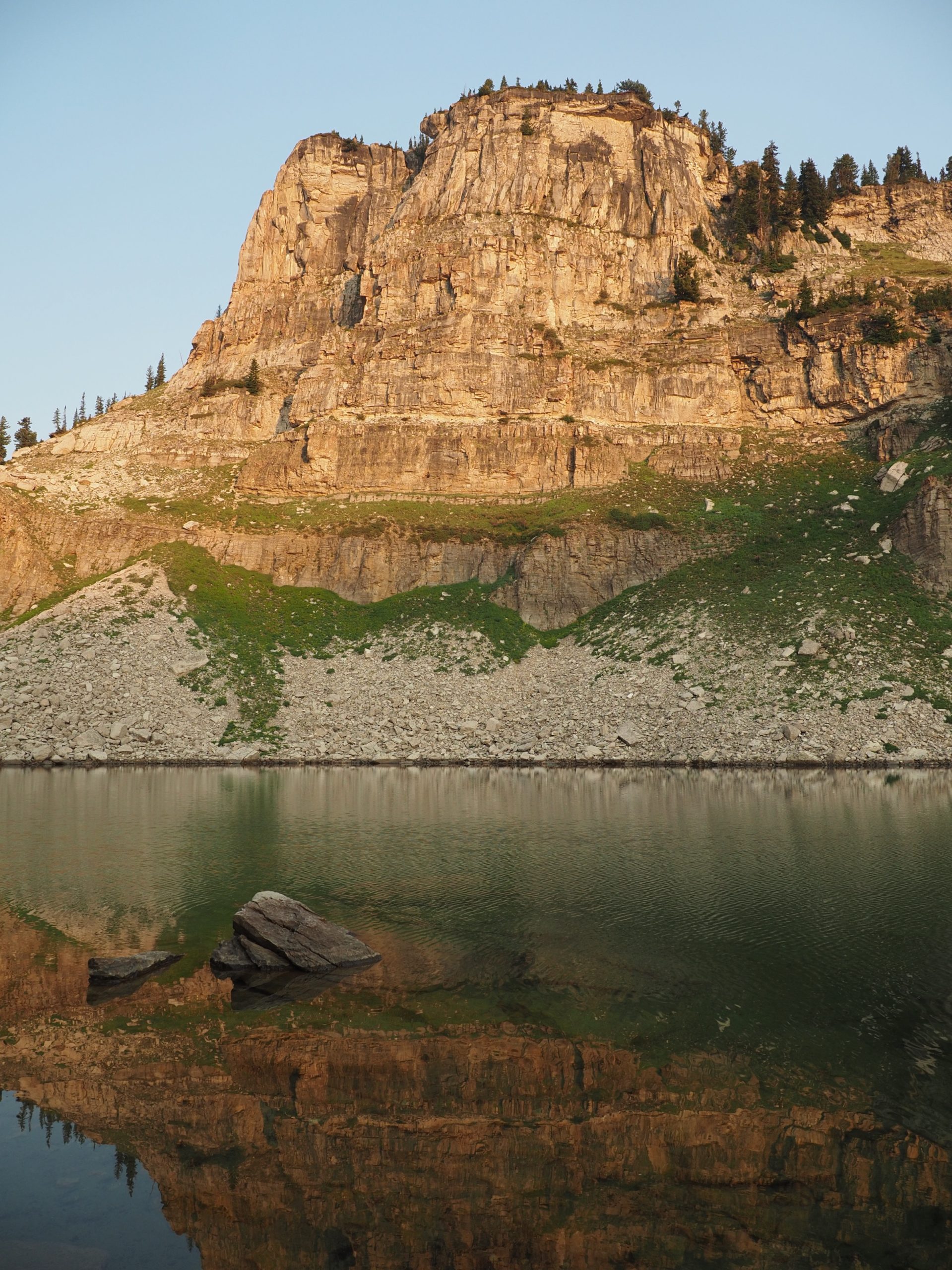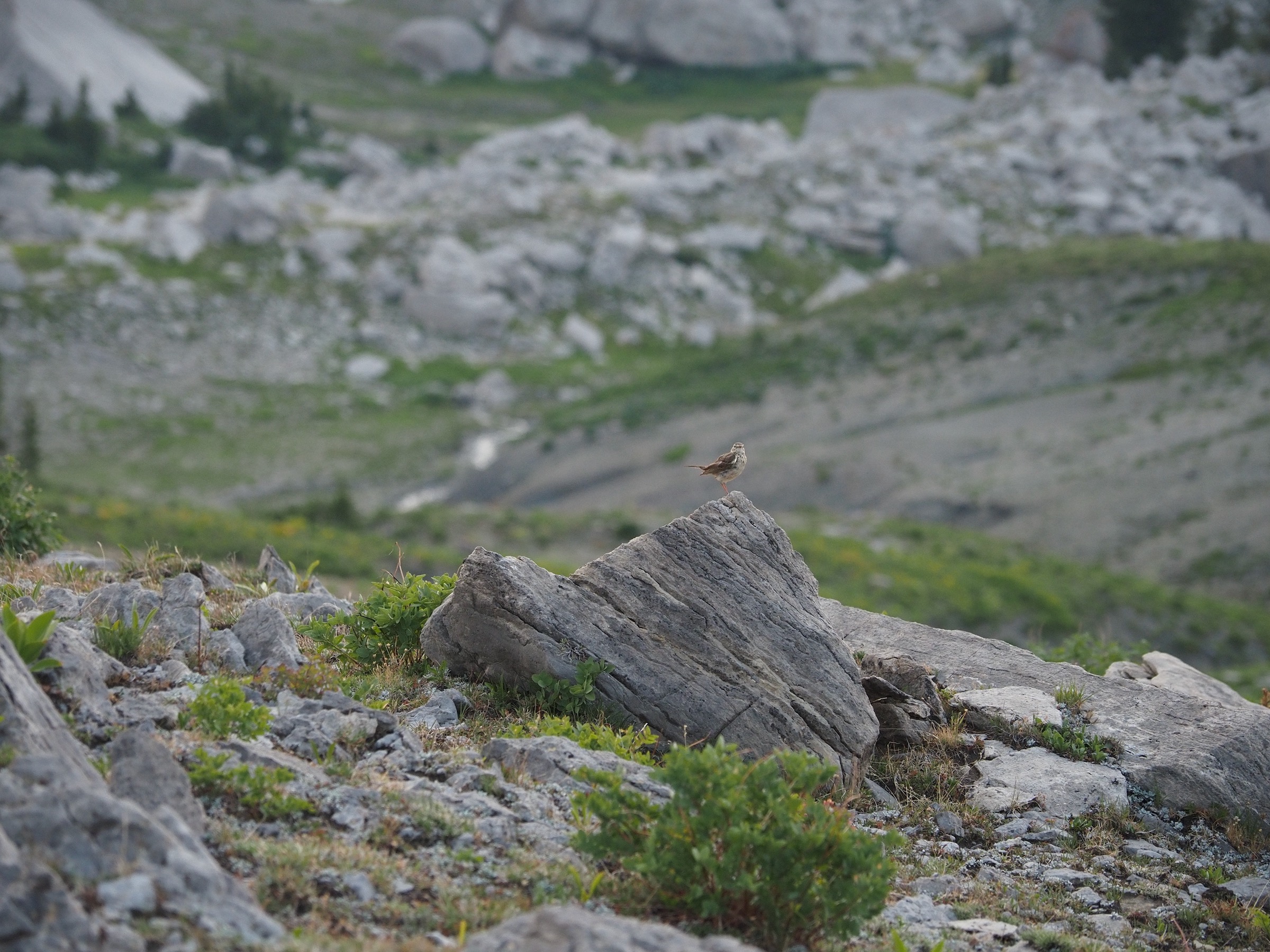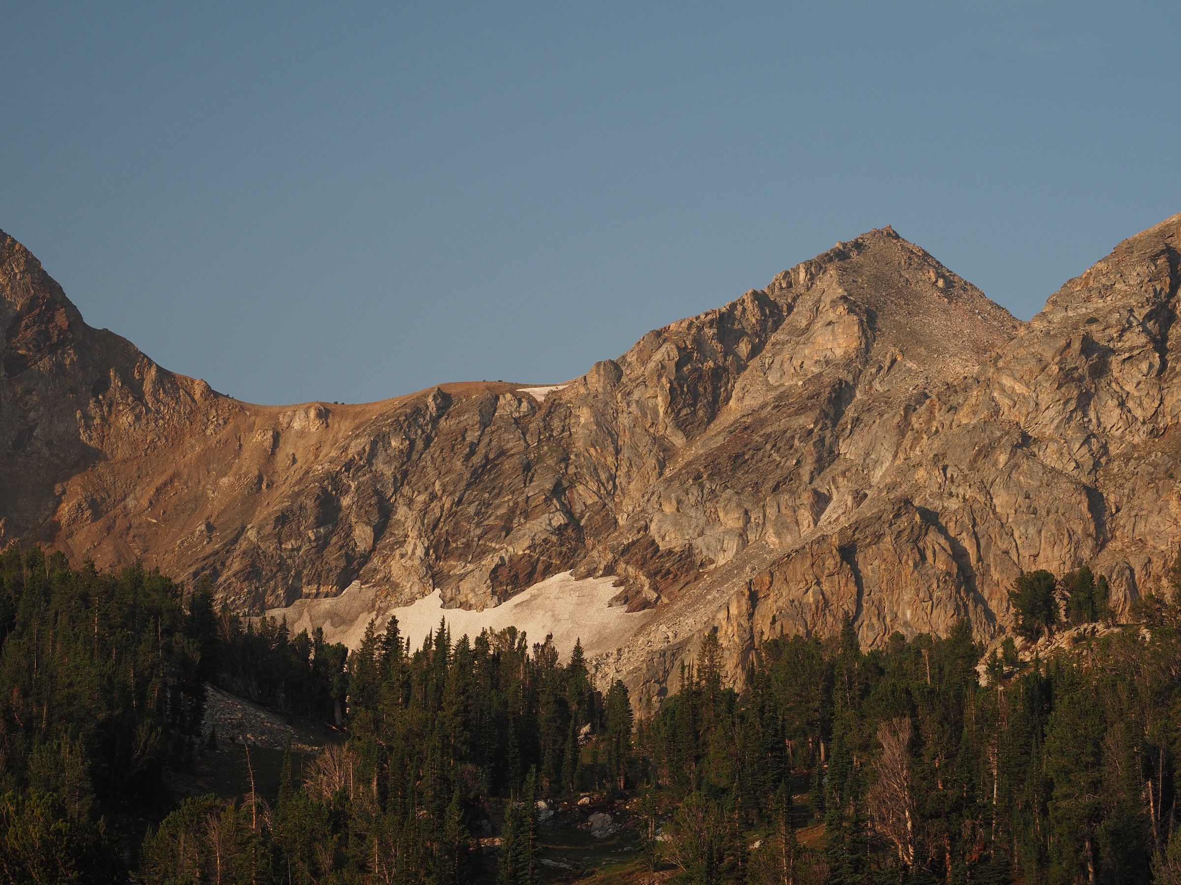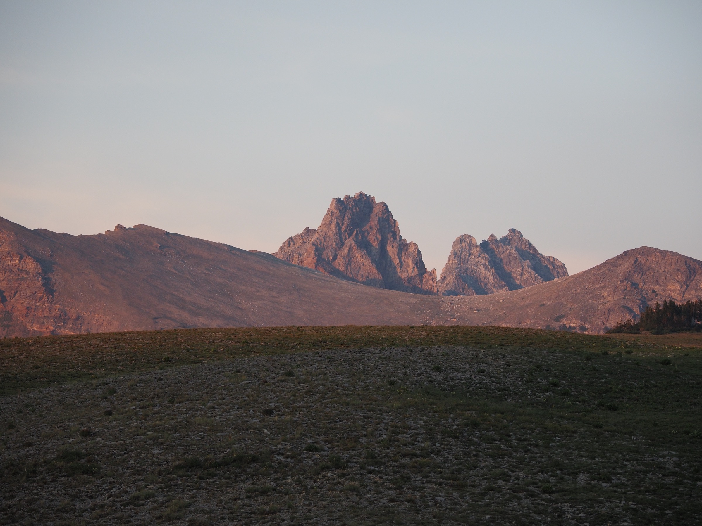 As the canyon fell further into shadow, we wrapped up dinner in time to take advantage of the ranger’s other suggestion: Mount Meek Pass at sunset. This turned out to be a great suggestion. The short walk up to the pass brought us back up until Golden Hour, and the beautifully lit peaks of the Tetons. Mirroring our morning, the landscape glowed a golden red. Marmots did marmot things, and an American Pipit kept us company with its recurrent call. This was a great way to end a stunning day. Our total explorations from camp were about 2.2mi and 1400′.