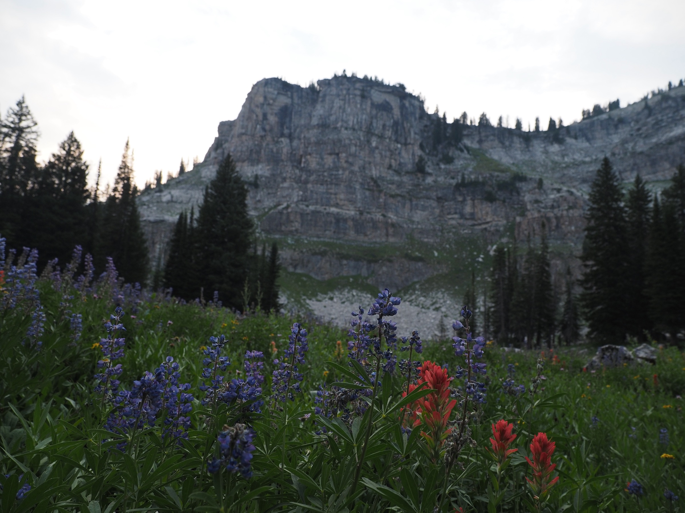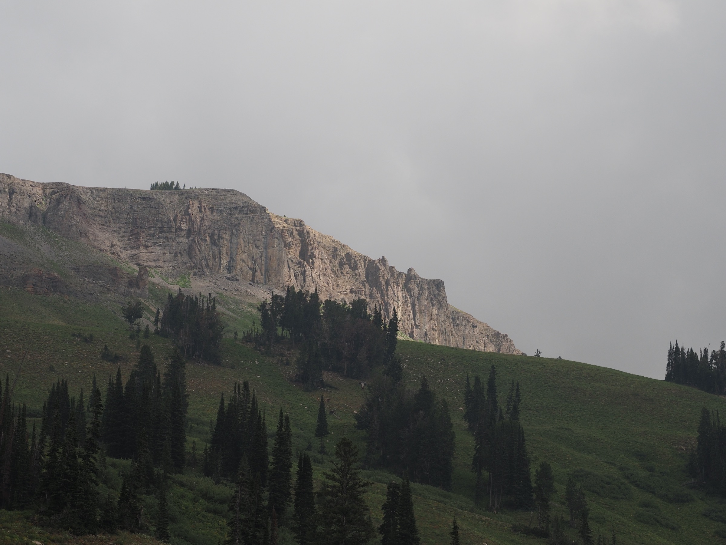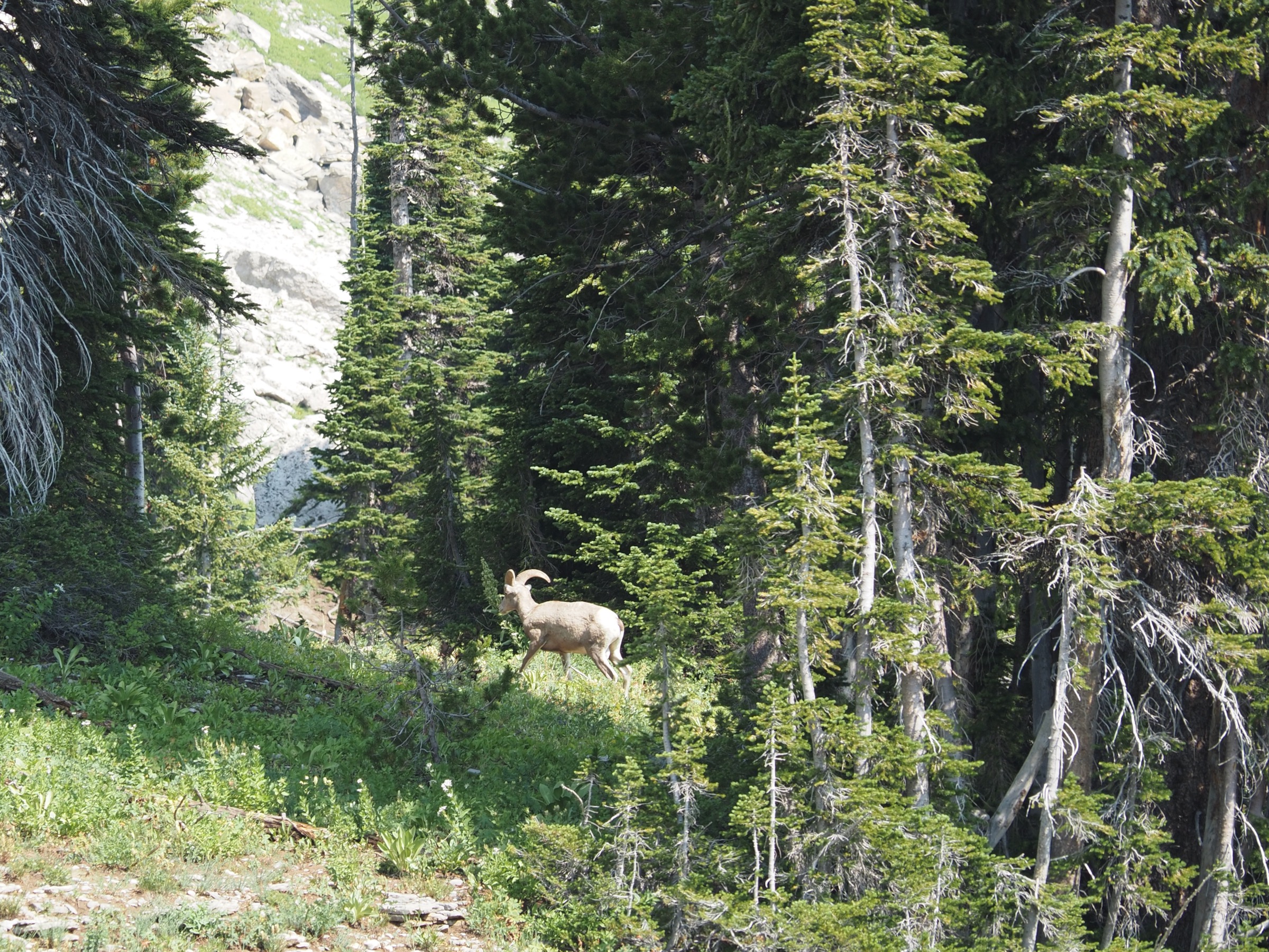 Past the junction between the North and South Forks, the sky started to bright a little and the clouds lifted somewhat. As we continued up the North Fork of Cascade Canyon, we kept thinking “this looks like great wildlife territory.” We slowed to look for moose in particular. Instead of moose, we saw several marmots and a deer. While paused to snack, another pair of backpackers came along behind us. They asked “Did you see that giant bull moose bedded down next to the trail?” Alas, we had not, but, given the timing, we must have passed close by.