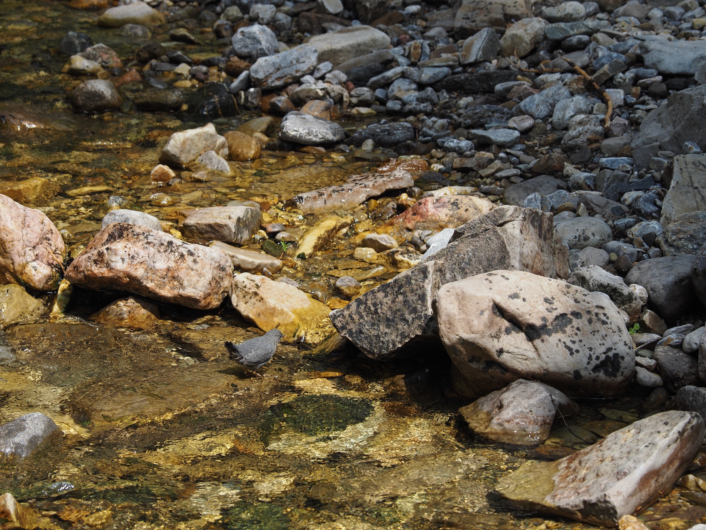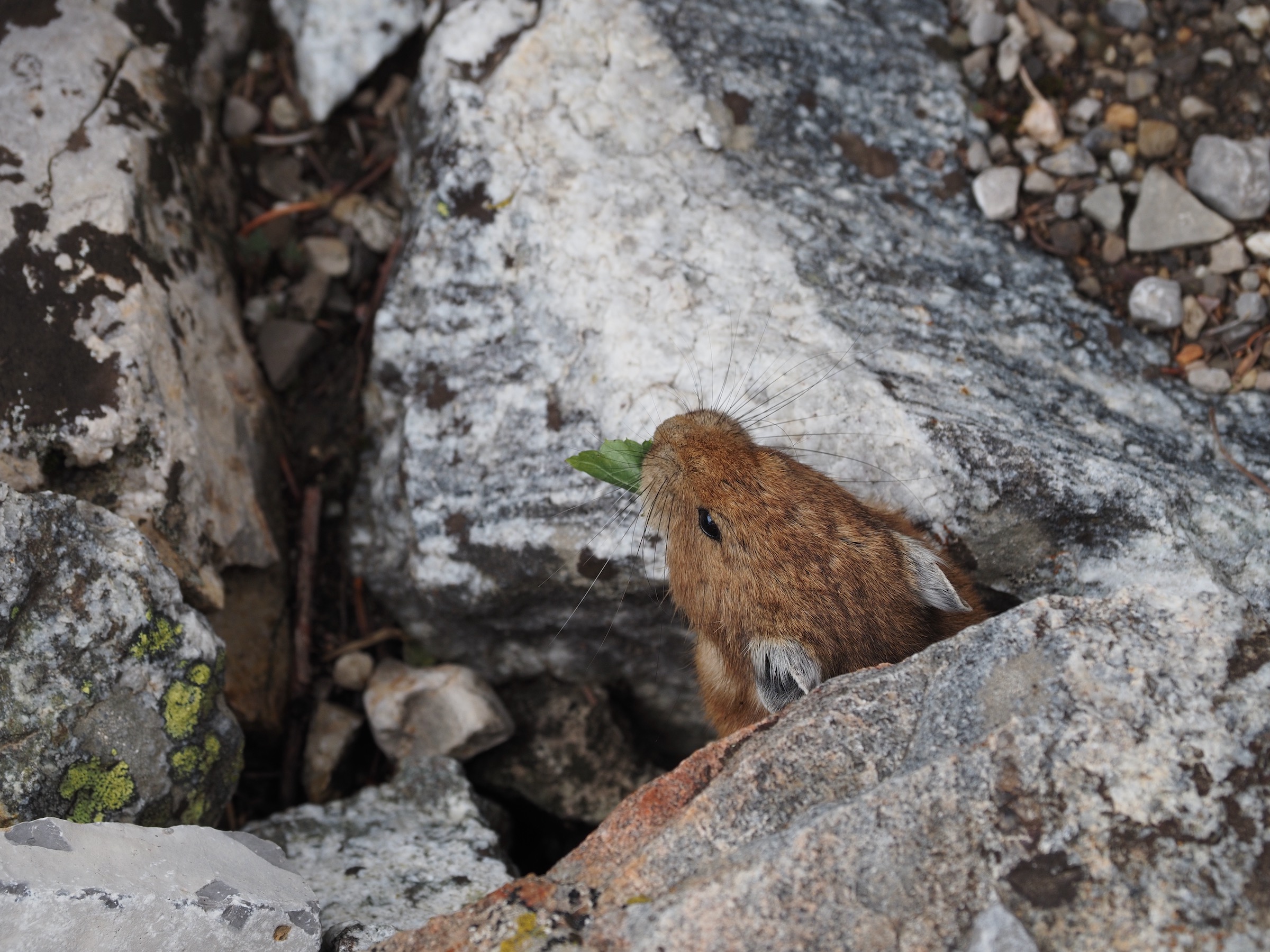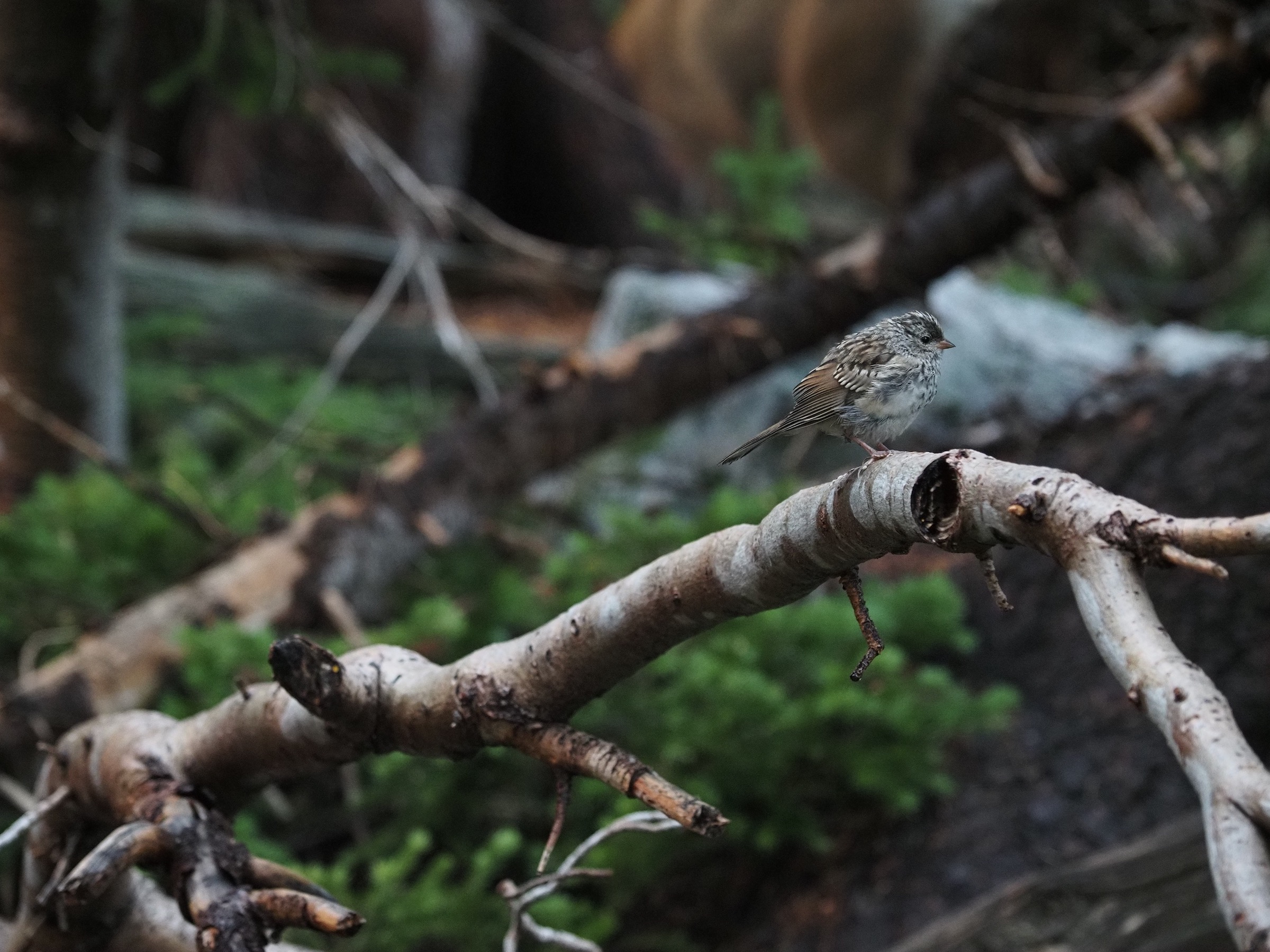 Past the junction between the North and South Forks, the sky started to bright a little and the clouds lifted somewhat. As we continued up the North Fork of Cascade Canyon, we kept thinking “this looks like great wildlife territory.” We slowed to look for moose in particular. Instead of moose, we saw several marmots and a deer. While paused to snack, another pair of backpackers came along behind us. They asked “Did you see that giant bull moose bedded down next to the trail?” Alas, we had not, but, given the timing, we must have passed close by.