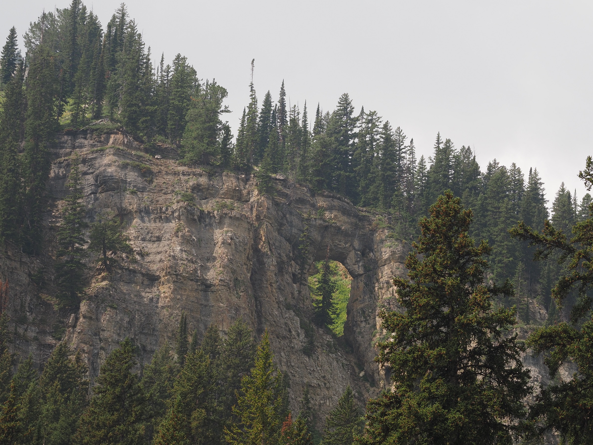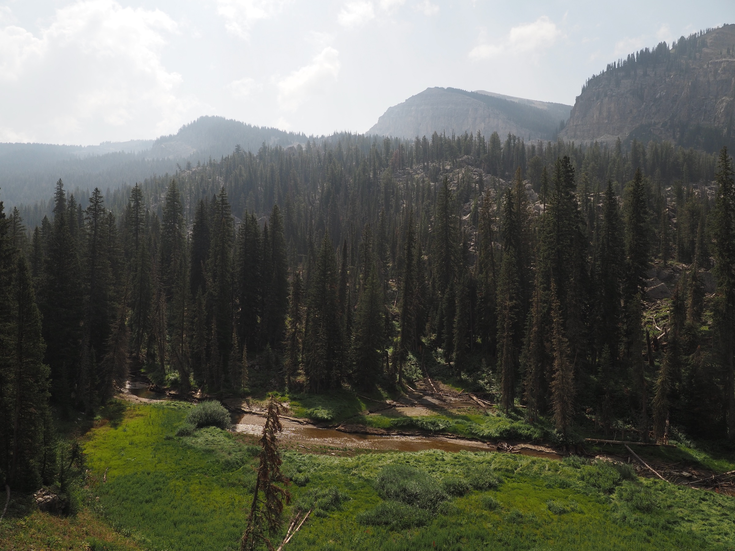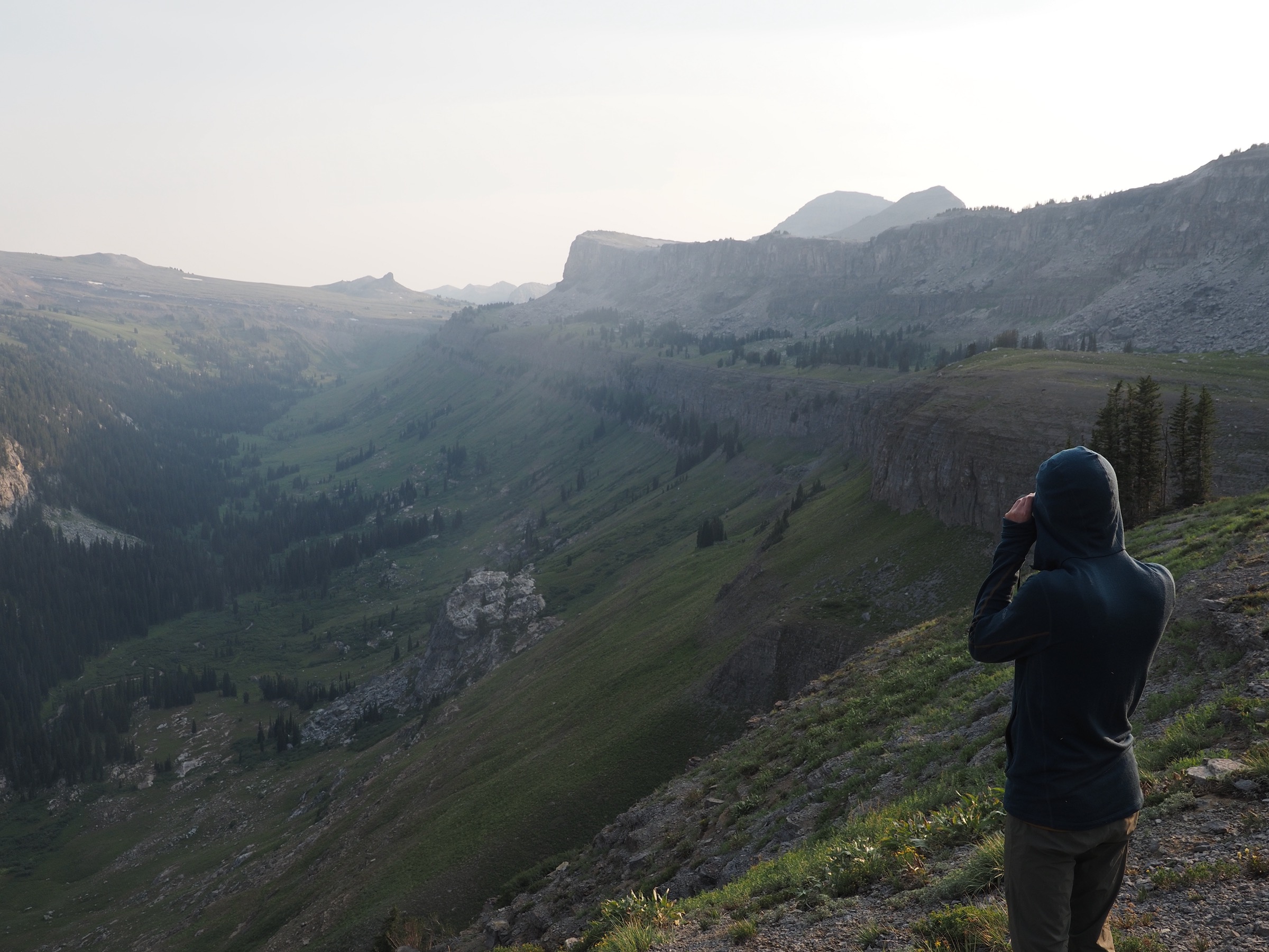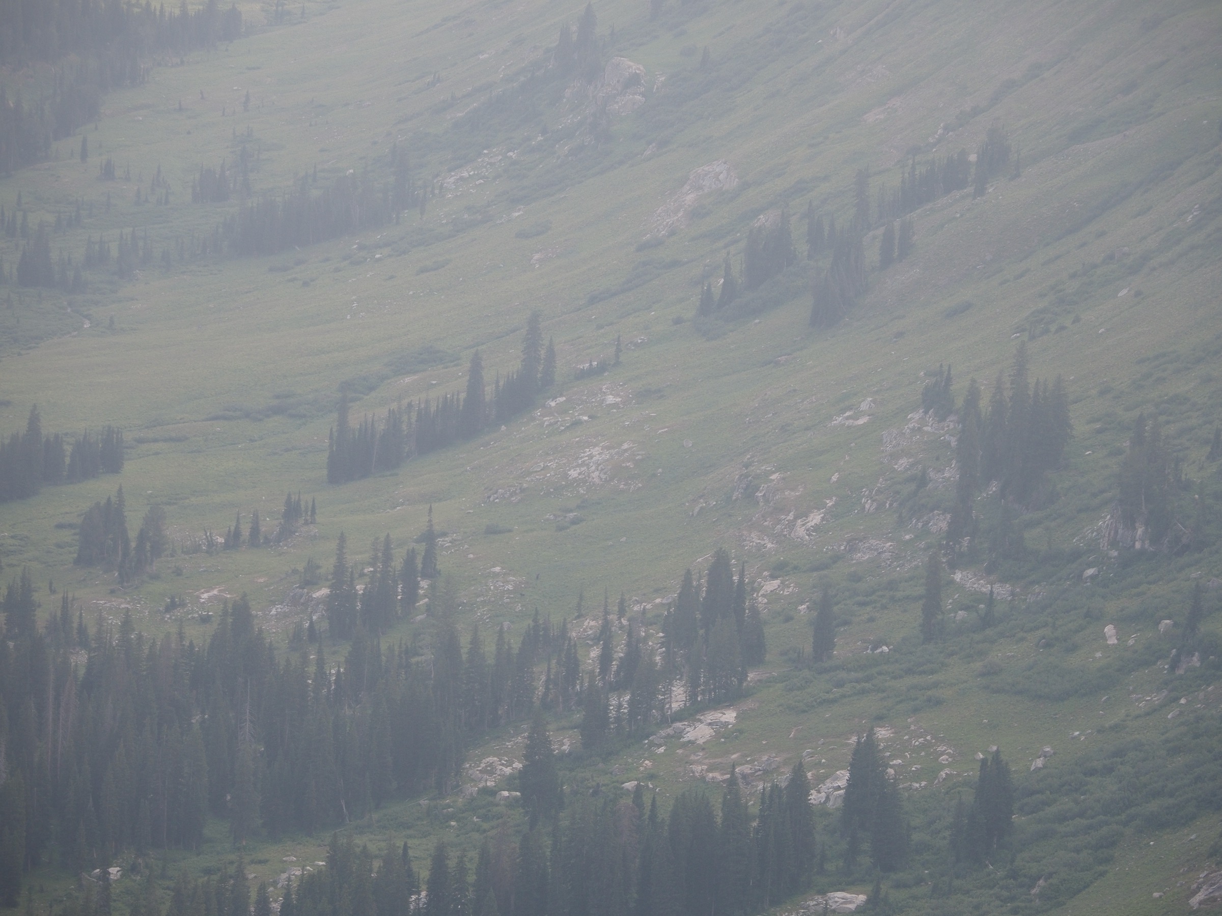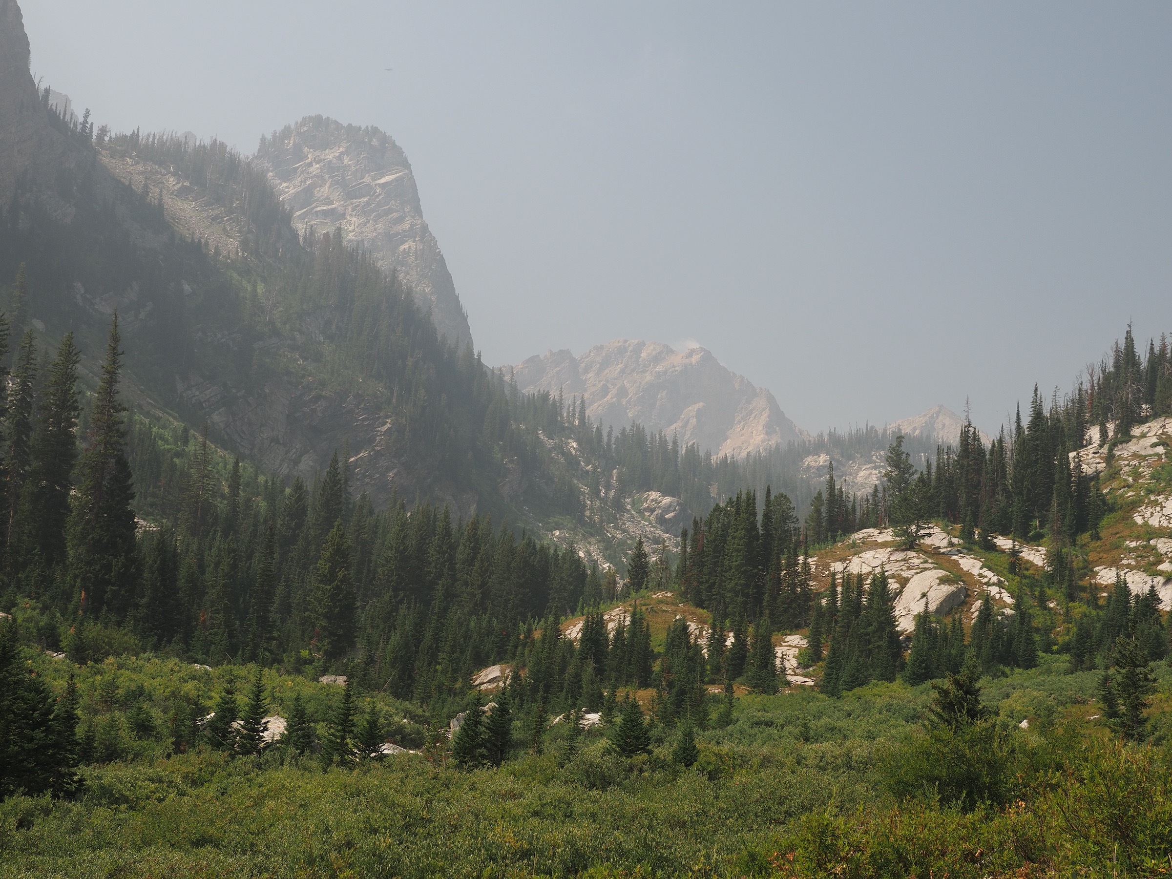 At the upper end of Death Canyon Shelf, it took some exploring to find a campsite that met our requirements for being off the trail and sheltered from both wind and lightning. Once set up, we relaxed for a bit and then headed to an overlook of the canyon for dinner. The ranger had shared that people often could see moose in the canyon below from the shelf, and so we took turns scanning through binoculars. It was not easy spotting, as smoke made everything somewhat blurry. Just as we were about to give up, we spotted two moose – far below, and about halfway back along the canyon. Once located, we could easily watch them graze through binoculars.