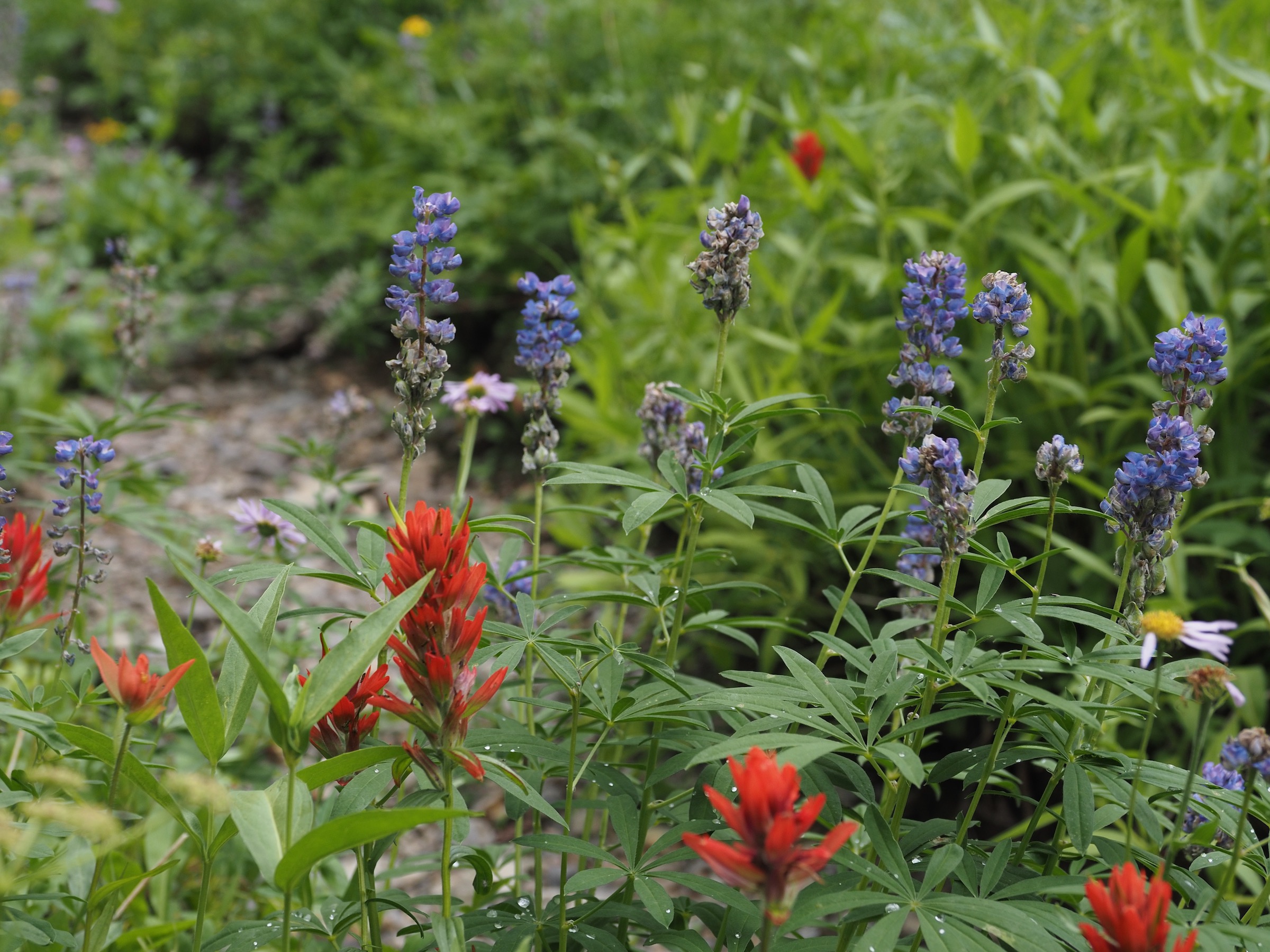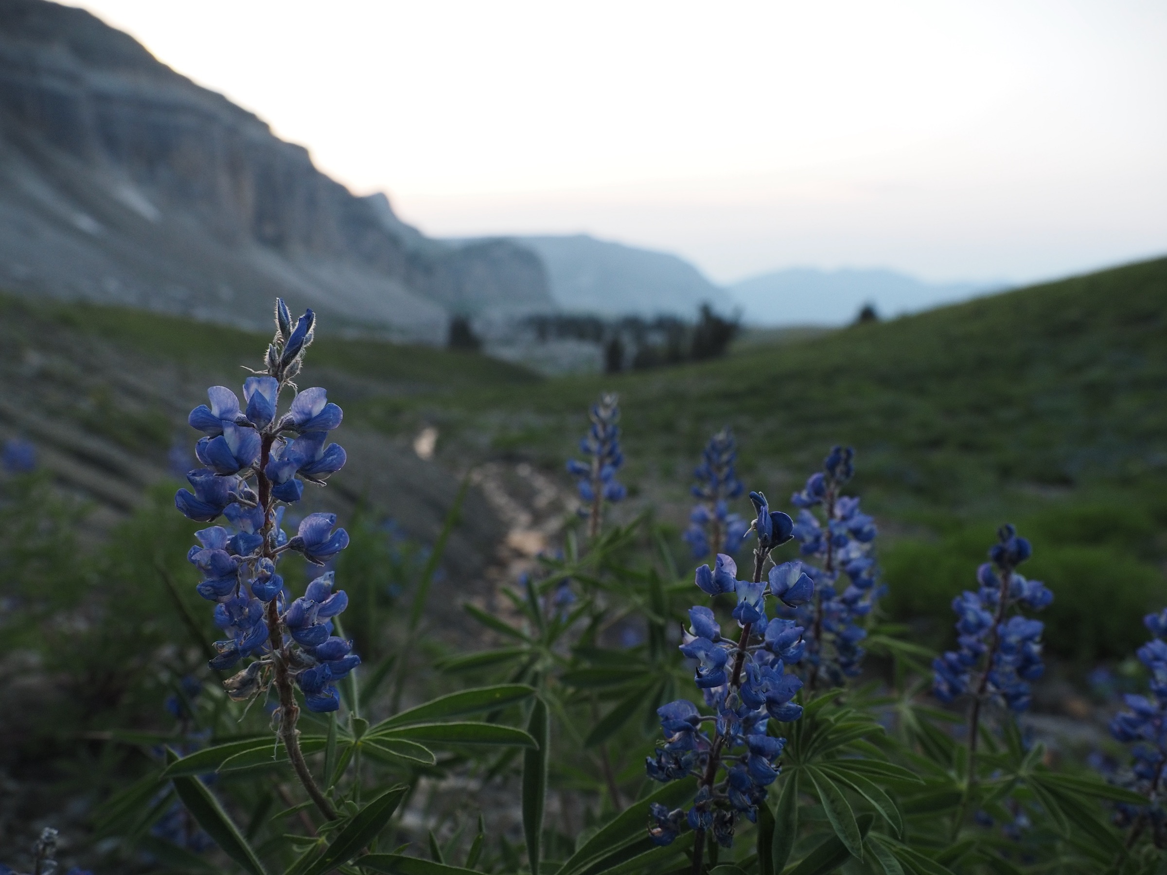 At Marion Lake–after 8.75mi and 4750′ of elevation gain–we set about selecting a campsite. The campsites are located east of the lake, across a lupine and castilleja-filled field, and tucked in among some trees. Going a bit further southeast led to a slope with views back down the canyon, and we could easily return to the lake.