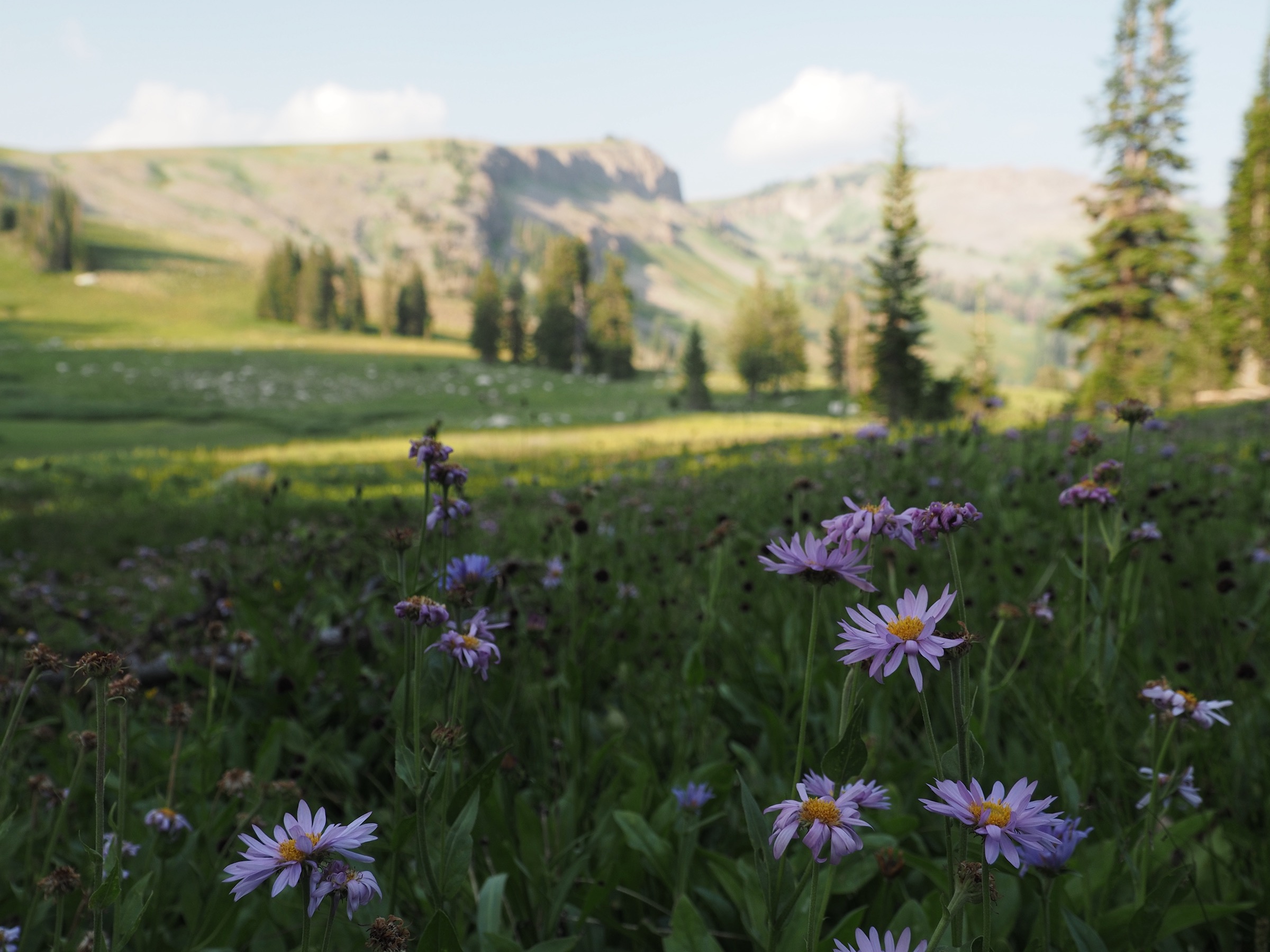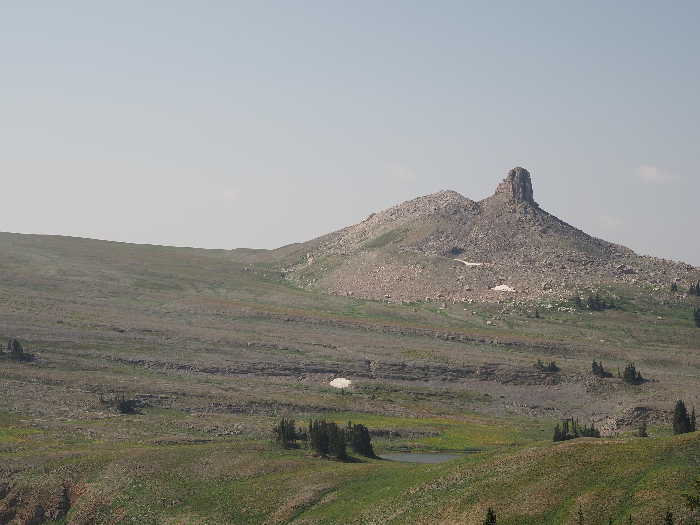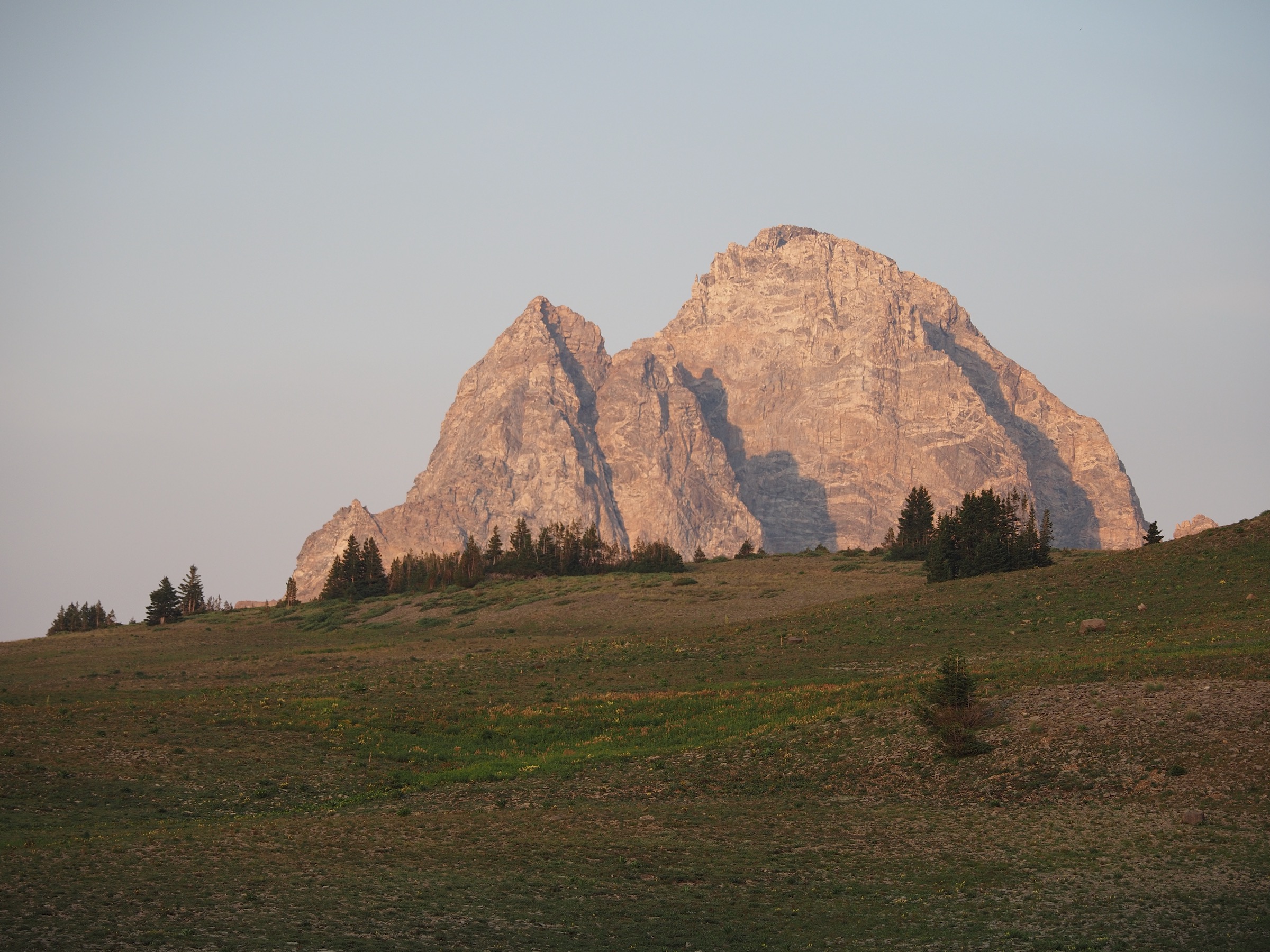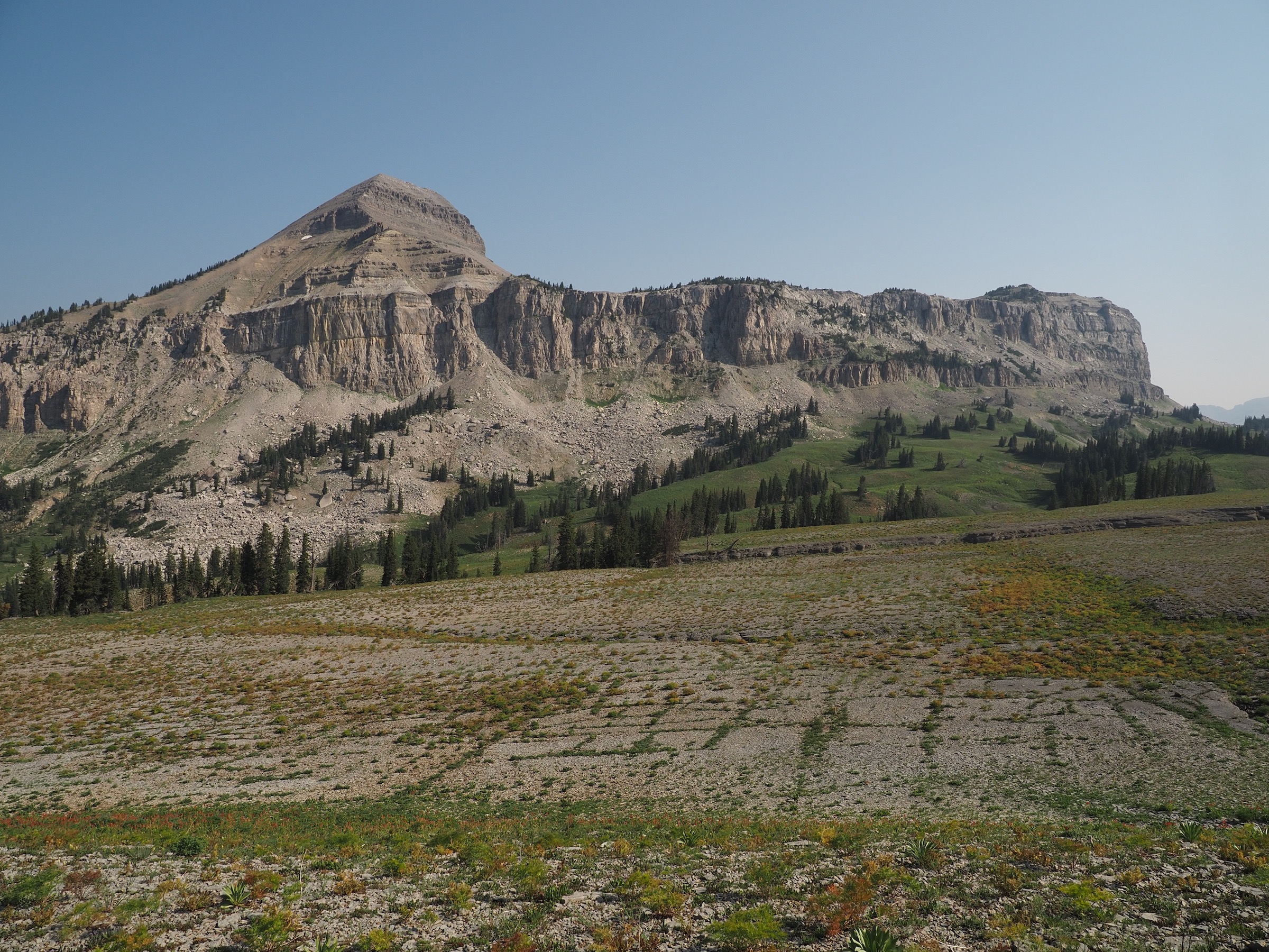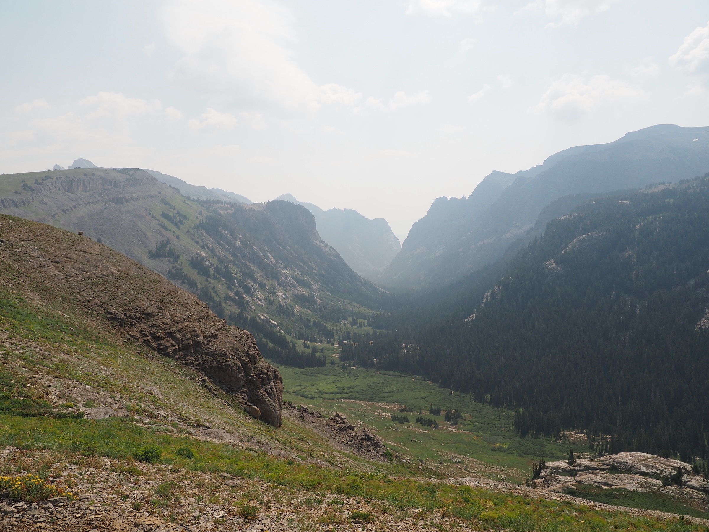 From Marion Lake, the Teton Crest Trail running north climbs briefly and then levels out. Here, we got our first views of the Tetons from the trail, though the peaks were mostly obscured by the smoke. The mostly level stretch took us along to Fox Creek Pass, but we were in no hurry. The mountains closer in featured many layers and the landscape was dotted with flowers. There were also several areas where the rock slabs had allowed grass to grow through in an almost-grid-shape.