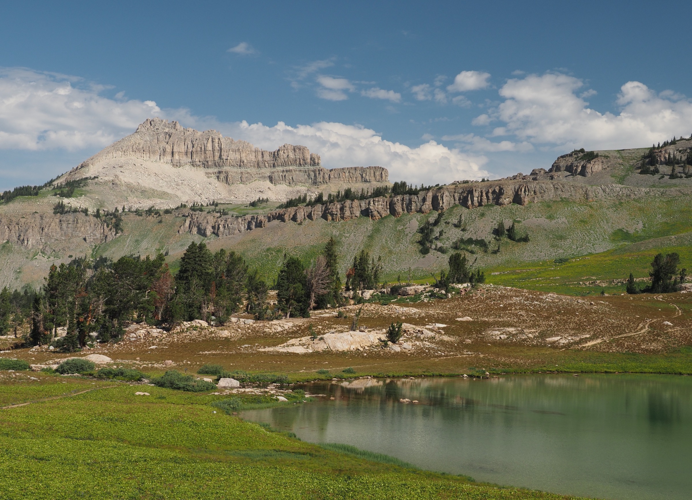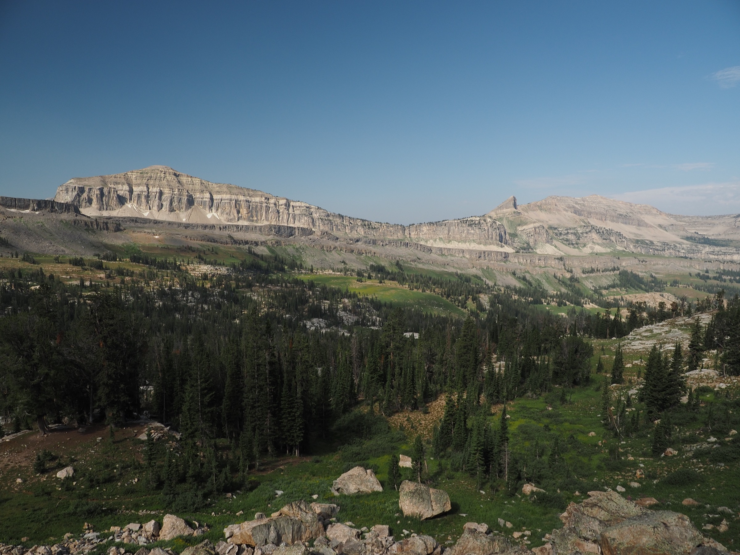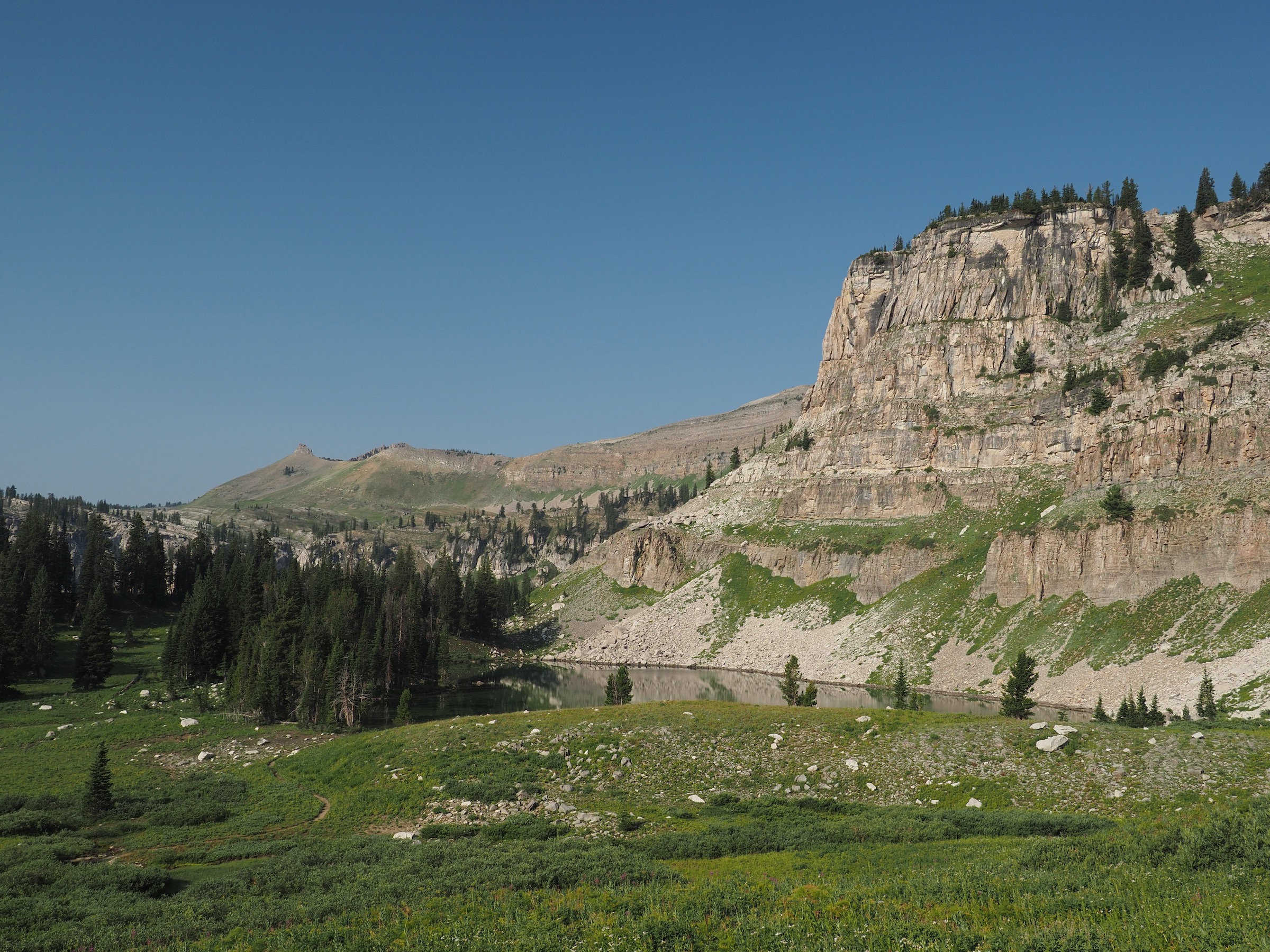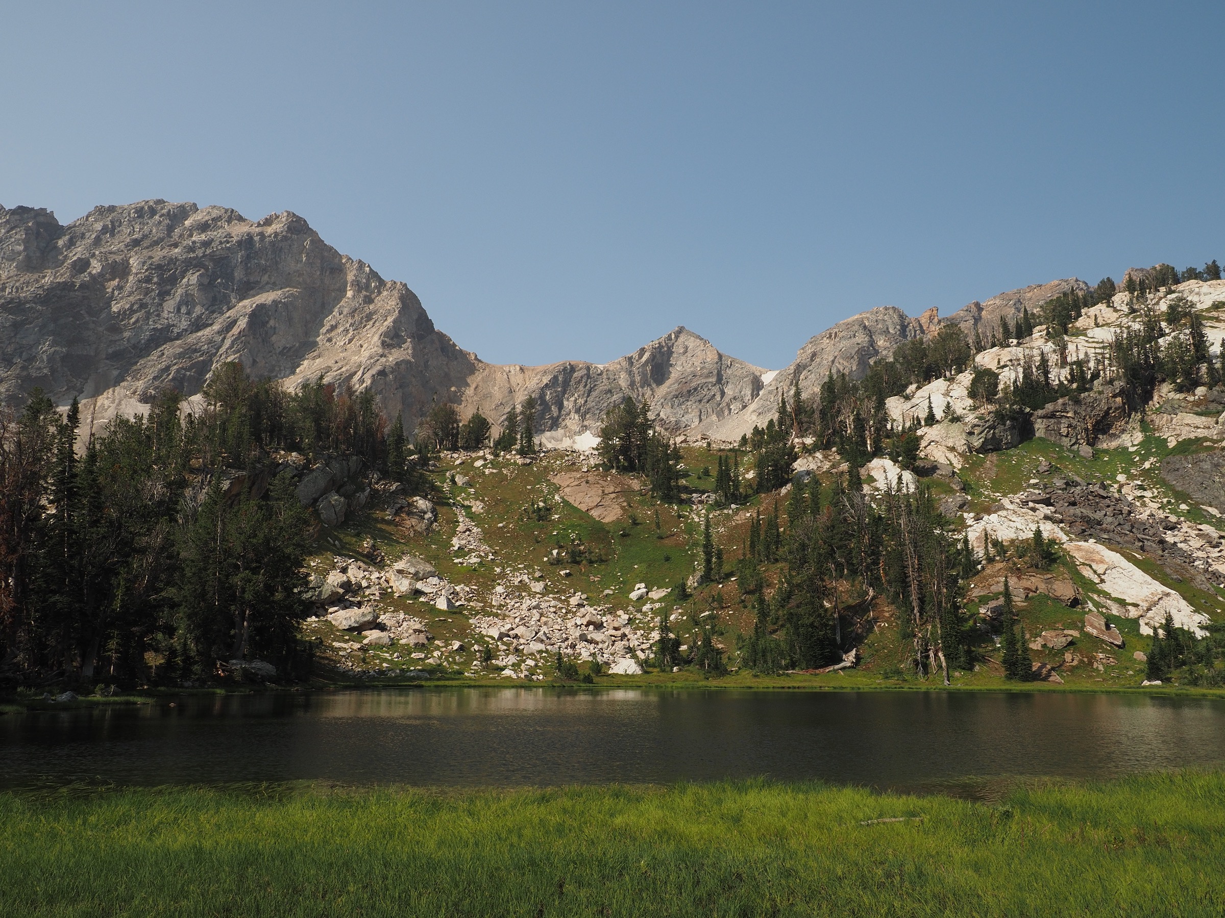 From the pass, the trail undulated for a bit before descending steeply into Alaska Basin. This basin is outside the national park, in the national forest, and consequently it is is a favorite destination for those who do not luck out with permits or who need a stopping point between two permitted hikes.