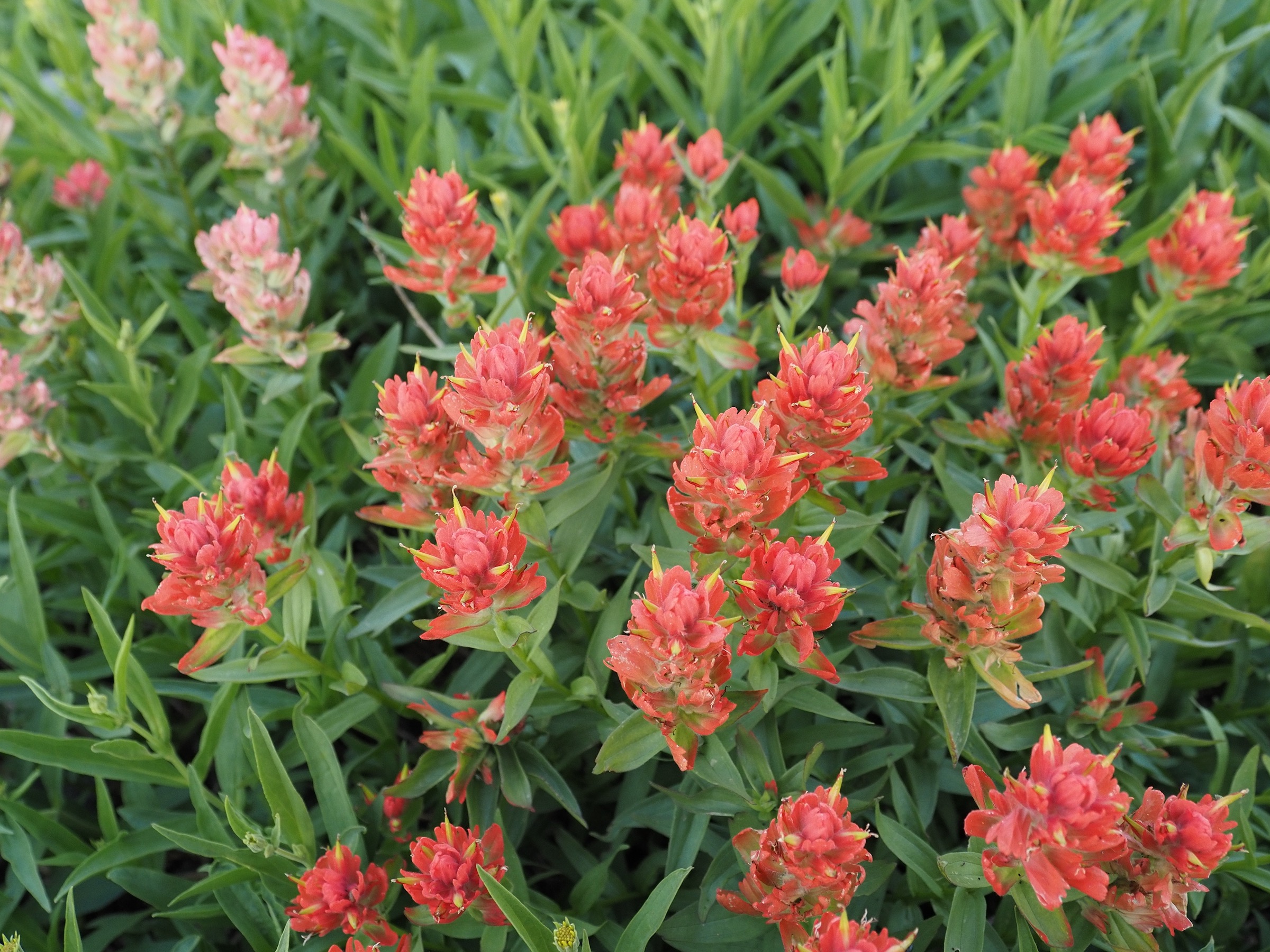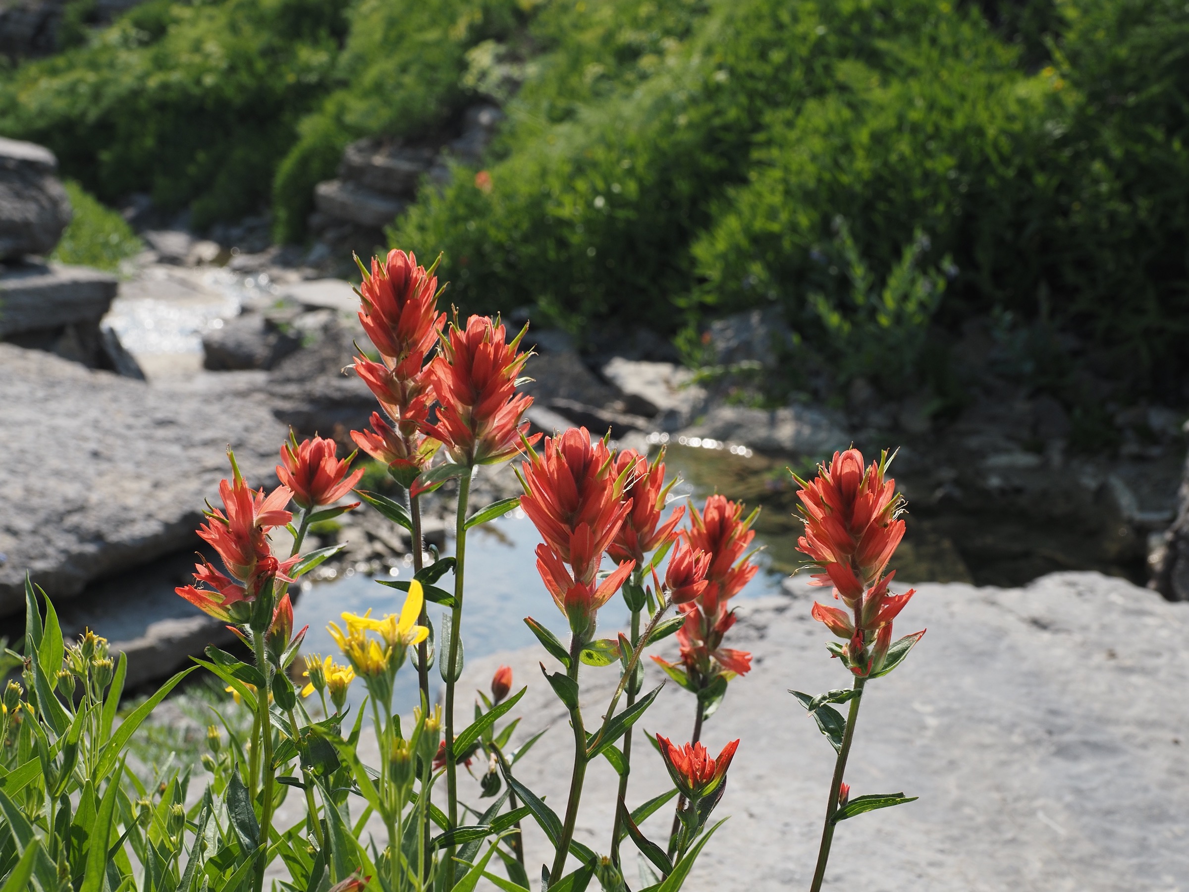 The trail then took us past blue Sunset Lake and fields thick with Lewis’s Monkeyflower and castilleja. We continued climbing, enjoying excellent views of Battleship Mountain.