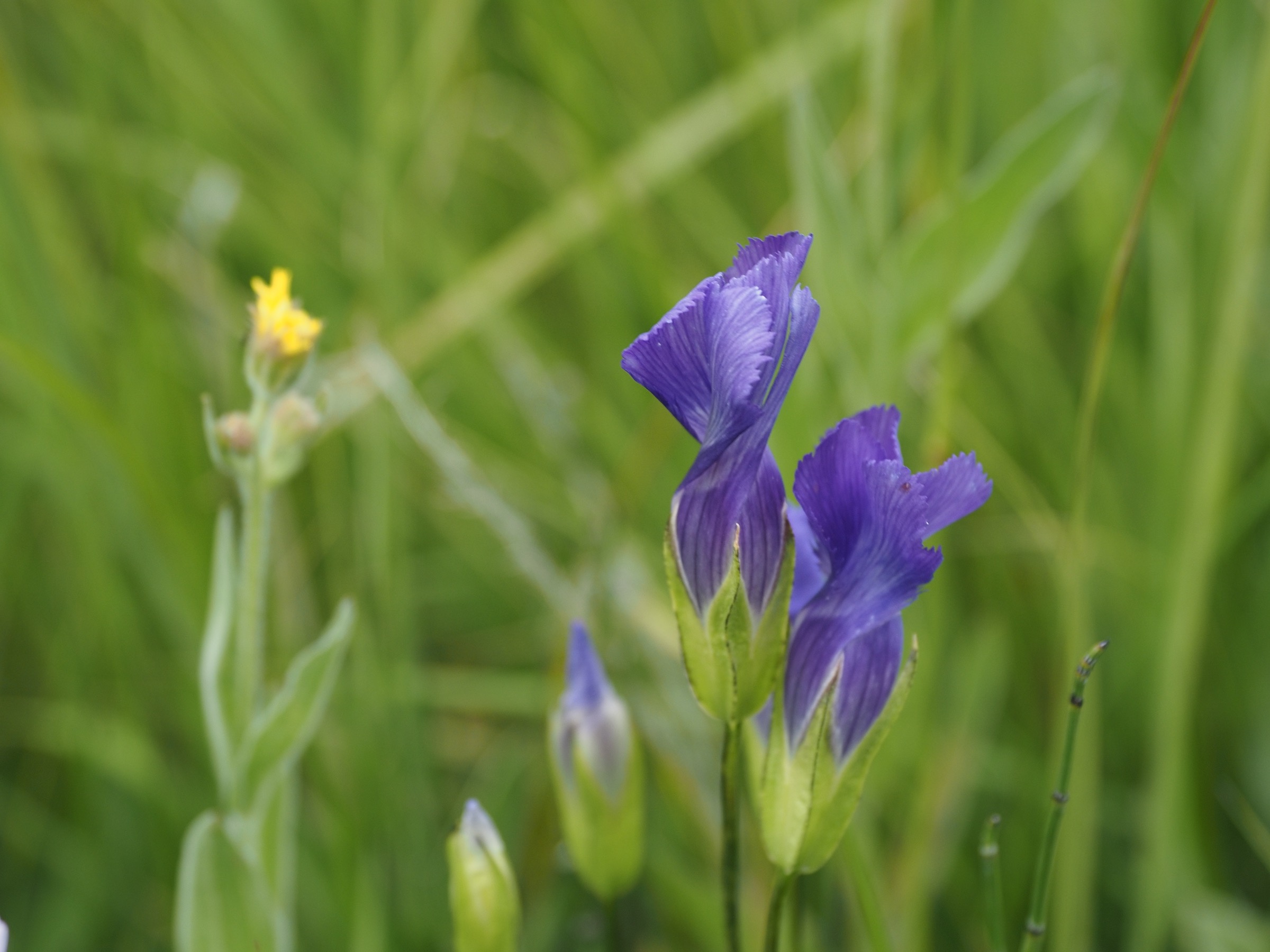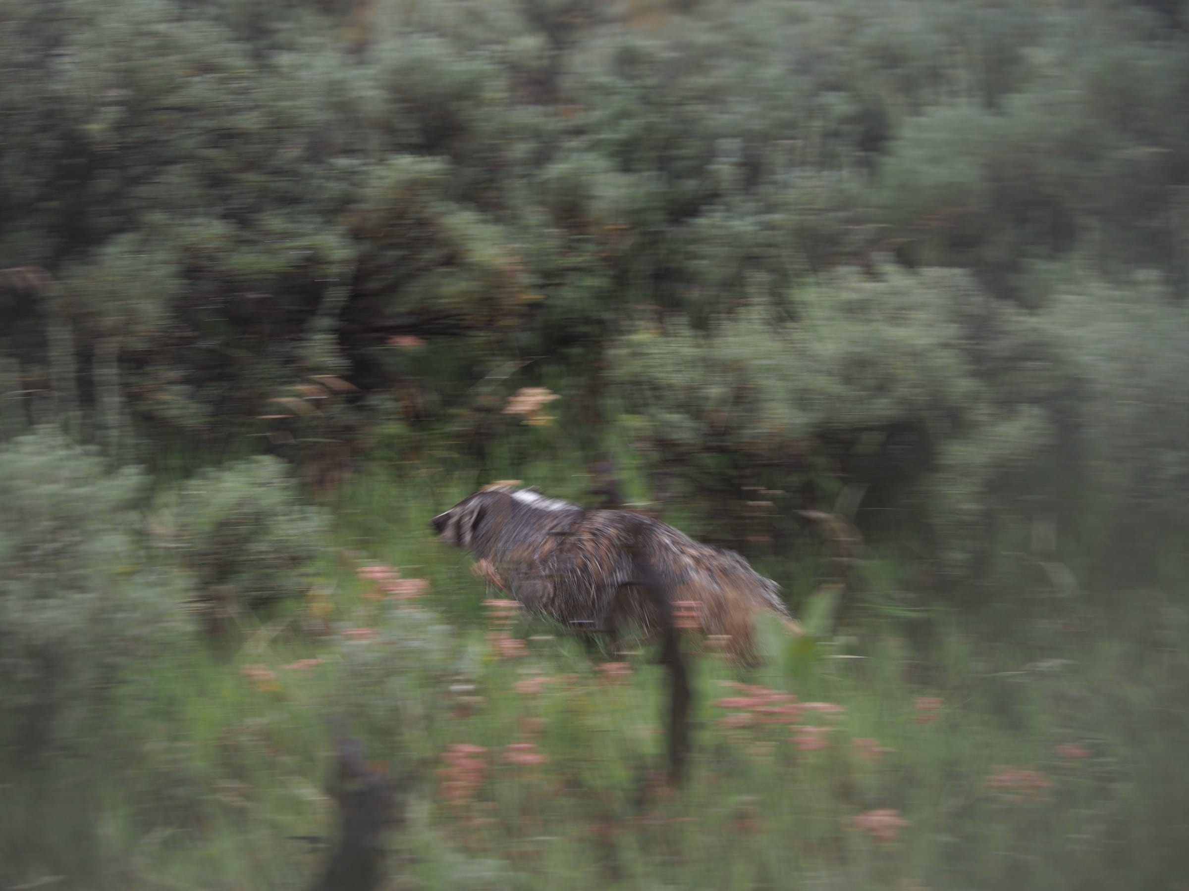 We reached the pass before the rain and had just enough time to notice how, on this side, the red of castilleja dominated the meadows. Then, a solid wall of water hit us.