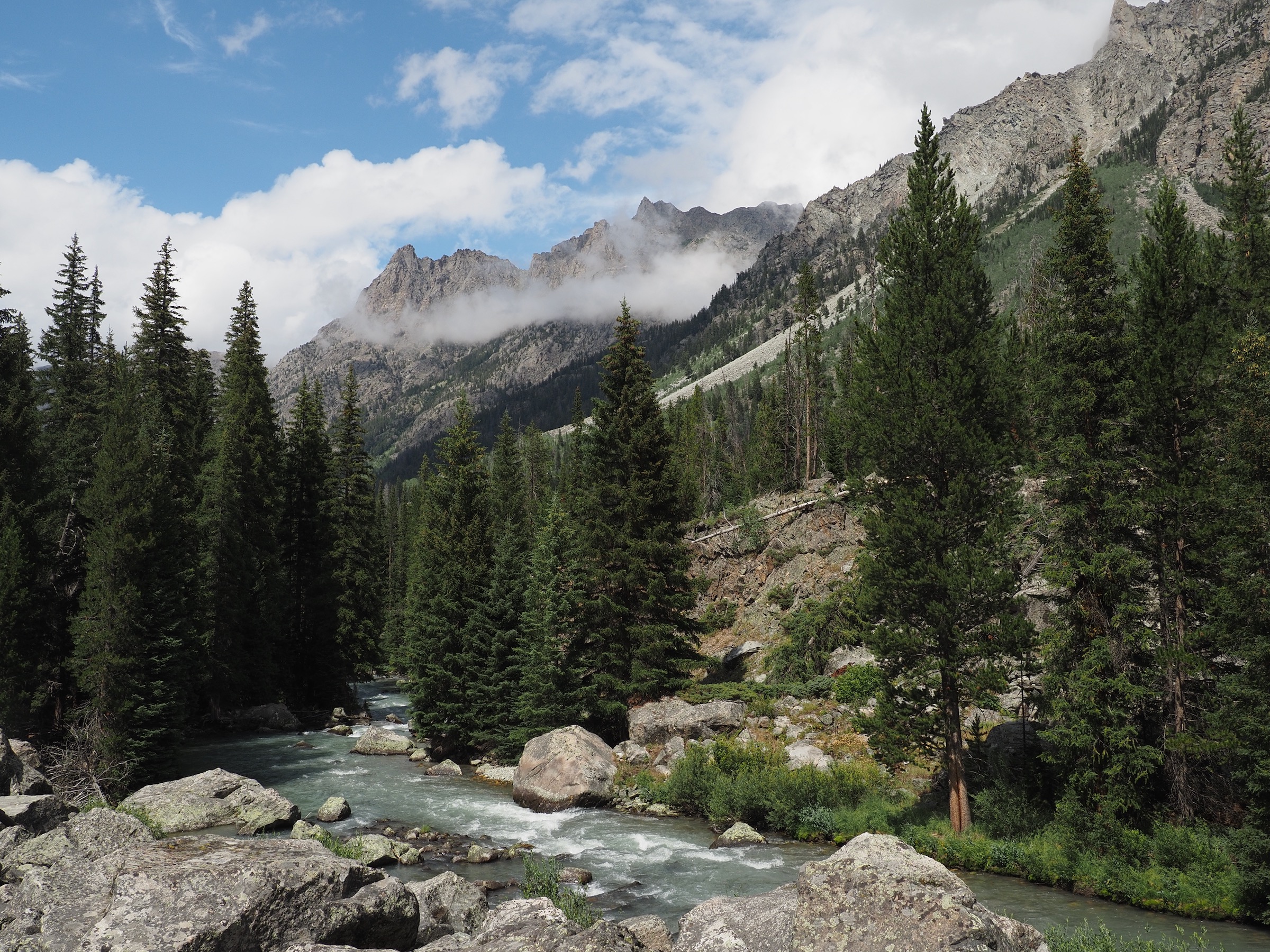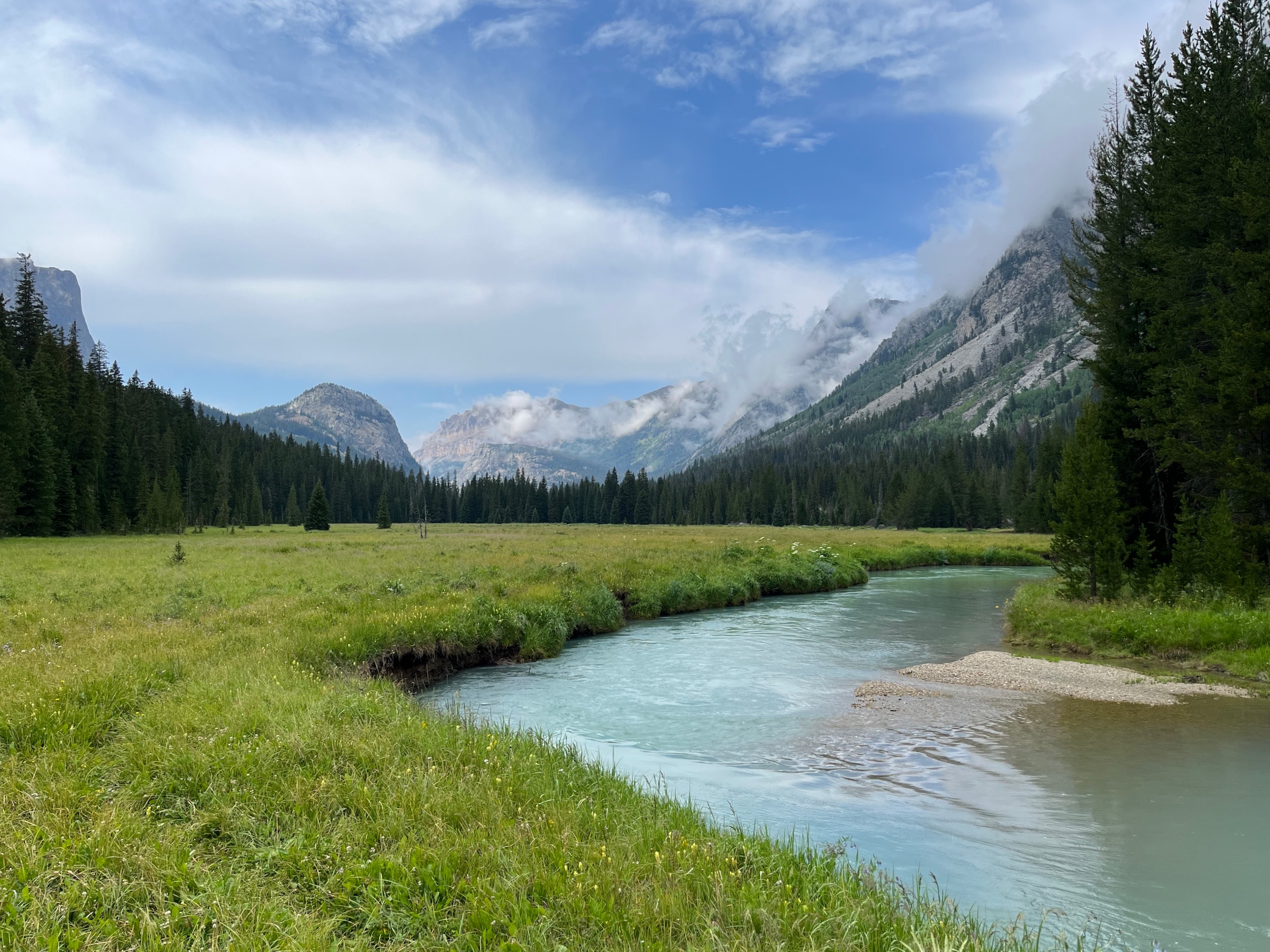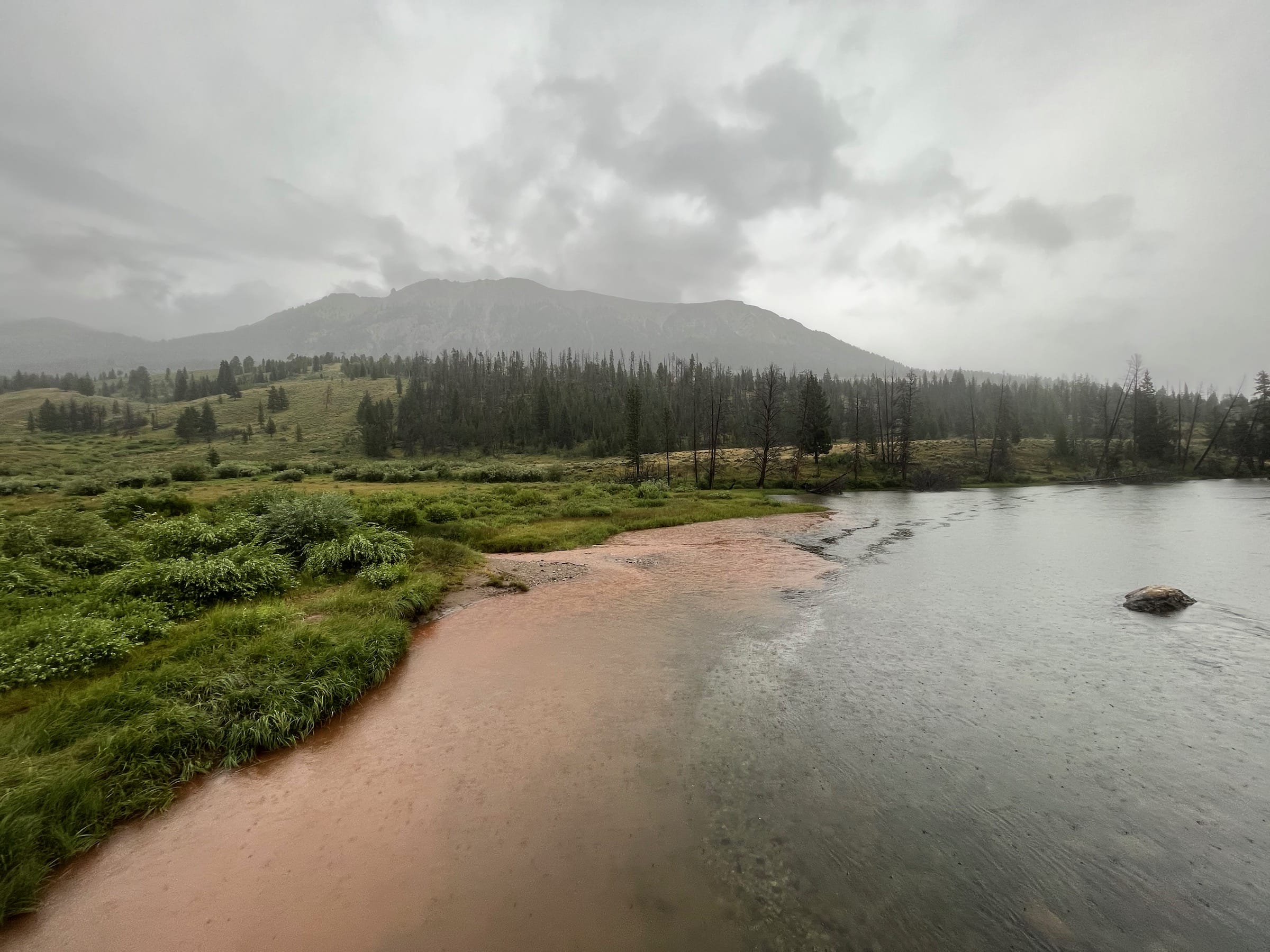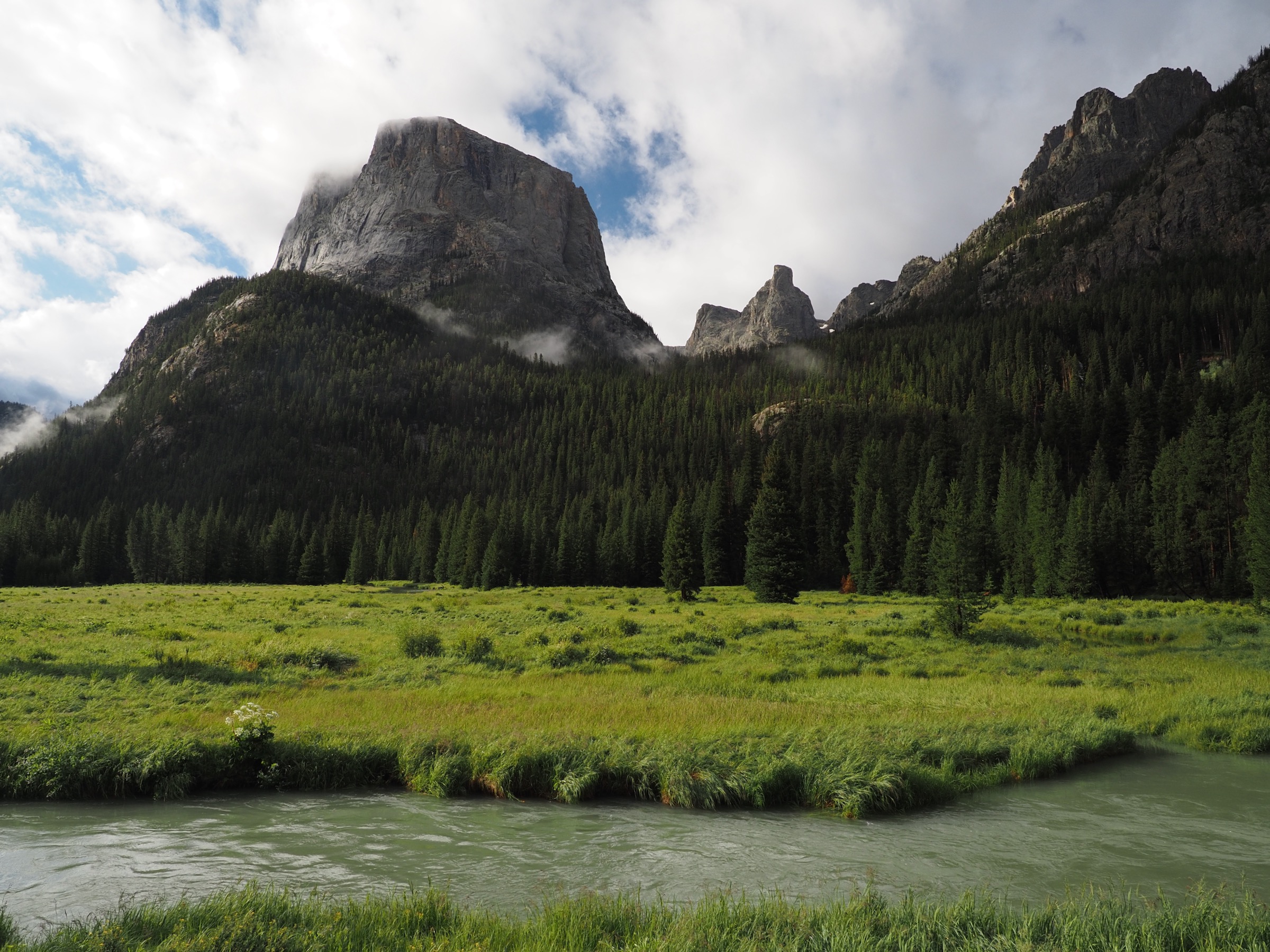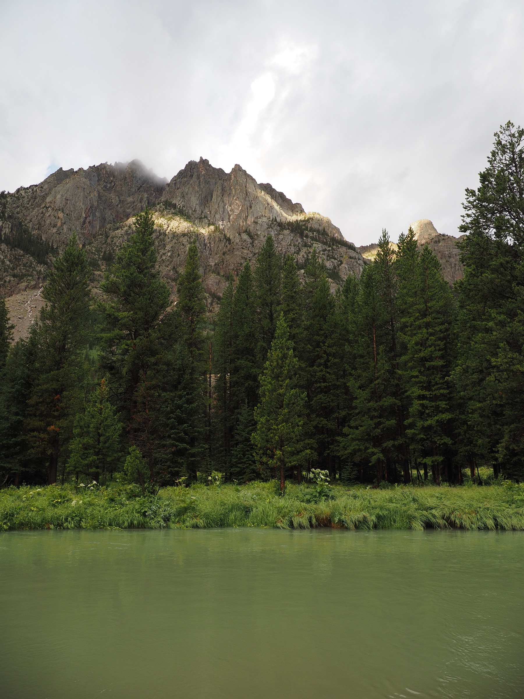 There were several more storms, with thunder, lightning, and downpour overnight, so we did not get the best sleep. However, as with the previous day, the morning was dryer. The meadow and river glowed green under a partly cloudy sky. From the forecast, we did not expect that to last.