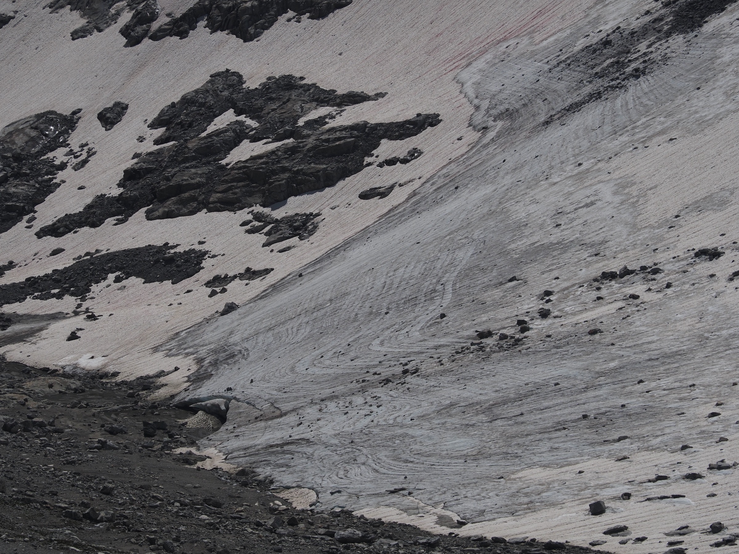 Around 11,600′, the way grew steeper. Here, the trail devolved into a set of intersecting and diverging paths, each marked by their own intermittent set of cairns. We ascended the route that looked best to us. The going was slow, and some of the rock and soil was loose. Still, we found it less difficult than it had looked from below. We reached Knapsack Col (12,280′) sooner than we expected.