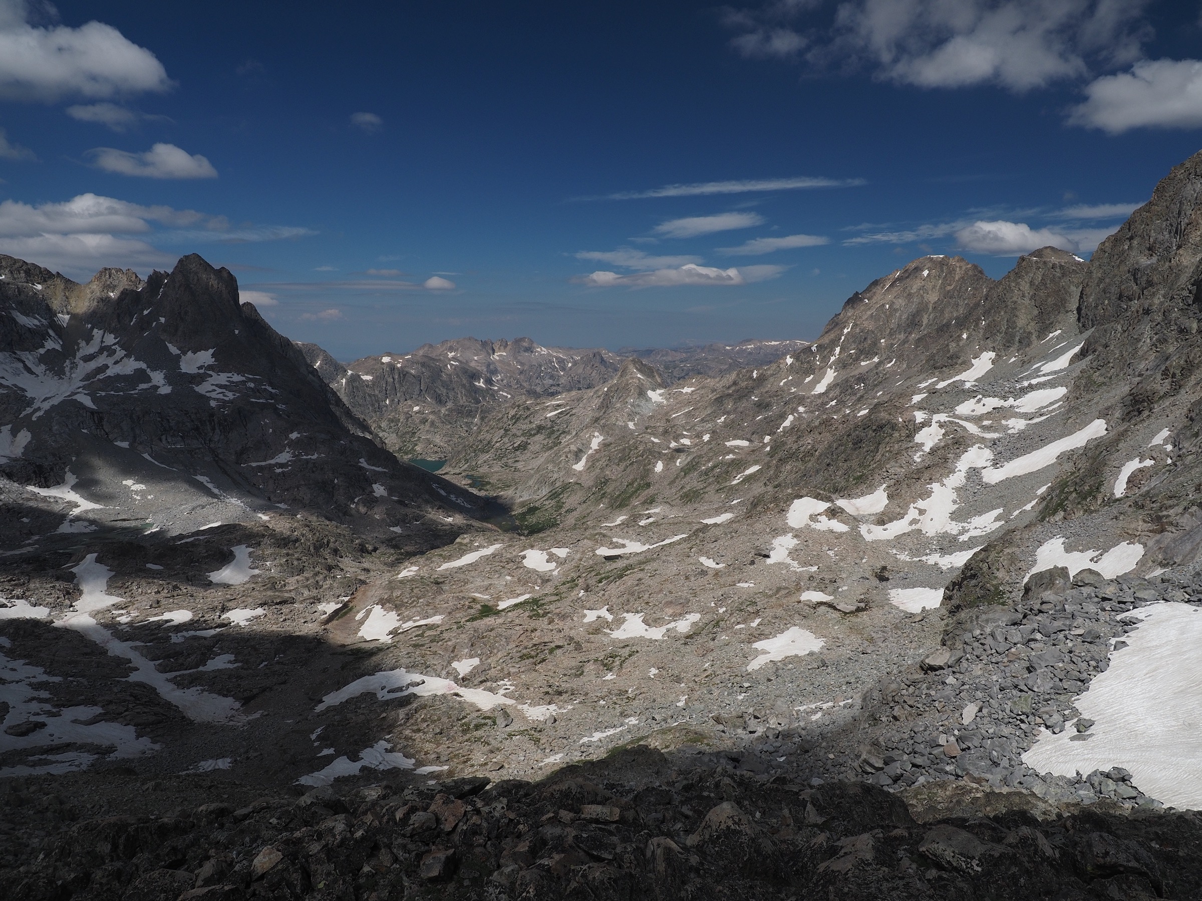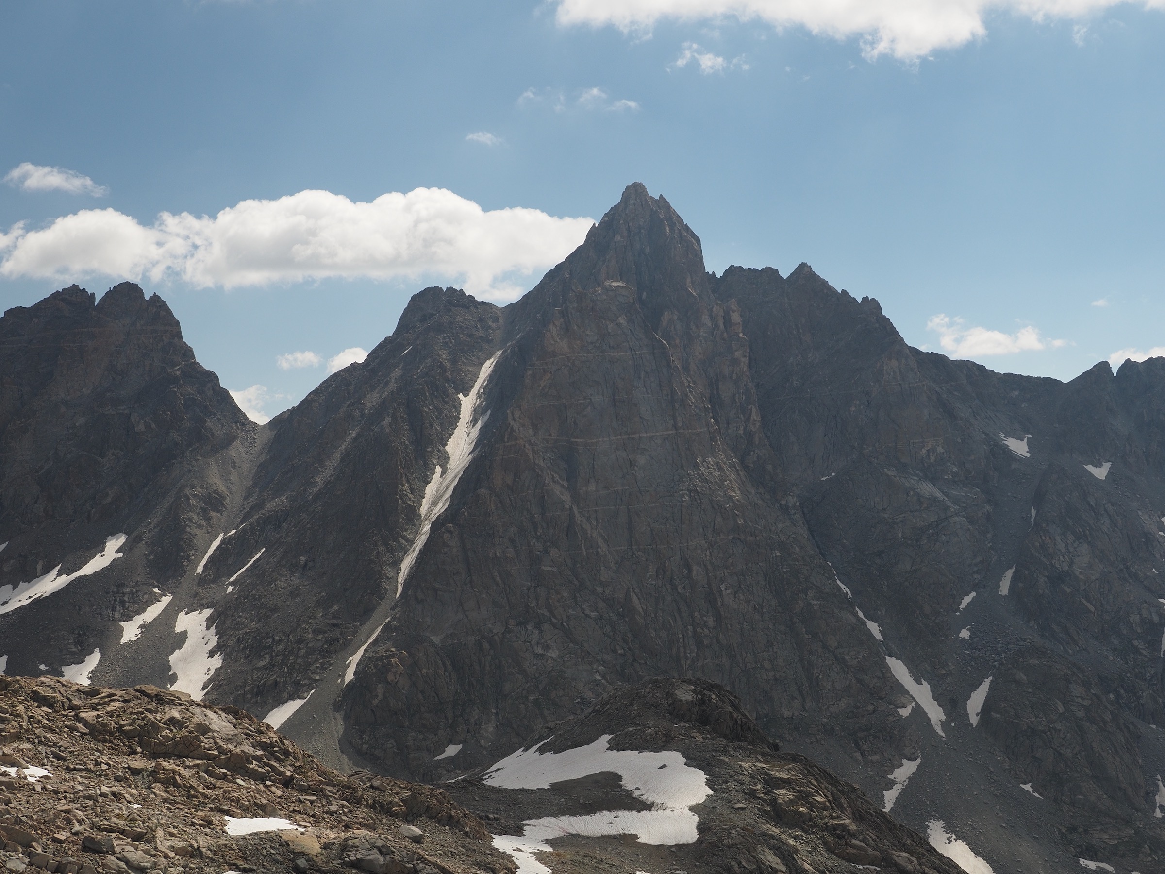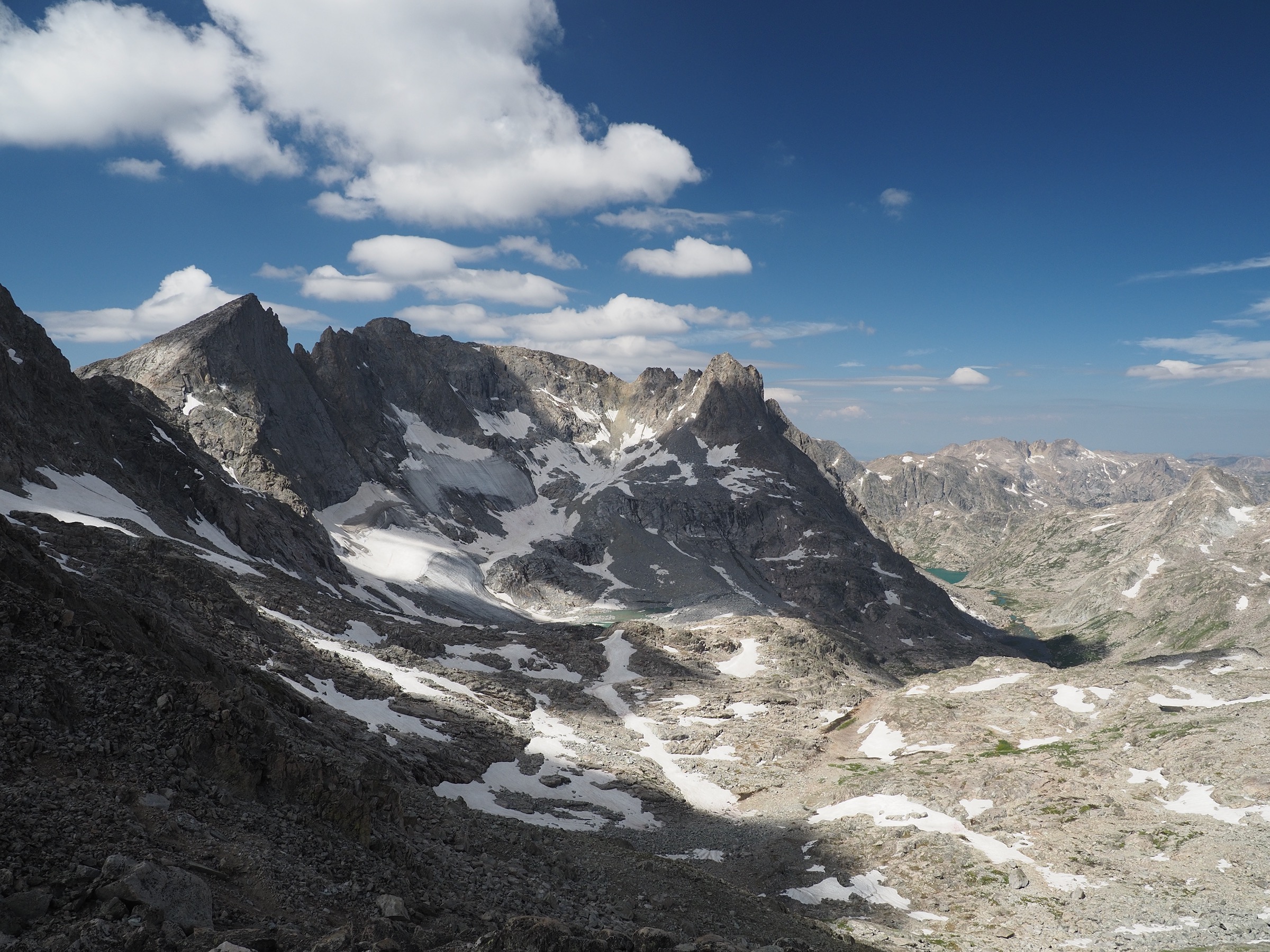 From the col, we could see across the basin through which we had just passed and back to Peak Lake. We could also view into Titcomb Basin, though its lakes were largely obscured by its terrain. The wind was calm, which meant we could settle in and take our time to enjoy the view. We looked at each peak in turn, and then looked at them again.