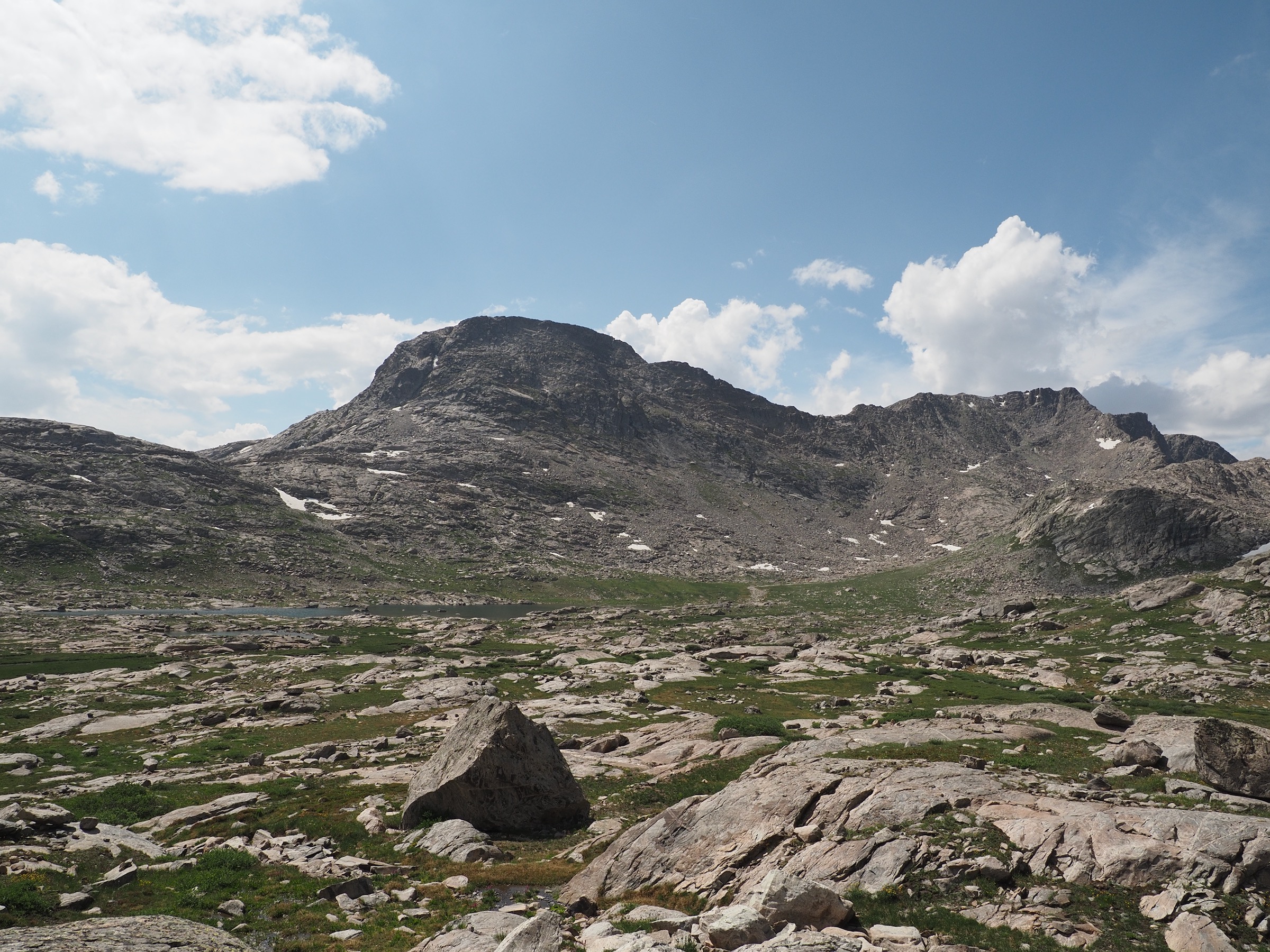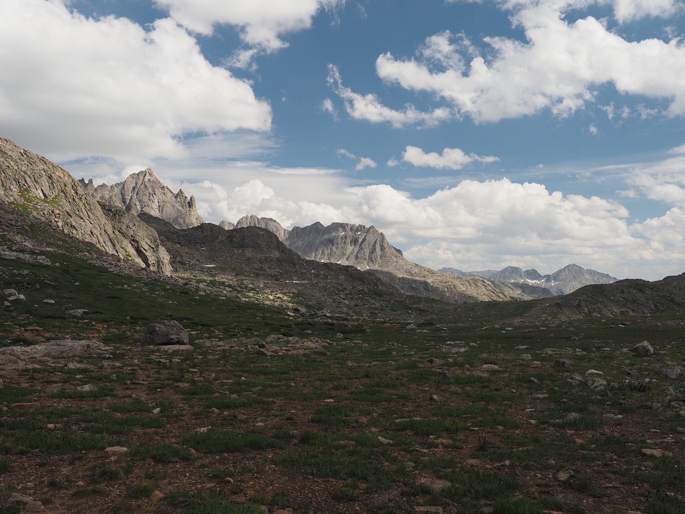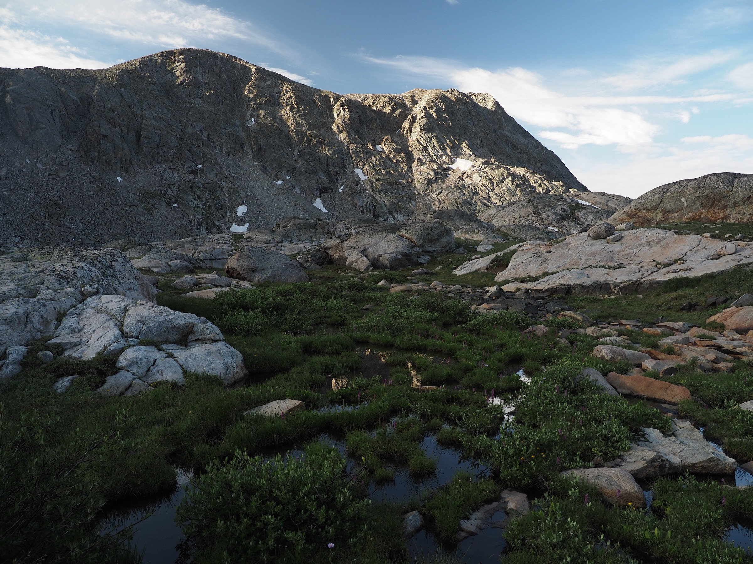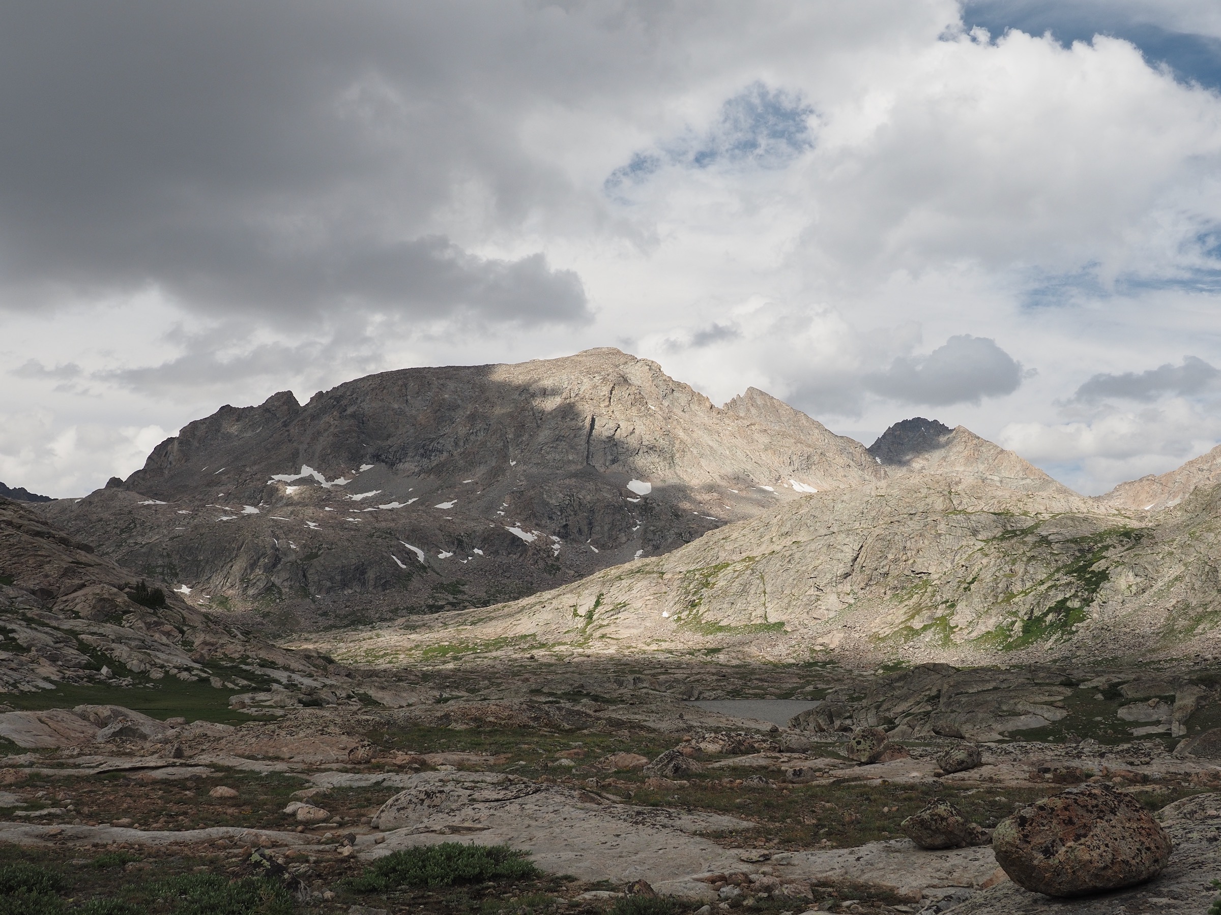 To reach the col, we crossed Peak Lake’s outlet on stones. A use trail, or unmaintained trail–it seemed too built to be just a boot path–skirted the northwest shore of the lake. On the other side of the lake, it emerged in a basin: the source of the Green River.