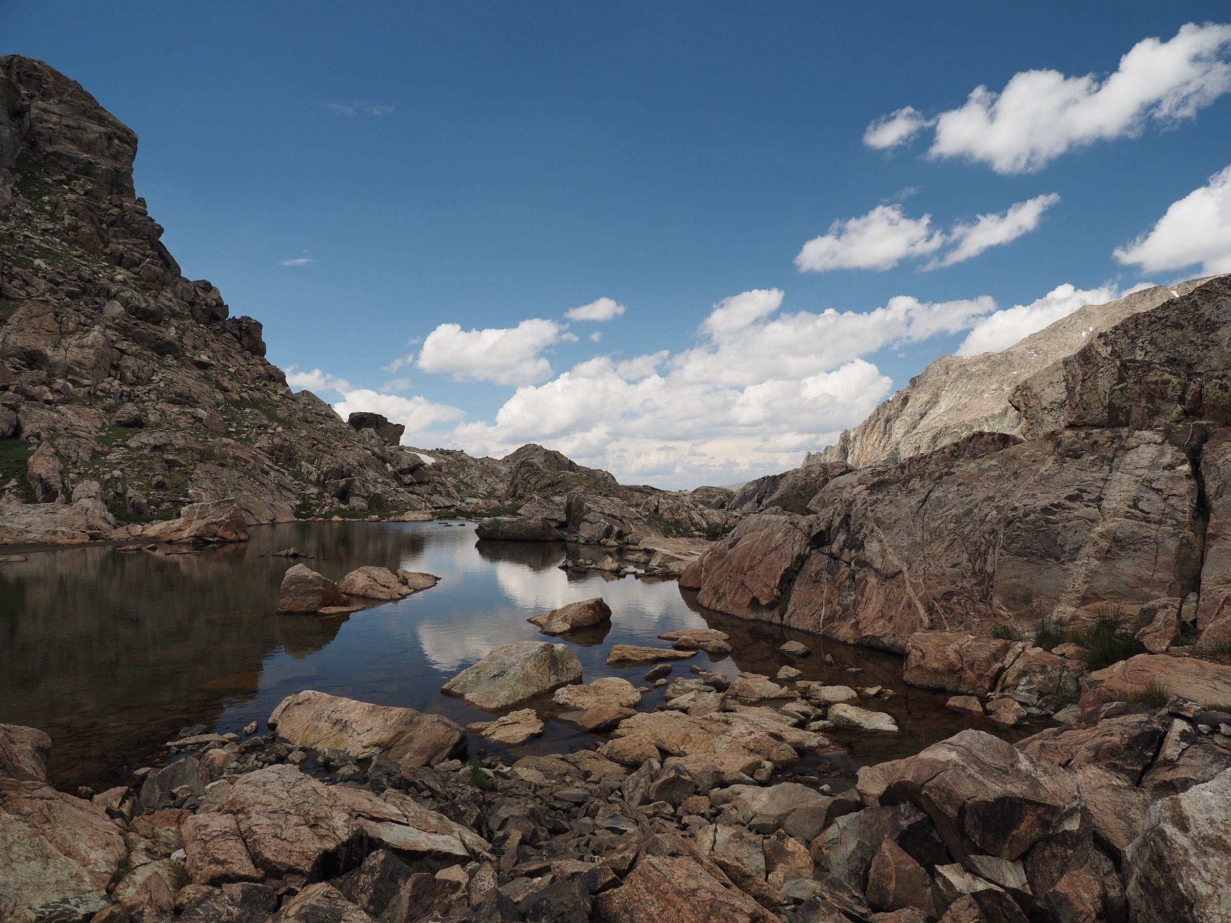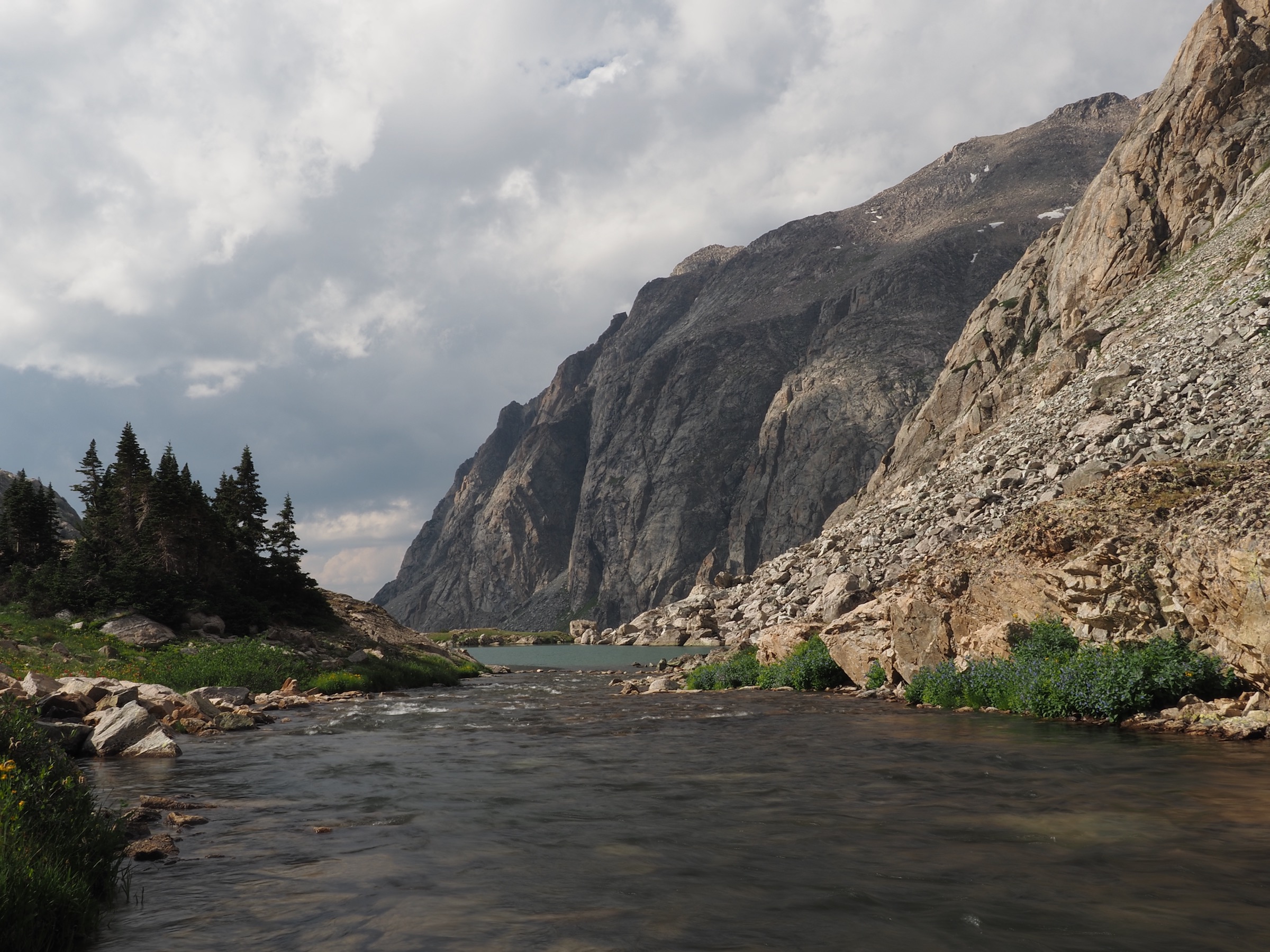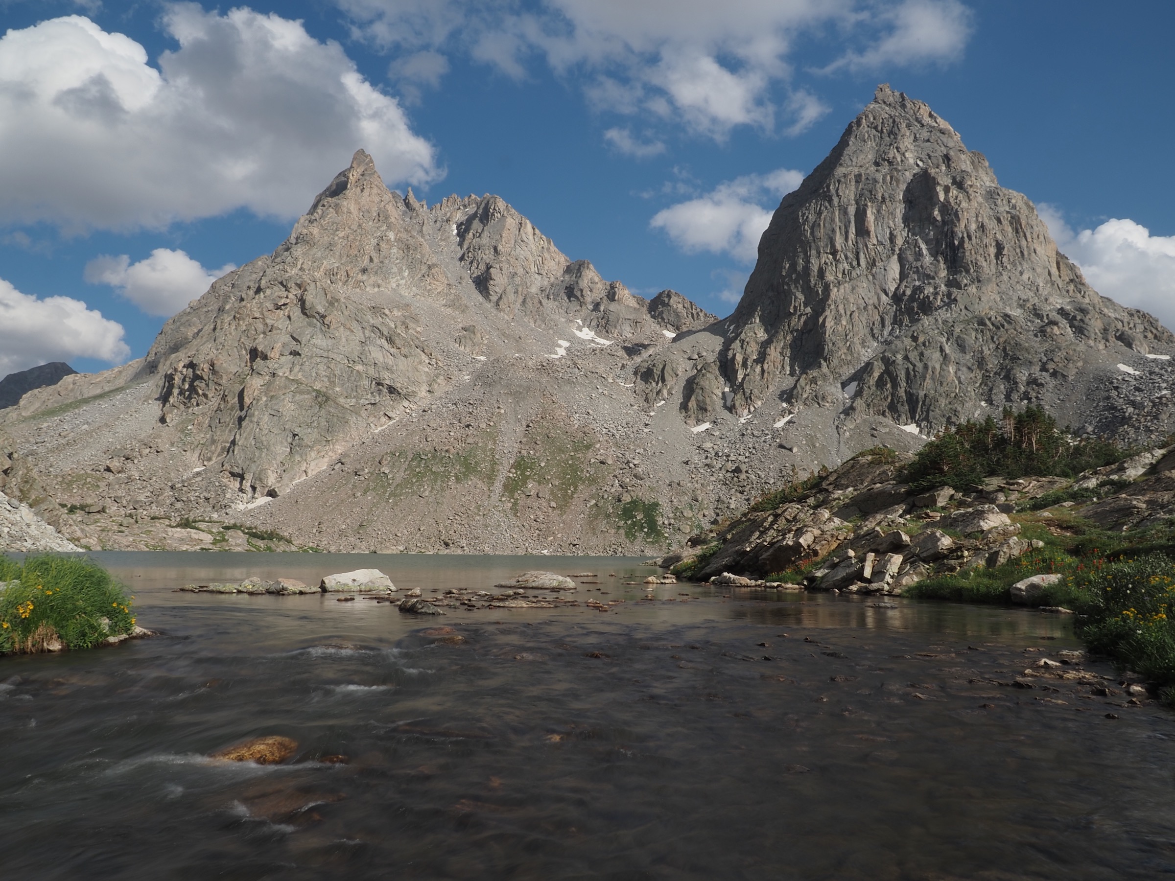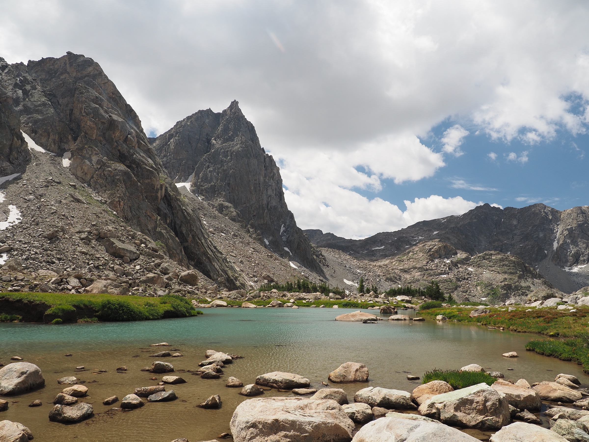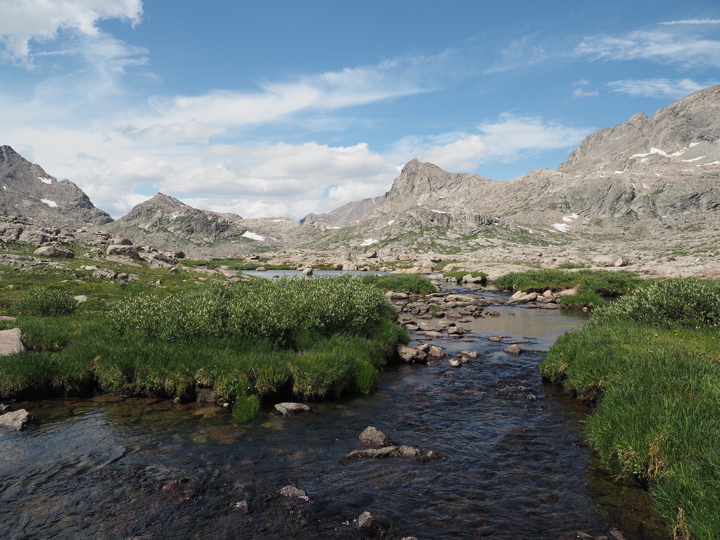 To reach the col, we crossed Peak Lake’s outlet on stones. A use trail, or unmaintained trail–it seemed too built to be just a boot path–skirted the northwest shore of the lake. On the other side of the lake, it emerged in a basin: the source of the Green River.