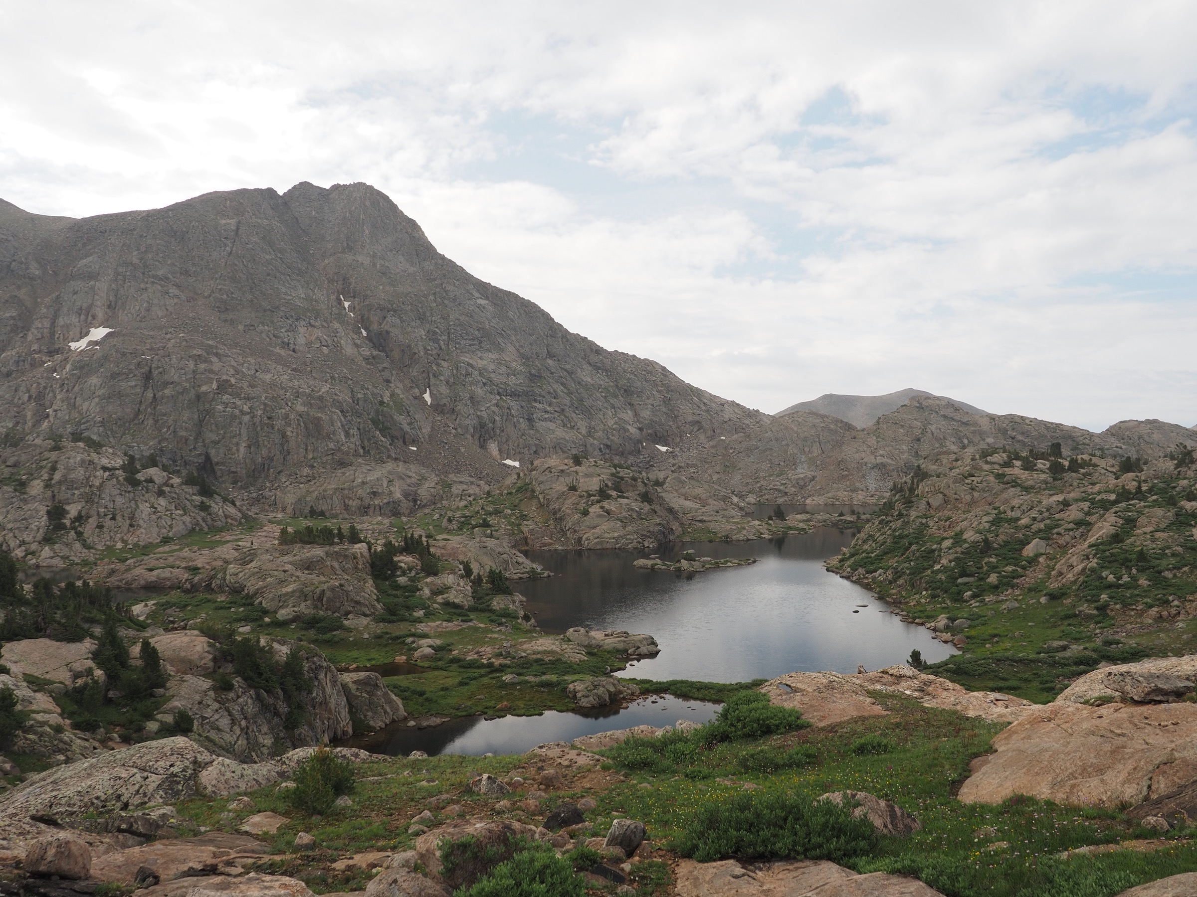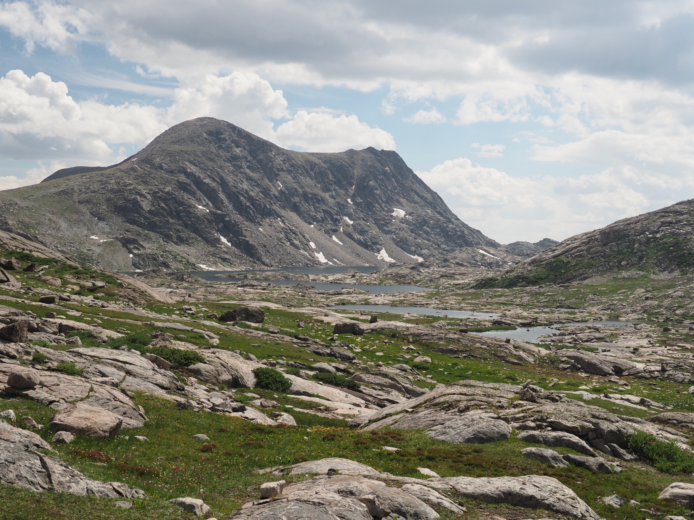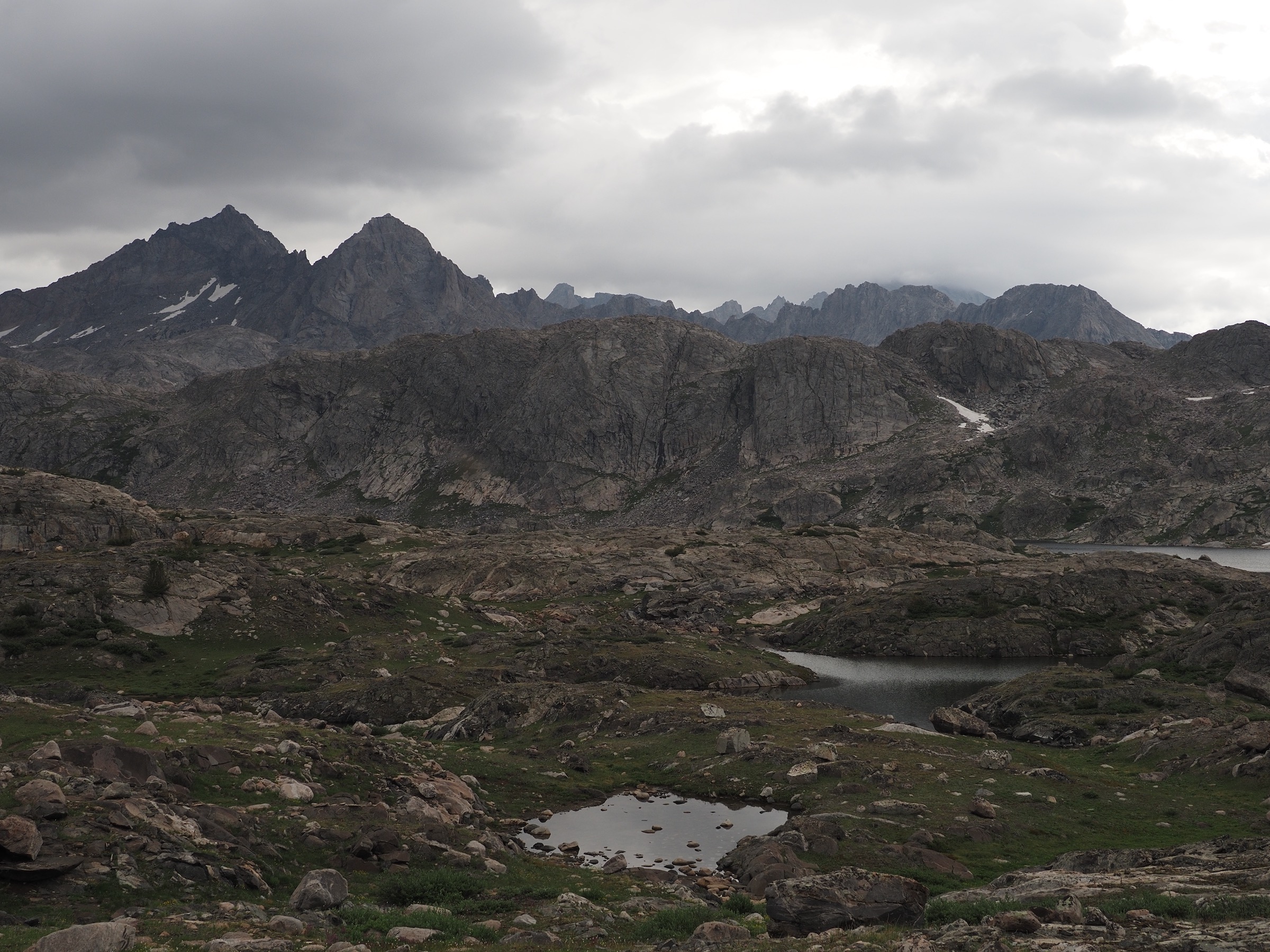 From there, we descended, ascended, and descended. Along the way, we passed Twin Lakes, Pass Lake, and several more unnamed lakes and tarns. To mirror our ascents and descents, the sky clouded over, cleared, and clouded over again.