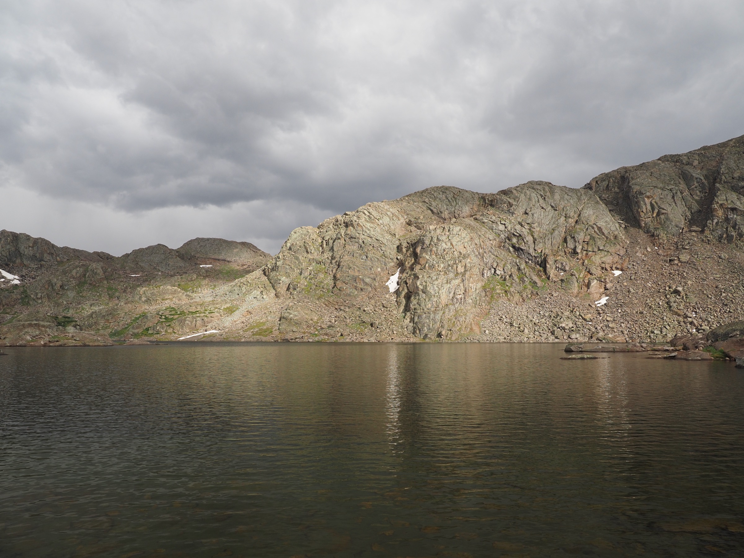 This broad landscape also offered little shelter. As you may have gleaned by now, I’m pretty cautious about exposure to thunderstorms, and so I wanted to seek out a reasonably sheltered spot. We turned off the trail about halfway along the lake. There, two peninsulas looked like they might hold good spots between rocky outcrops. After 15 minutes of exploring under increasingly threatening skies, though, we concluded that all spots were either: (a) actually tarns, (b) recent tarns and thus muddy, (c) boggy, or (d) fragile meadows.