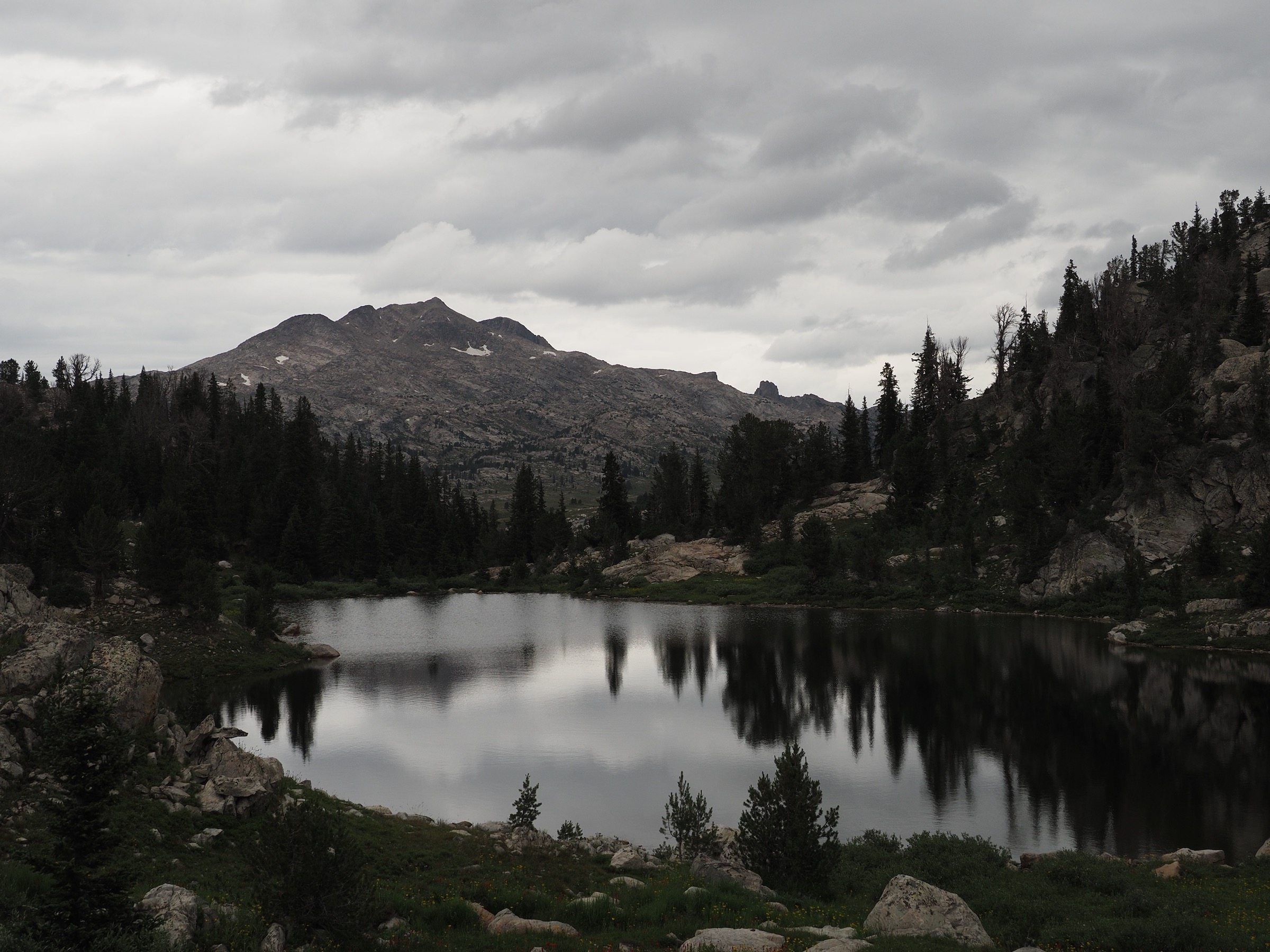 At the lower end of Upper Green River Lake, we again stopped for the view back up to Square Top. Then, near the junction of the Highline and Lakeside trails, we met two trail runners. They had slept in a campervan at the trailhead the night before, and asked what it was like to be out in a tent for the storms. They also warned us that the forecast for the day was also quite bad.