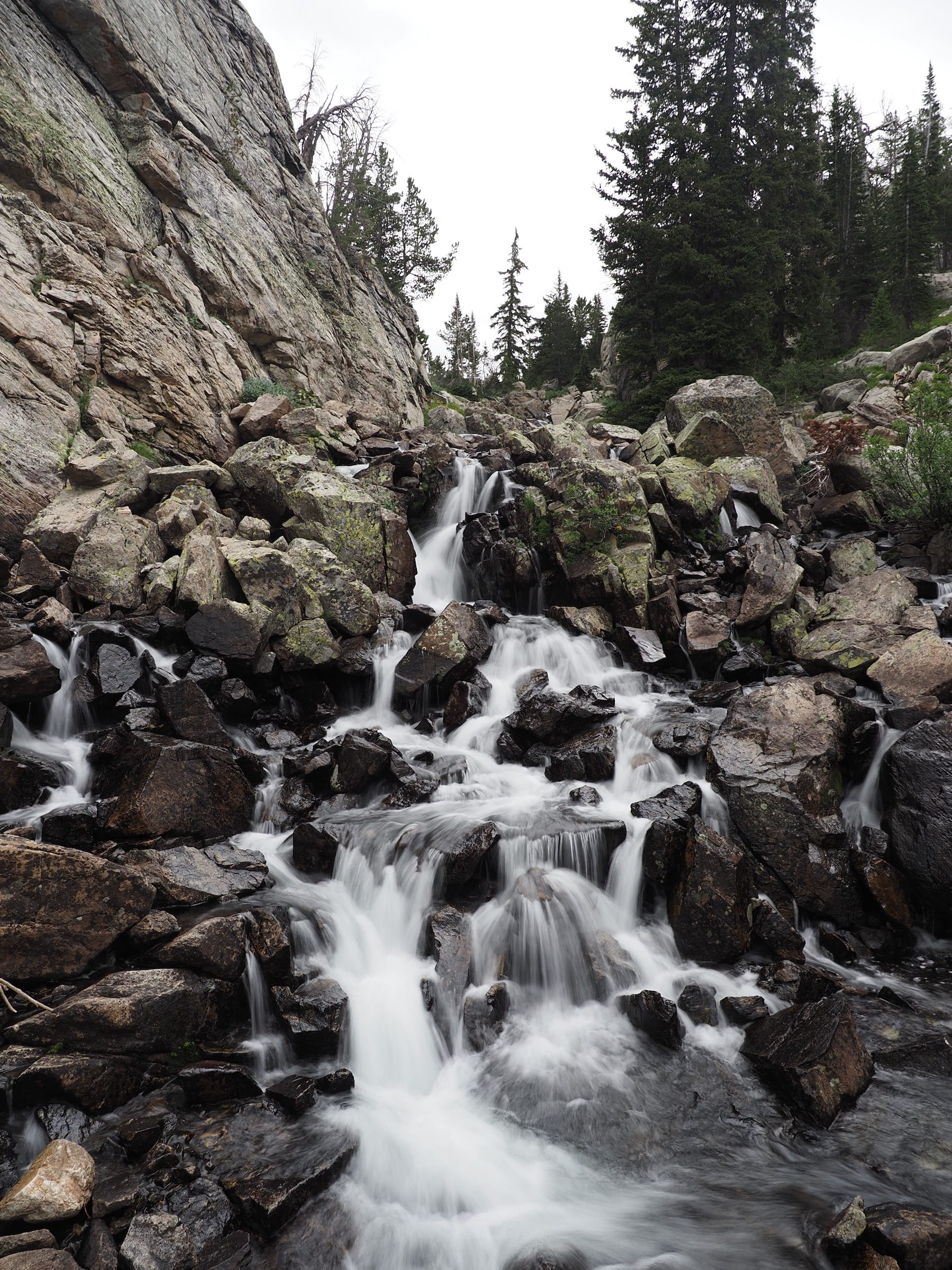 After setting up camp, we decided to hike down to Stonehammer Lake, which looked to be about a half mile away and maybe 300′ below us. When we got a little past Peak Lake’s outlet, though, we decided we preferred the view down to Stonehammer Lake from there. We sat down on boulders next to a cascade to enjoy the view and read.