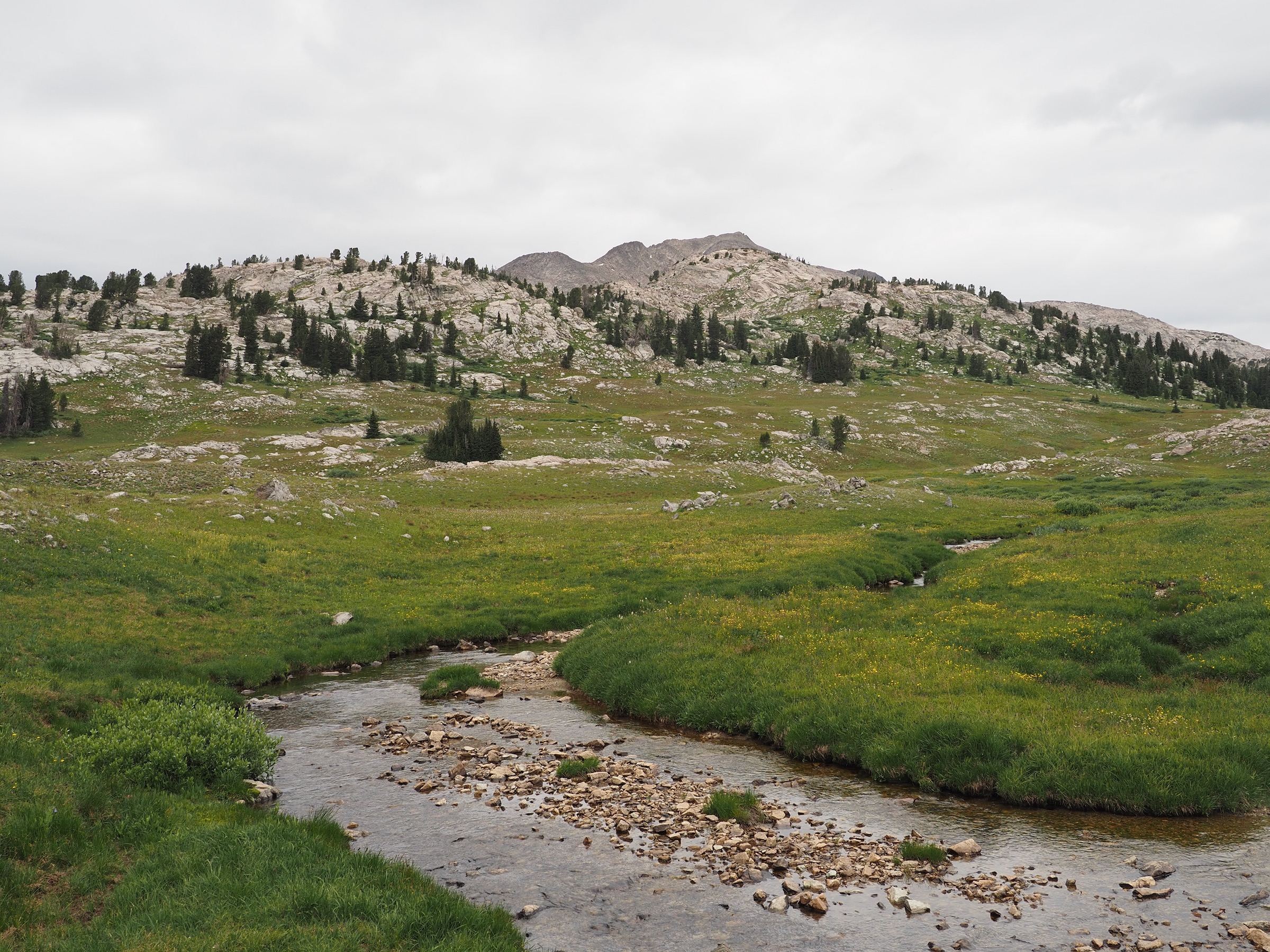 We took our time with breakfast and packing up. This gave time for the sun to reach and dry out our tent. It also gave me time to walk along the Green River through the meadow more, checking out each bend in its course. By the time we left camp, my explorations had thoroughly soaked my pants in the wet meadow grasses.